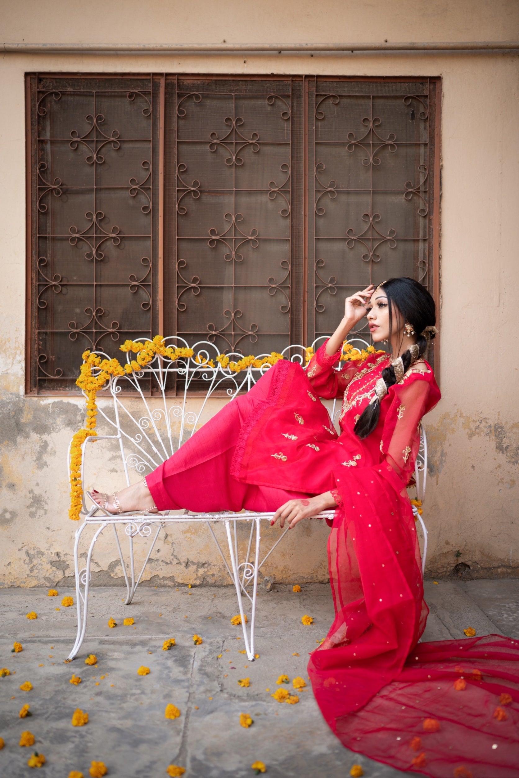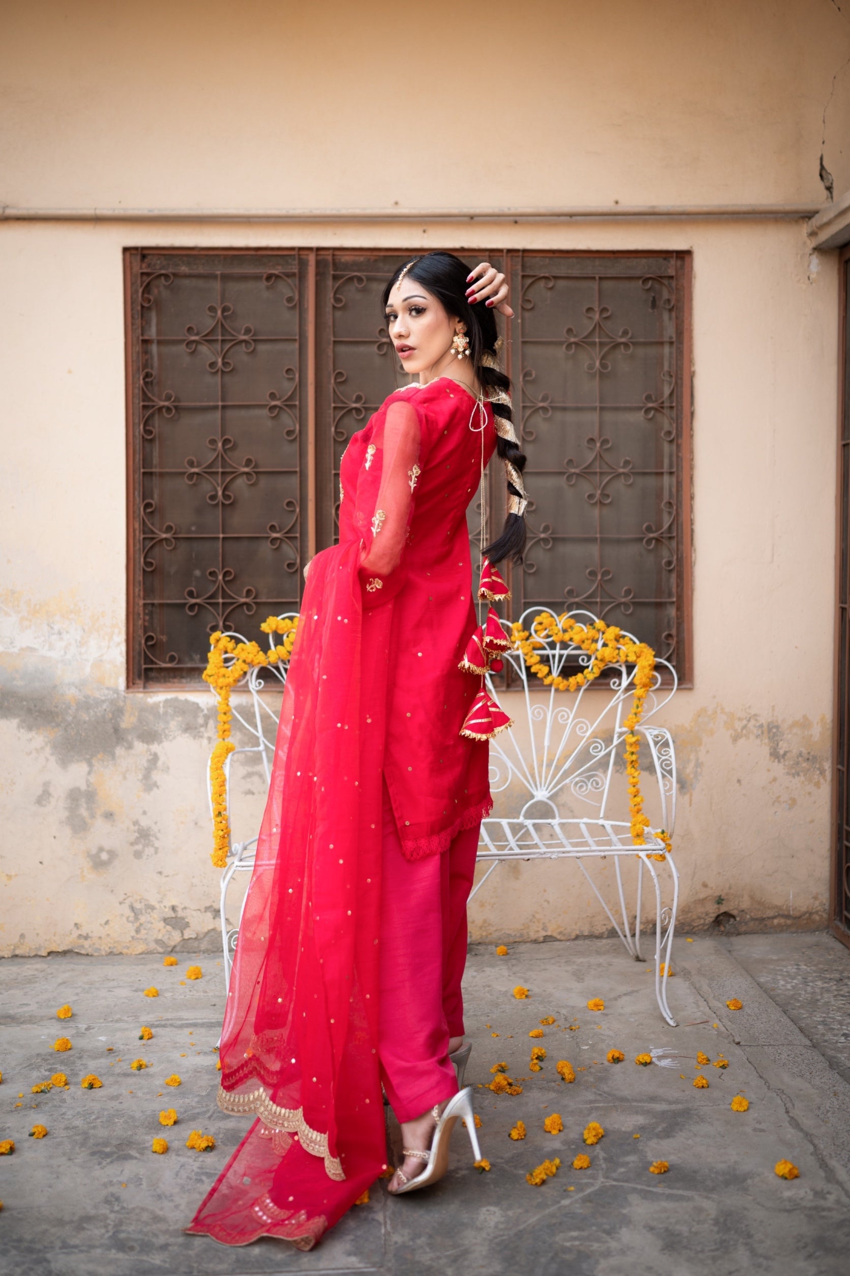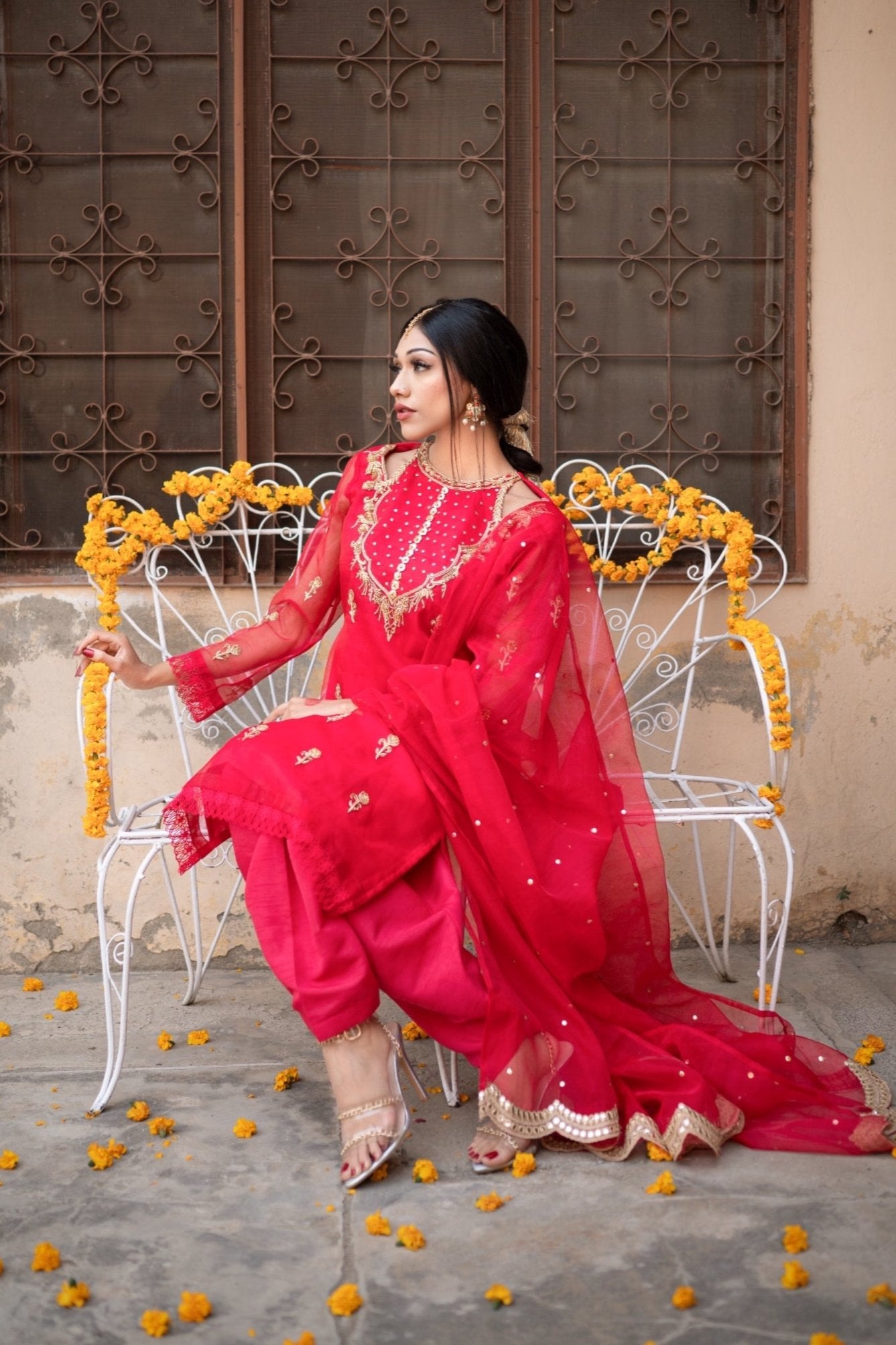 Paired up with shalwar enhancing its traditional punjabi look. Khaadi net duppta with embellishment trimming on pallus.