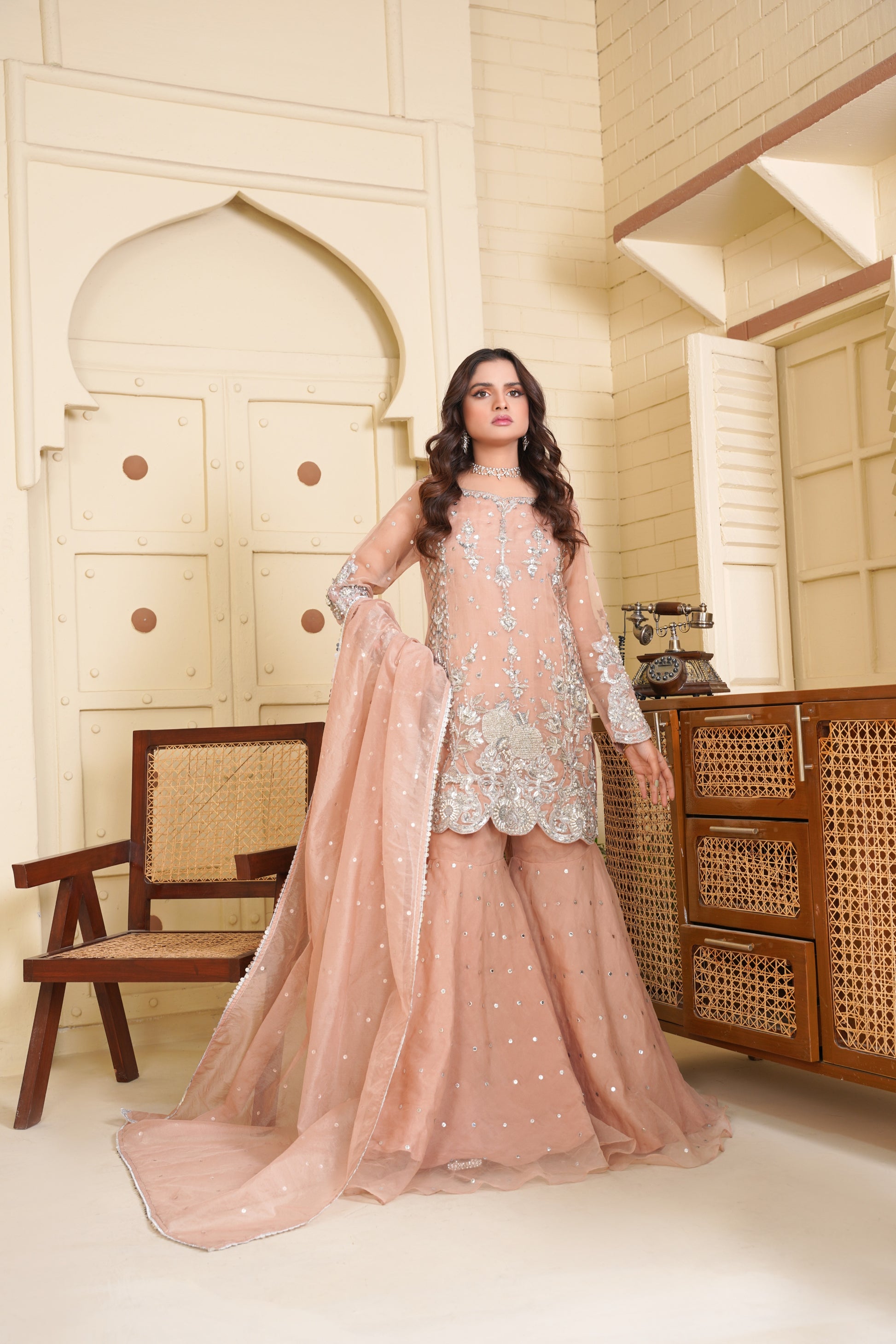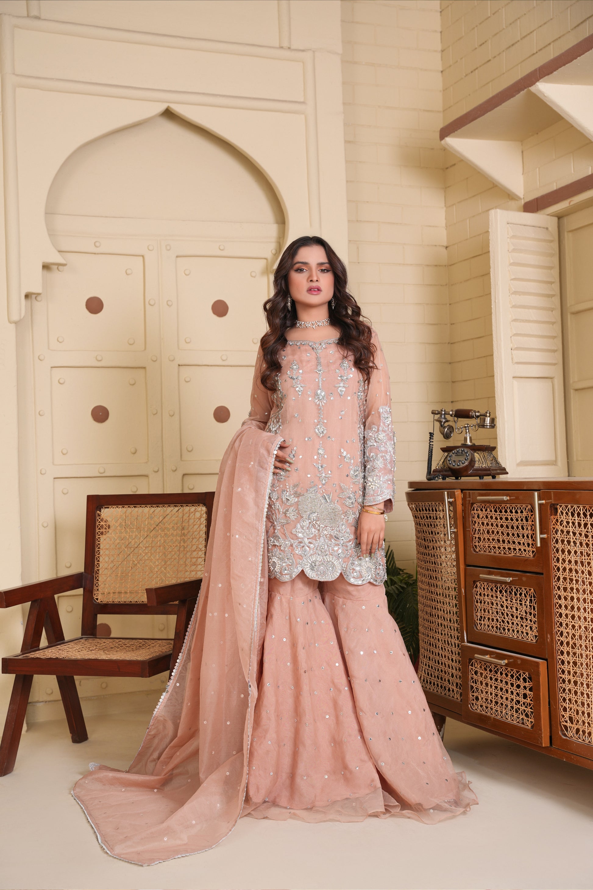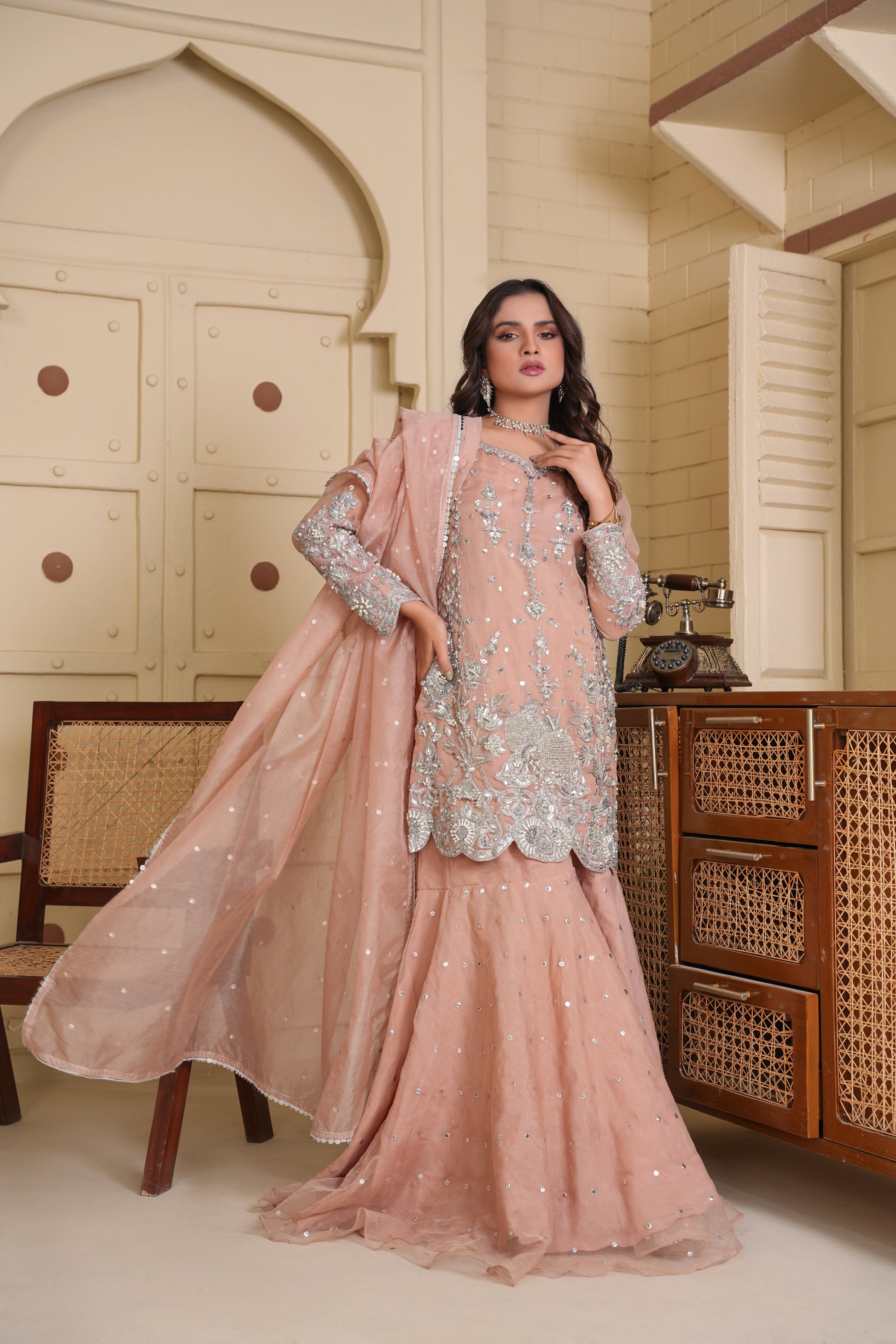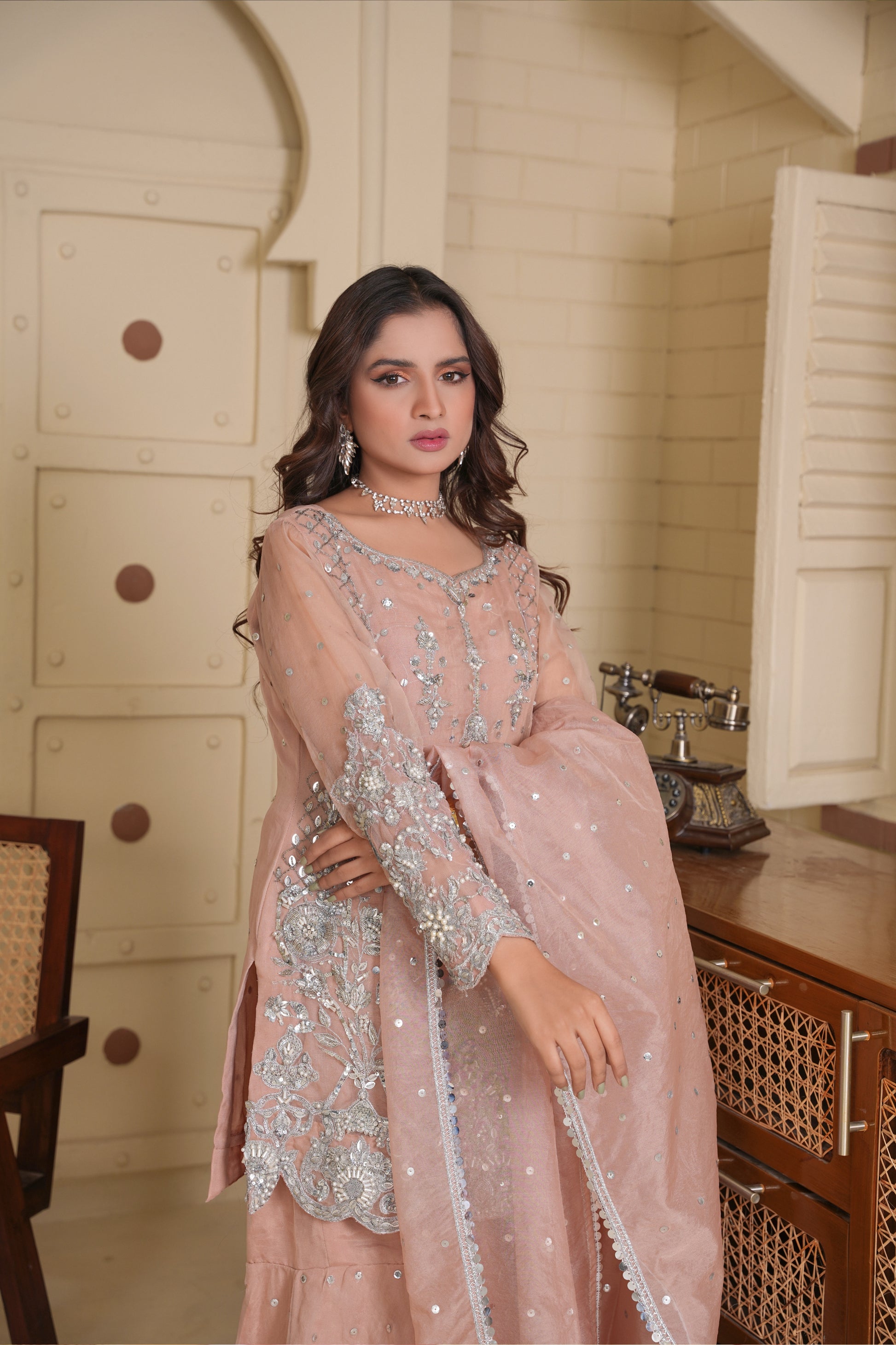 Ameera - Introducing soft pink attire , kurti is embellished with dabka, kora , sequin , pearls and diamonties. Paired with Grara pants and organza duppta. Perfect pick and giving the The Main character vibe. 💫