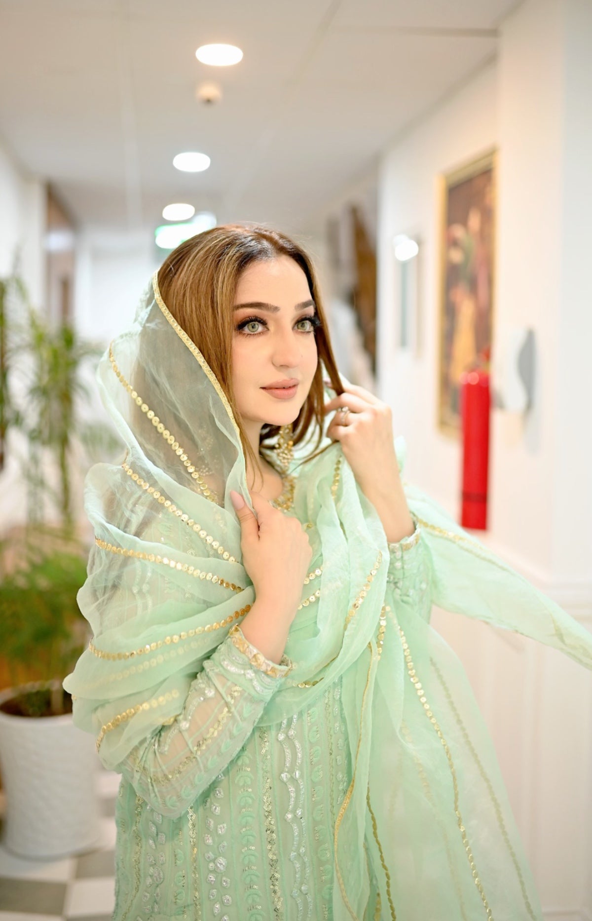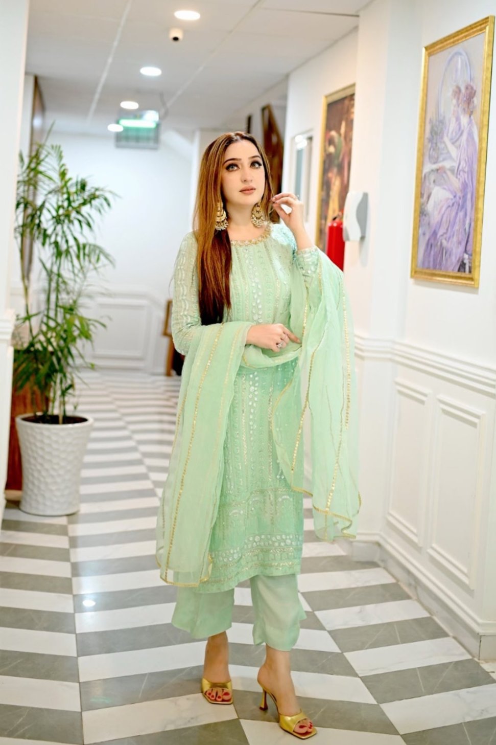 Arooj is a pastel aqua chicken kaari three-piece featuring an embellished neckline and sleeves in a gold and silver hue. Combined with an organza dupatta adorned with embroidered line & Ajaar pants, this look is a must have!