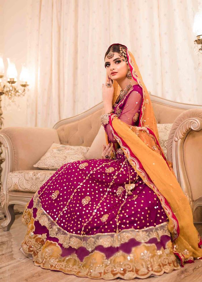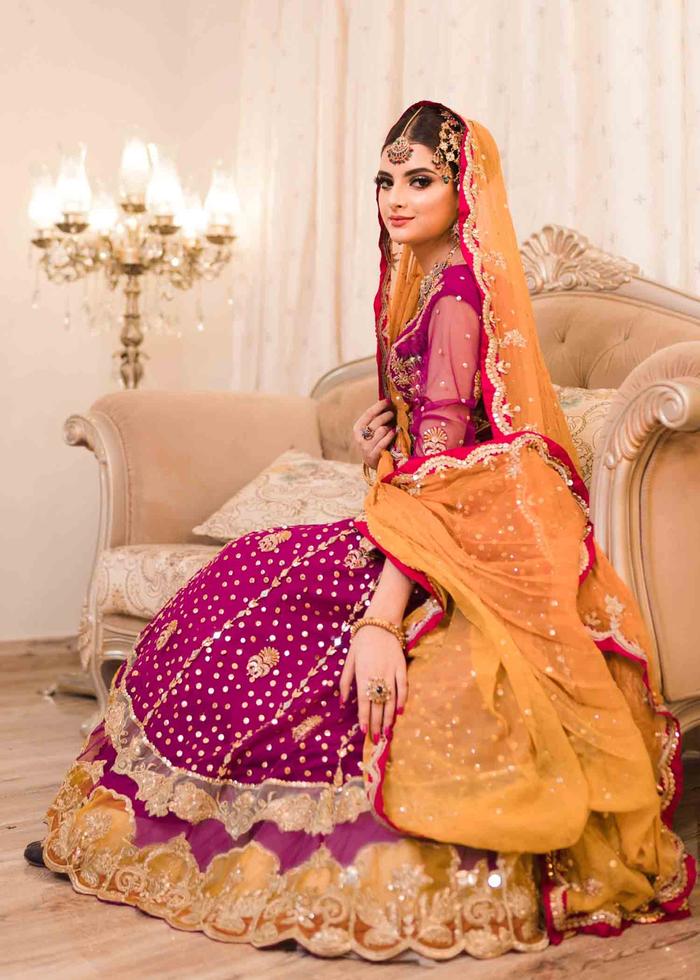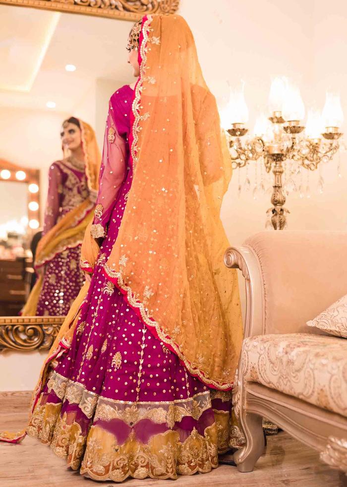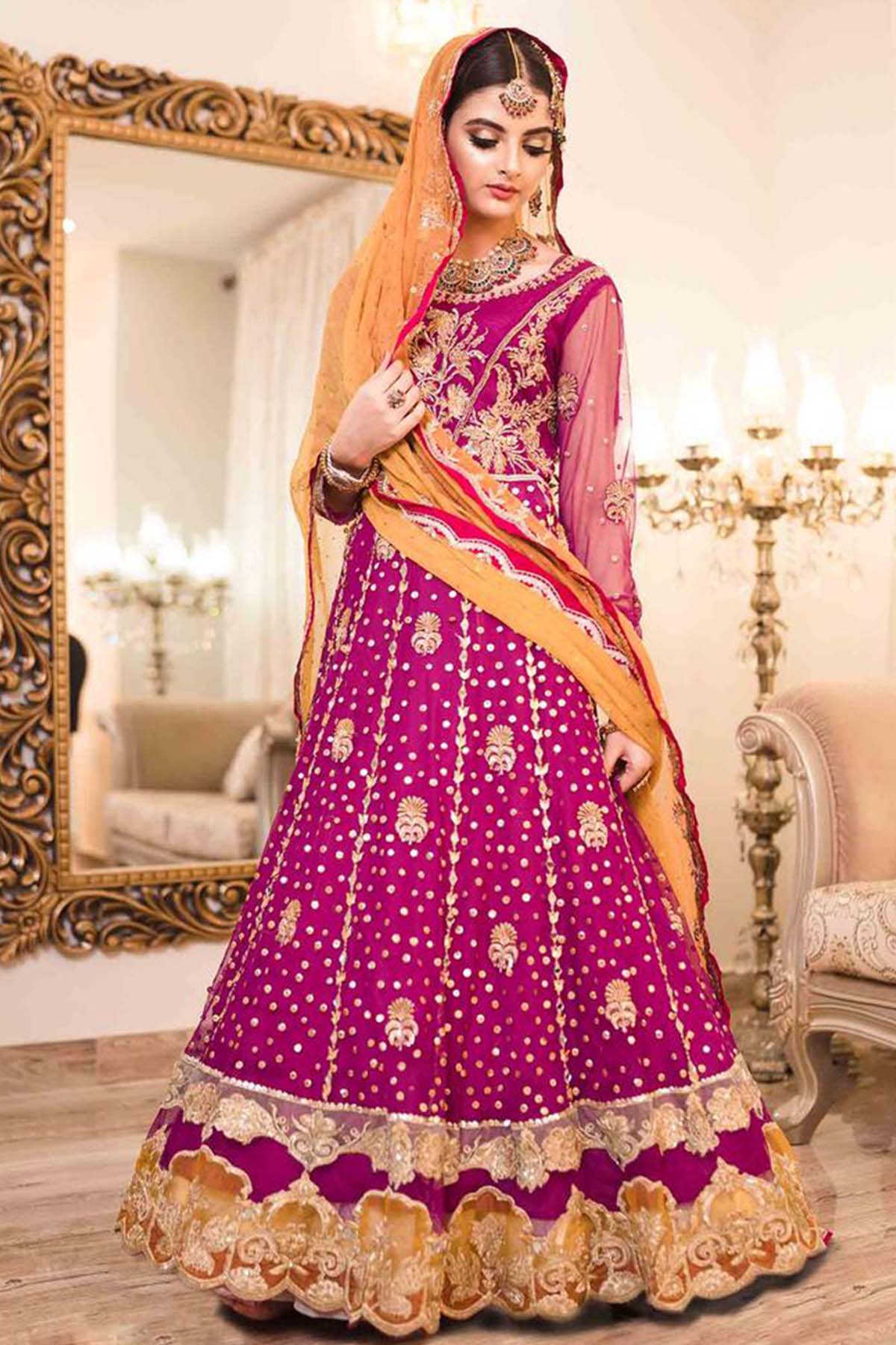 Beautifully embellished magenta pink gown with tilla, sequins, pearls , gotta and shesha. Paired with mustard dupatta is perfect pick for your big day event.