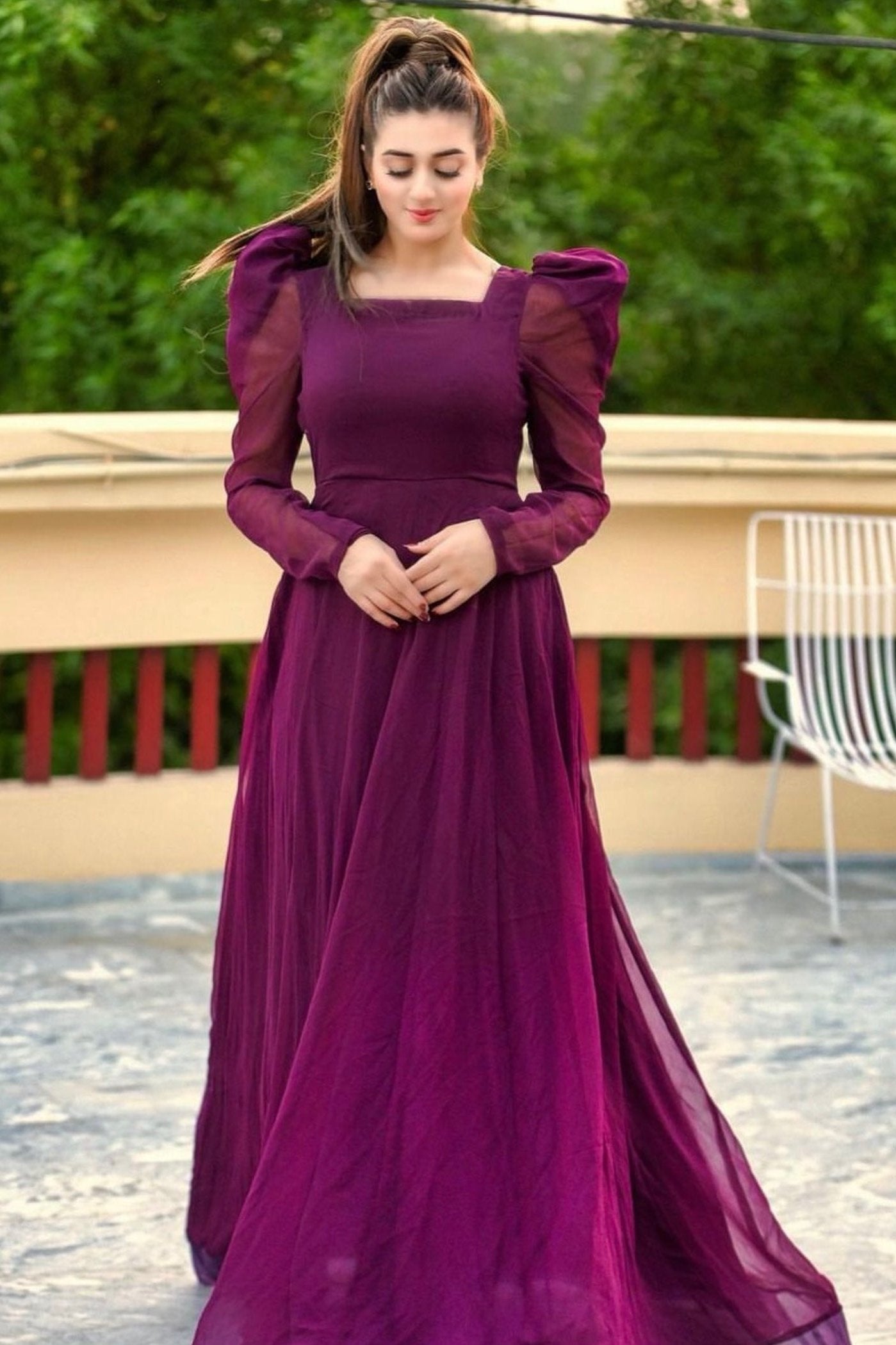 Our signature regal purple gown showcasing puffy sleeves from the 70's. The simplicity of this outfit makes it mesmerising.