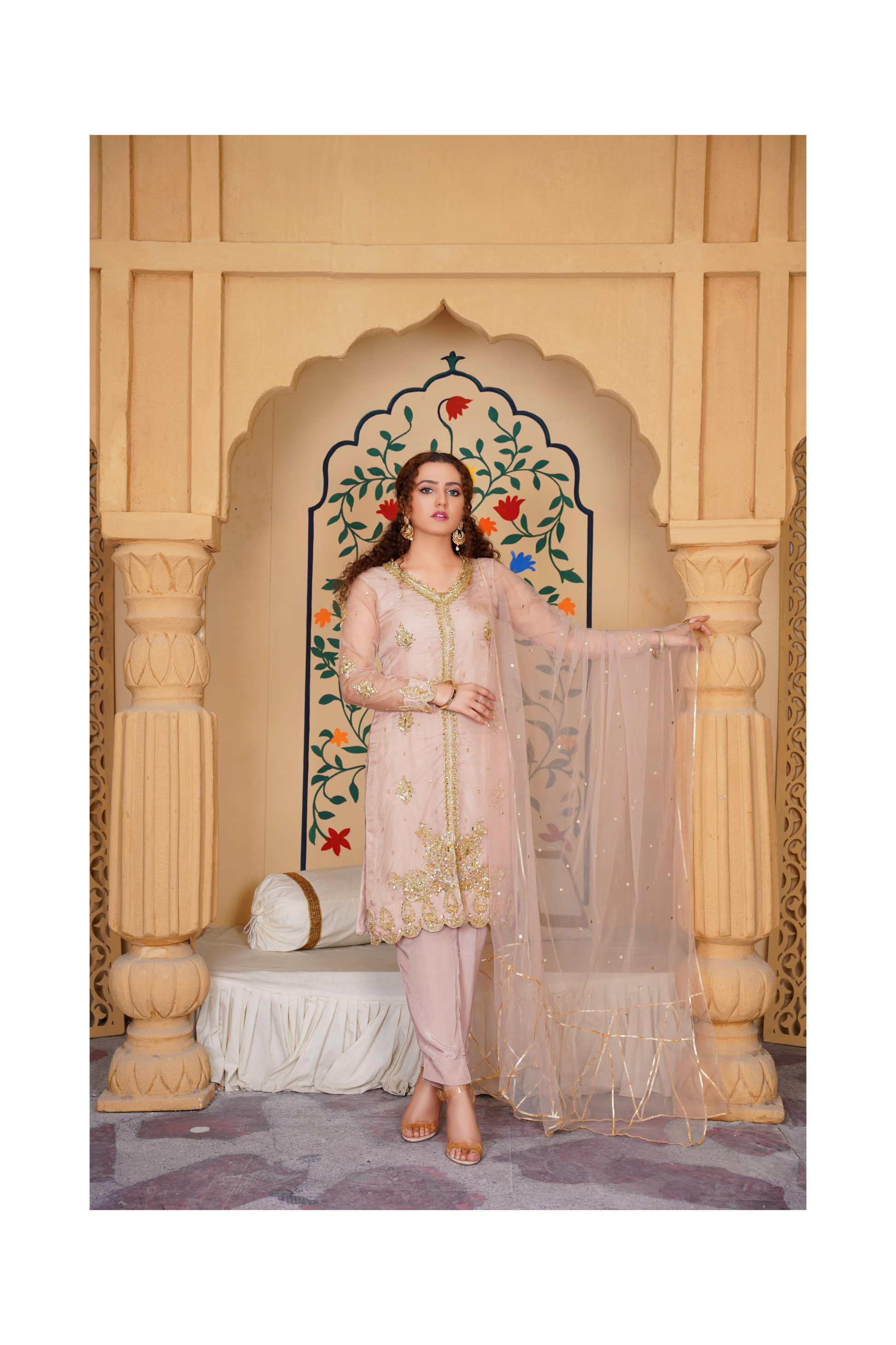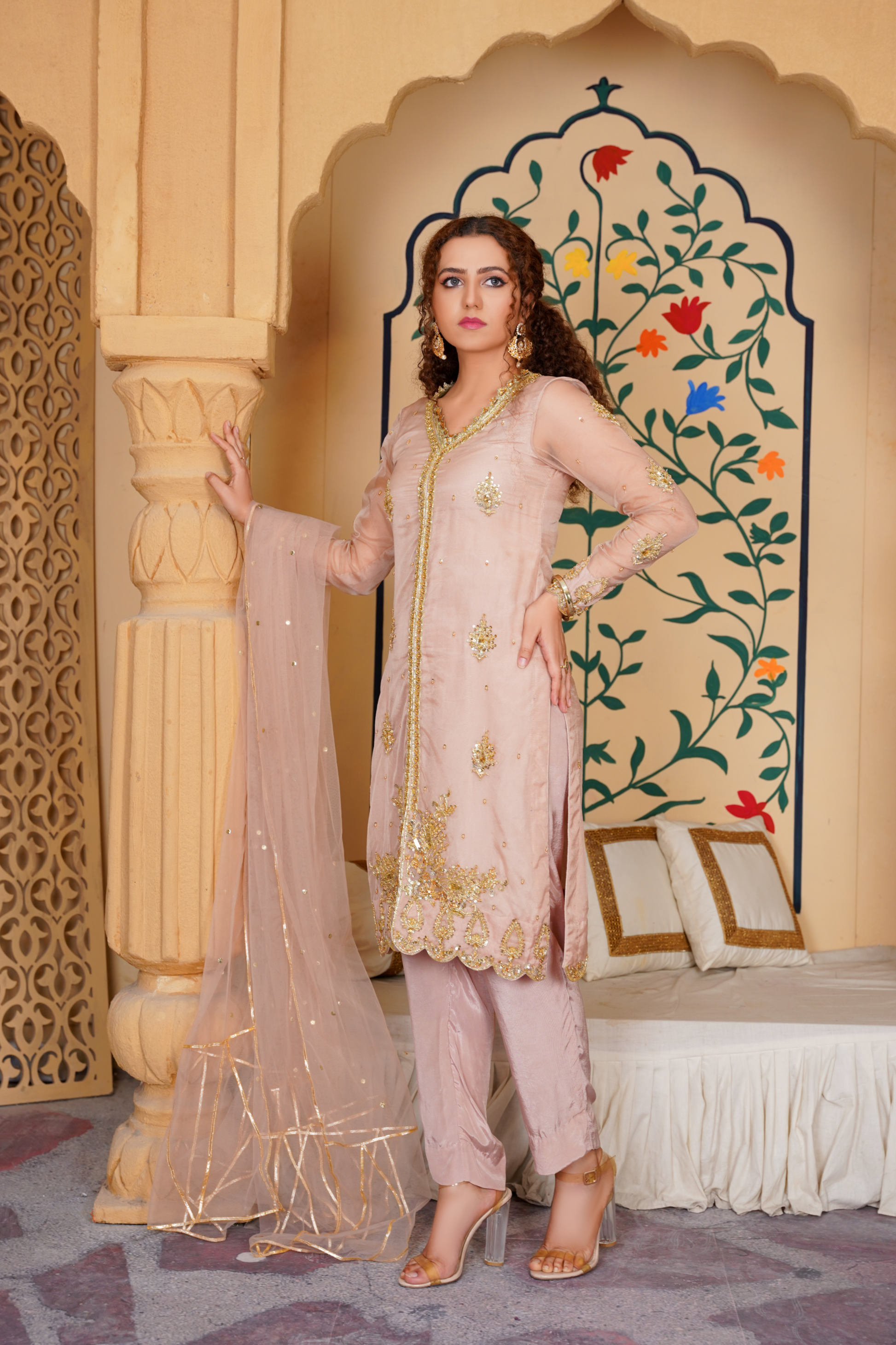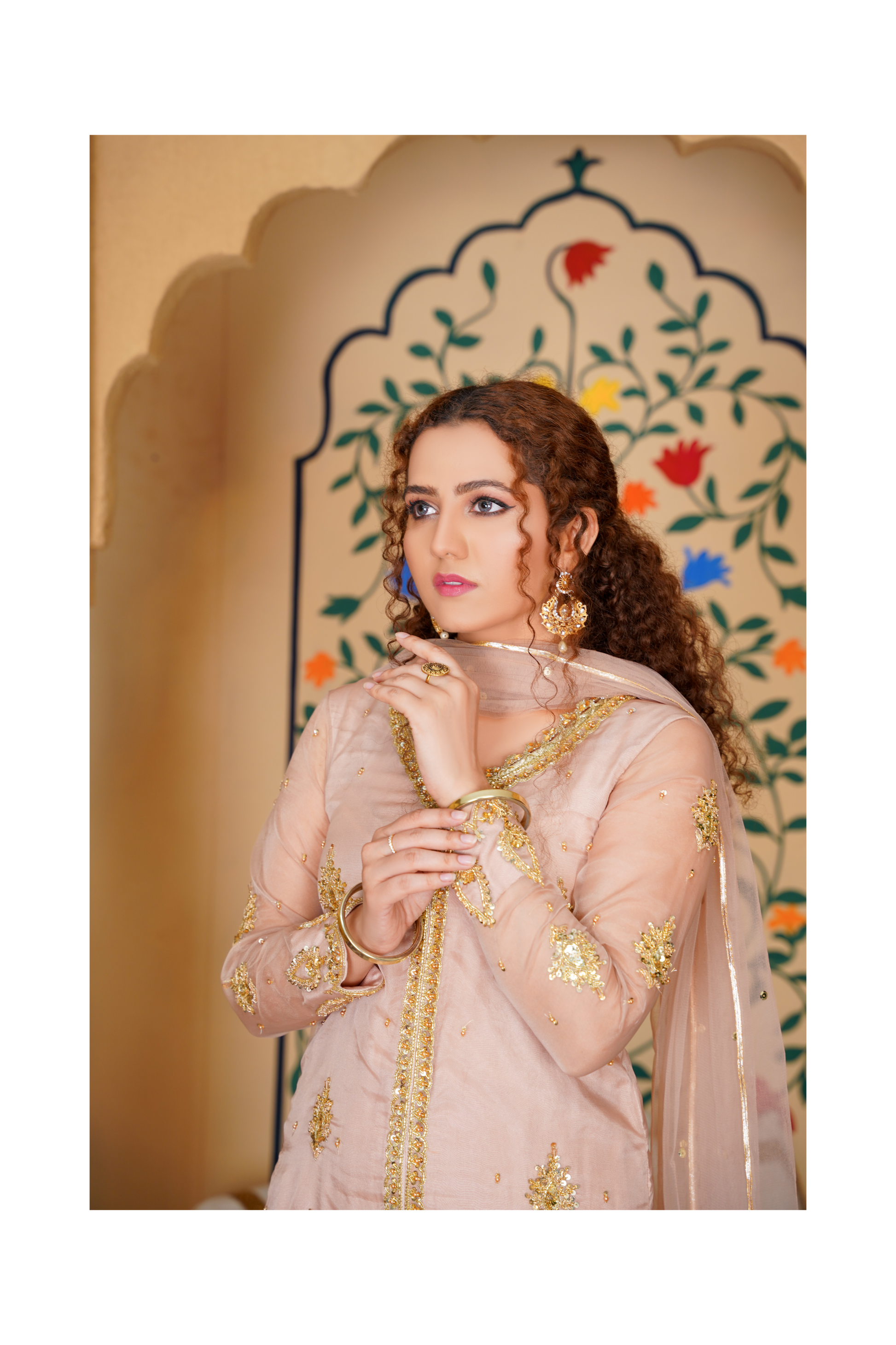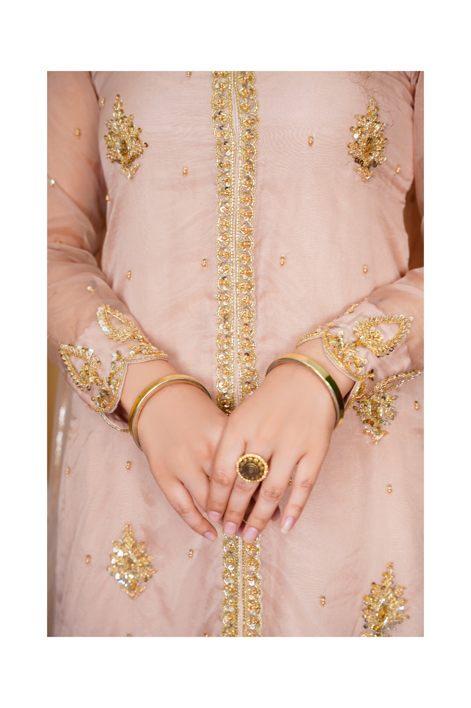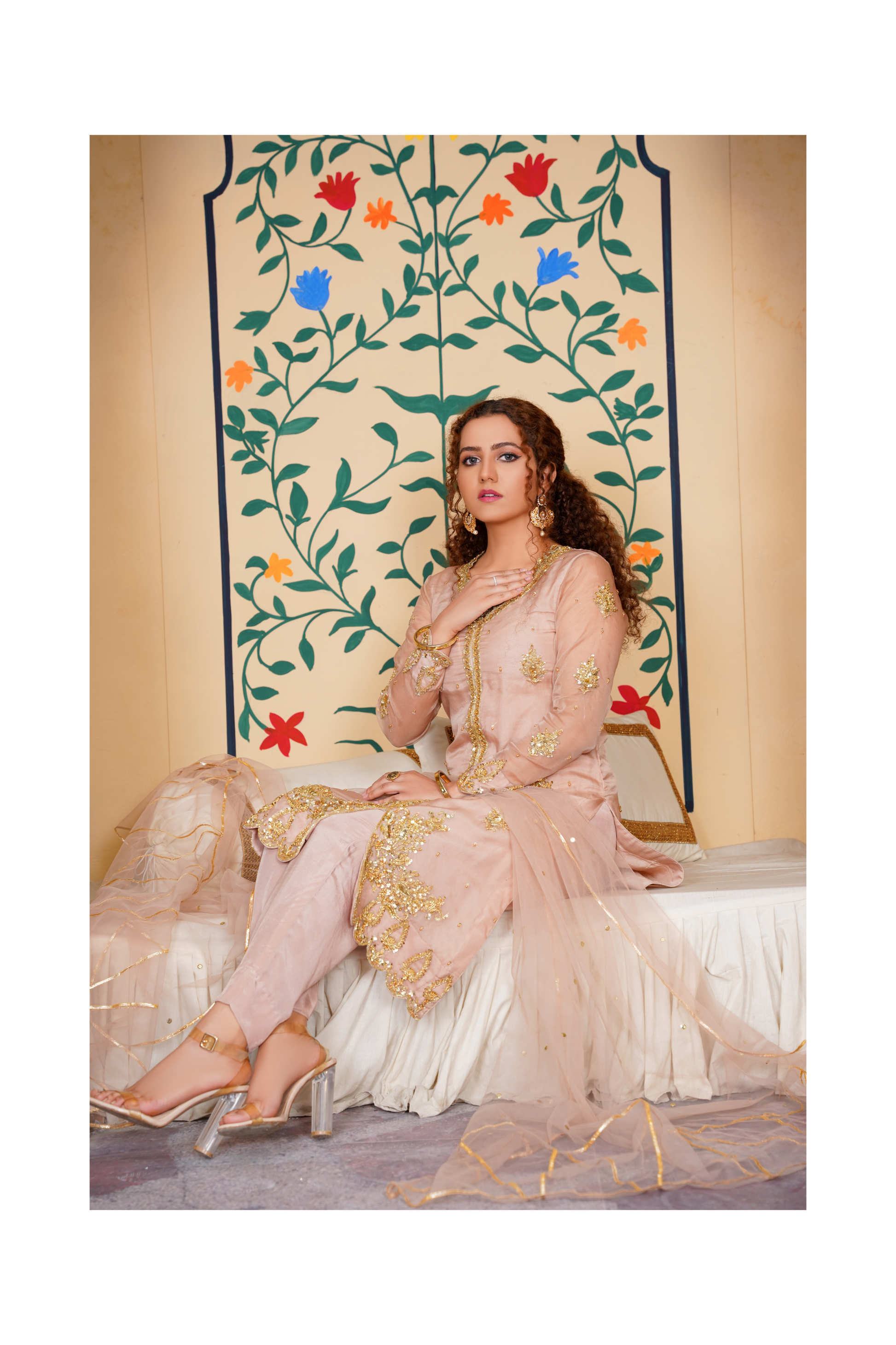 Come in a rose pink organza front open shirt and straight pants with intricately embellished golden zardozi work. Paired with Net dopta with all over sequin spray.