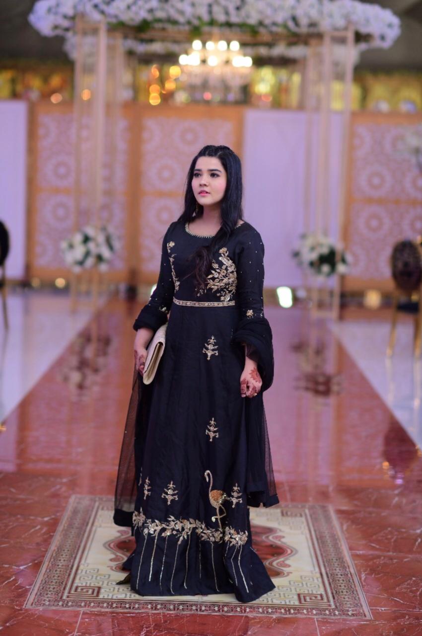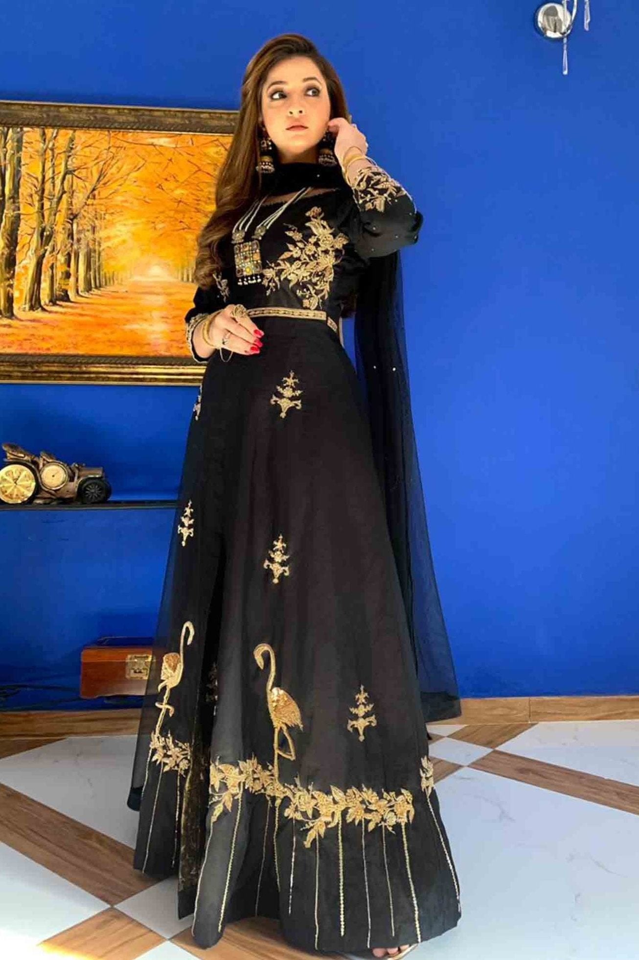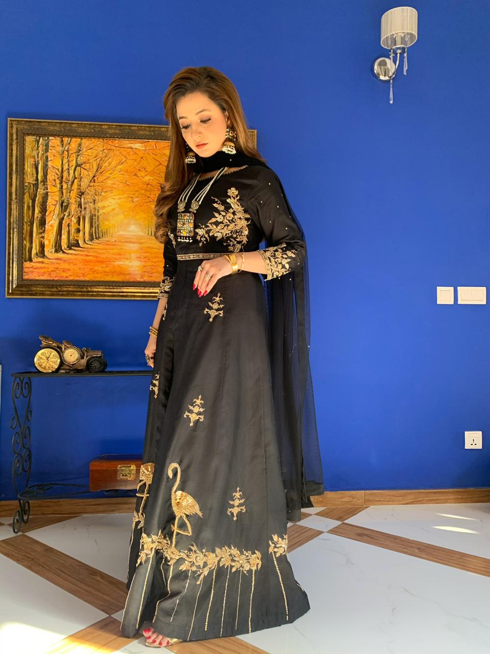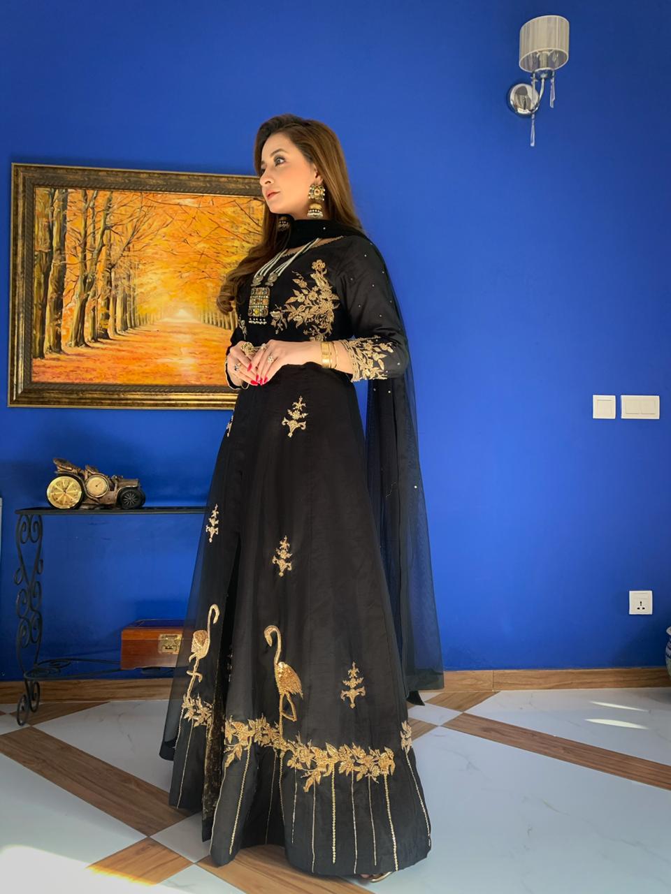 Majestic black full length gown with front open cut. Embellished with floral patterns on boadice and sleeves. Floral pattern with flamingo on the boaders. All embellishment is crafted with dabka, kora, sequins, pearls and diamonties. This Master piece is perfect pick to Allure your festive look.