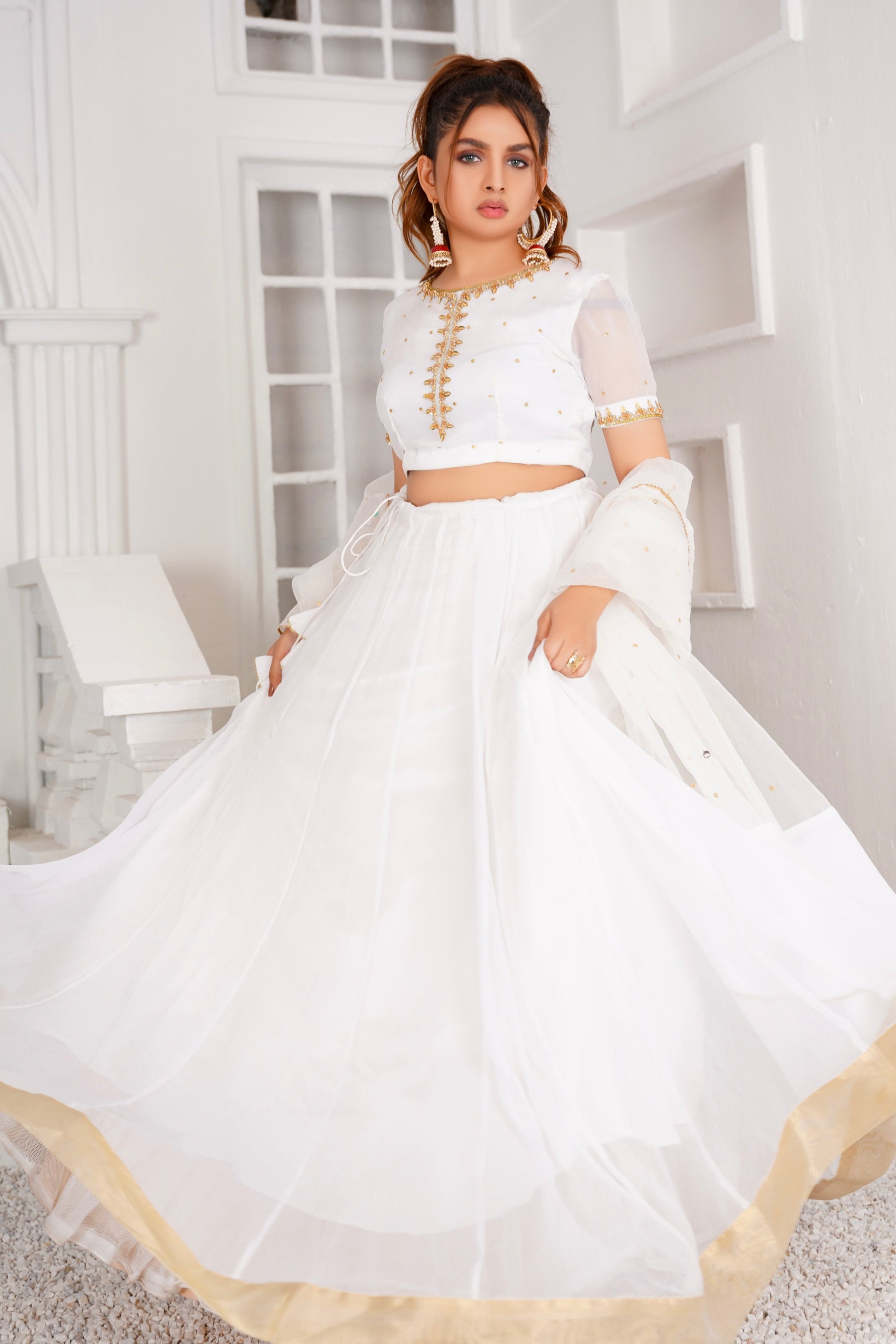 CHAND - This delightful white attire is all you need to level up your festive look. Sophisticated golden handwork on neckline and sleeves of choli giving it mesmerising look. Flowing plain lehnga is classically paired with it.