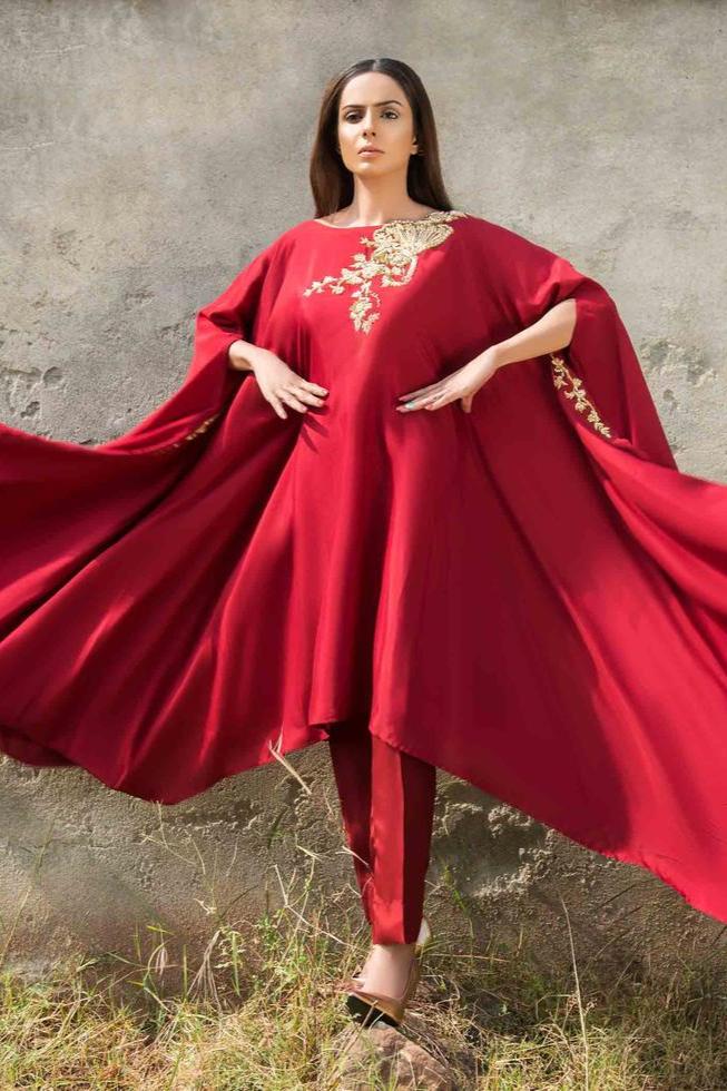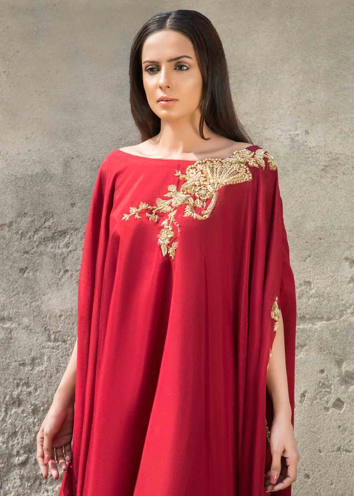 Beautiful Deep red kaftan,Embellished neckline in motif pattern and floral bail on sleeves with kora dabka,sequins and pearls. Its hot pick for your festive look.