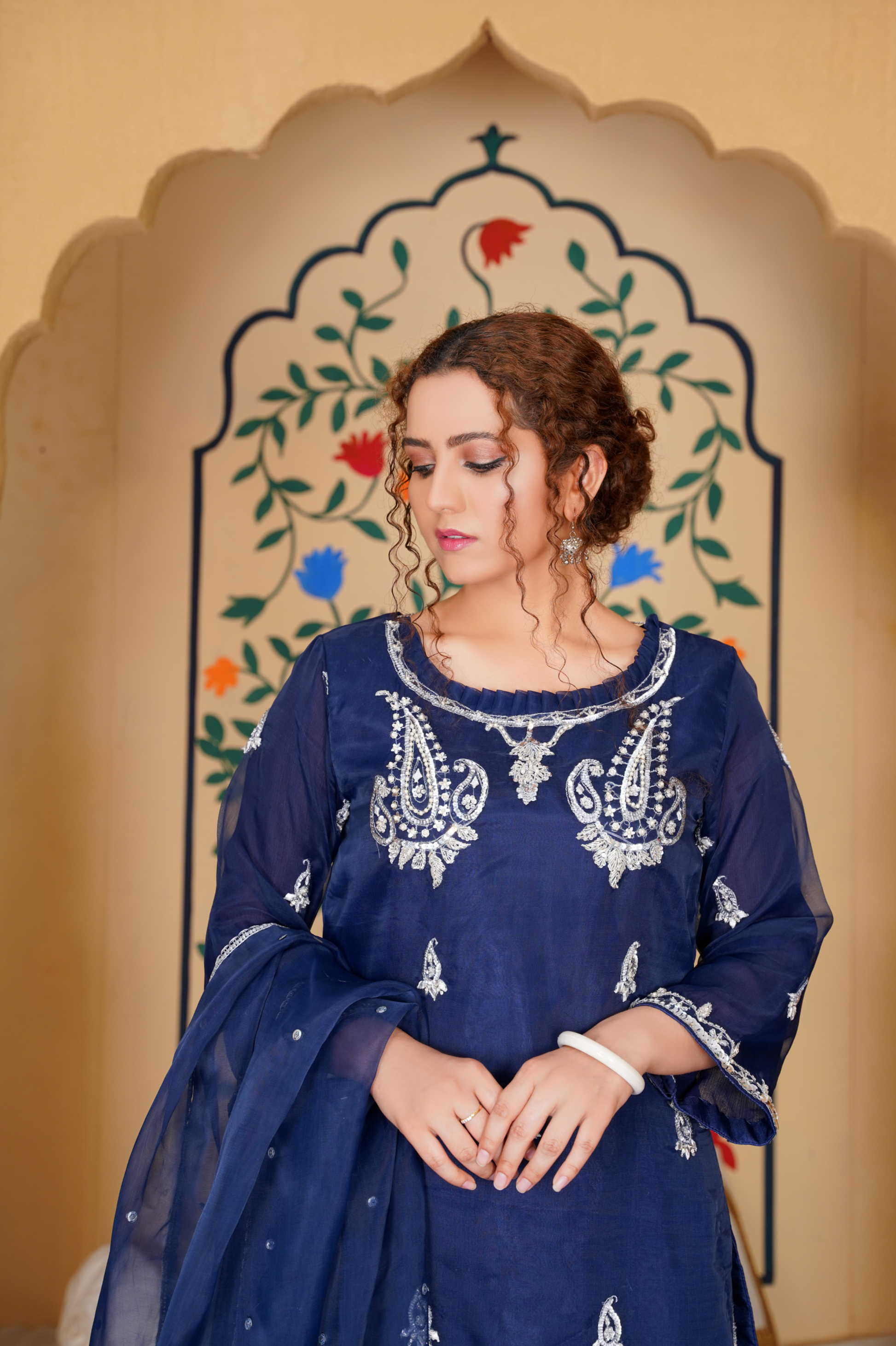This navy blue hued kurti embellished in silver dabka, naqshi , sequin and diamonties work. The paisley motifs are spreaded all over the shirt giving it mesmerising sight. Paired with straight pants and organza dopta with kiran edging.