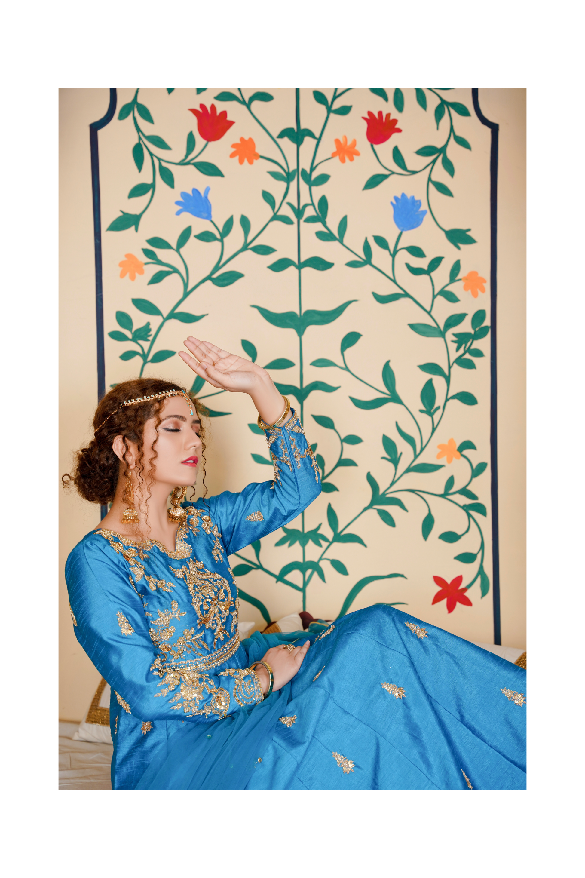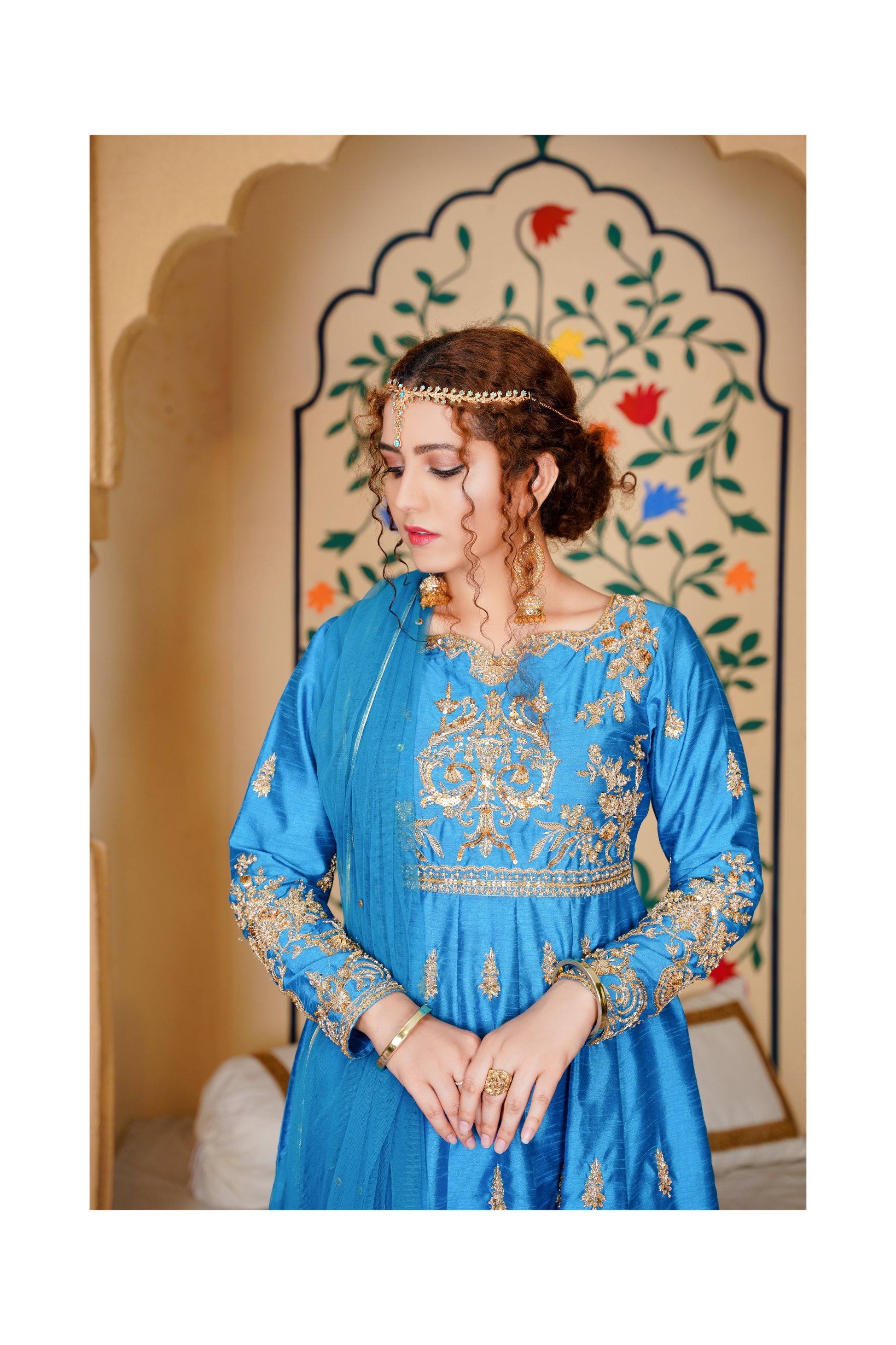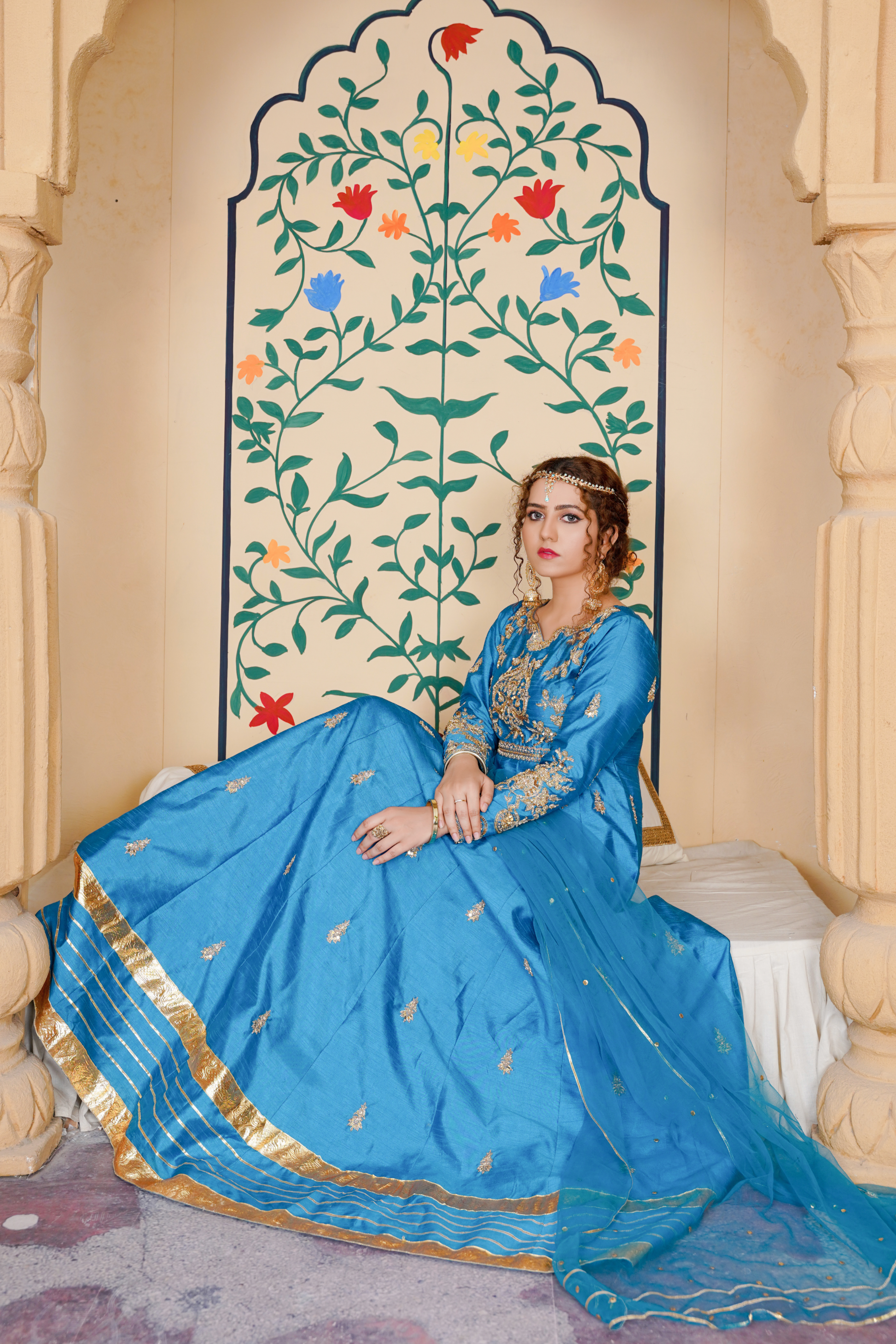 Mesmerising teal blue sarwar jaan’s signature anarkali gown. Adorn with sona gold Zardozi work. Perfect blend to oomph your Festive Look.