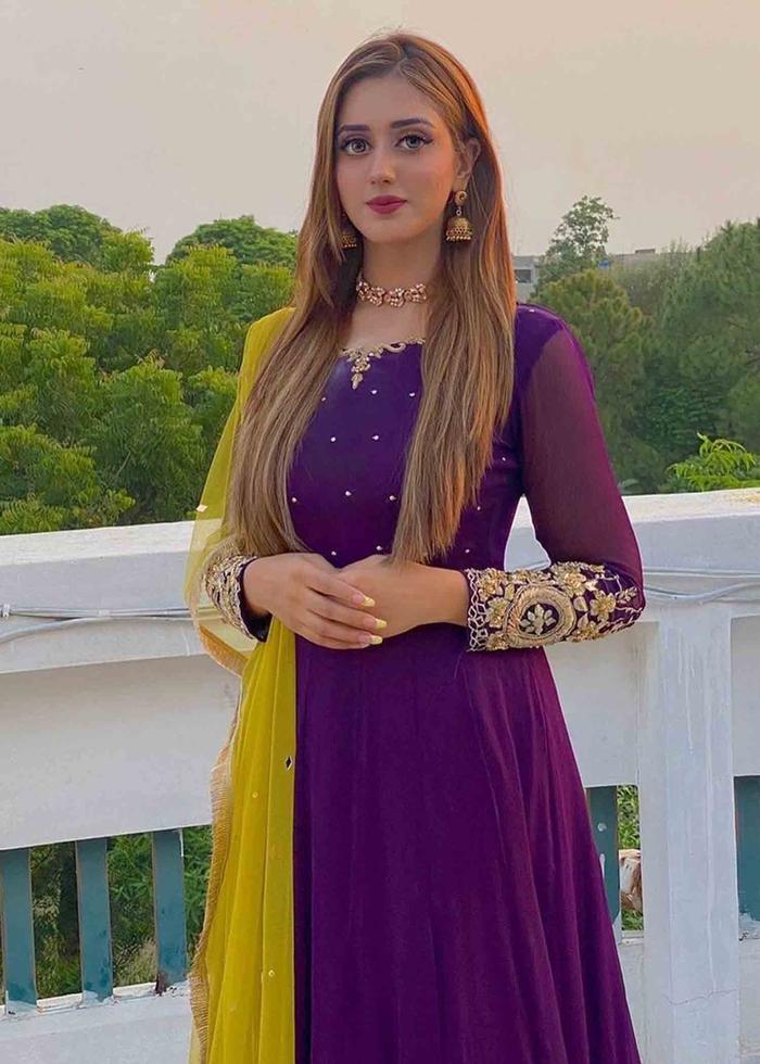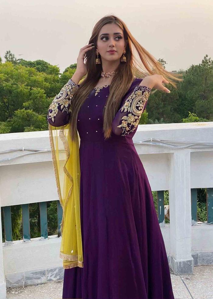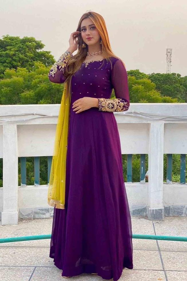 Eggplant purple Gown embellishment on neckline and 6.5 inch floral pattern work on sleeves with kora dabka and sequin work. Net dopta with miror and sequin spray on it. Perfect Choice to oomph you Festive look.