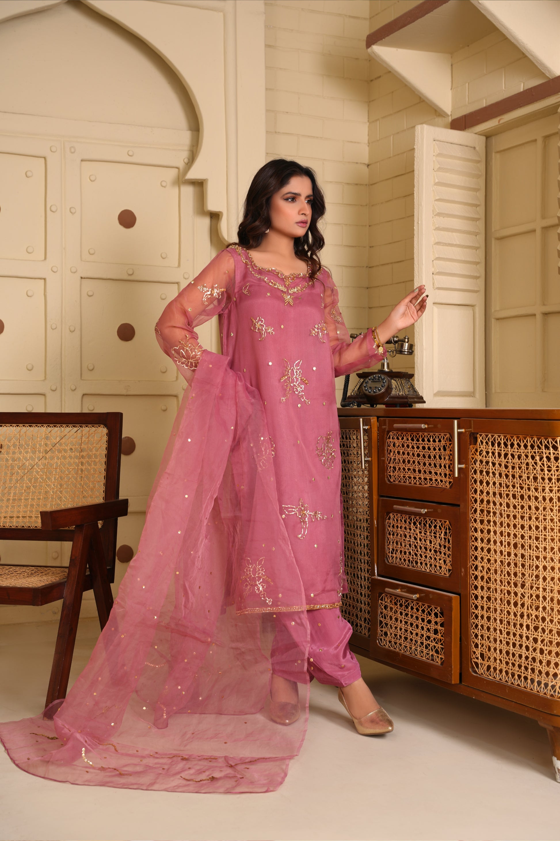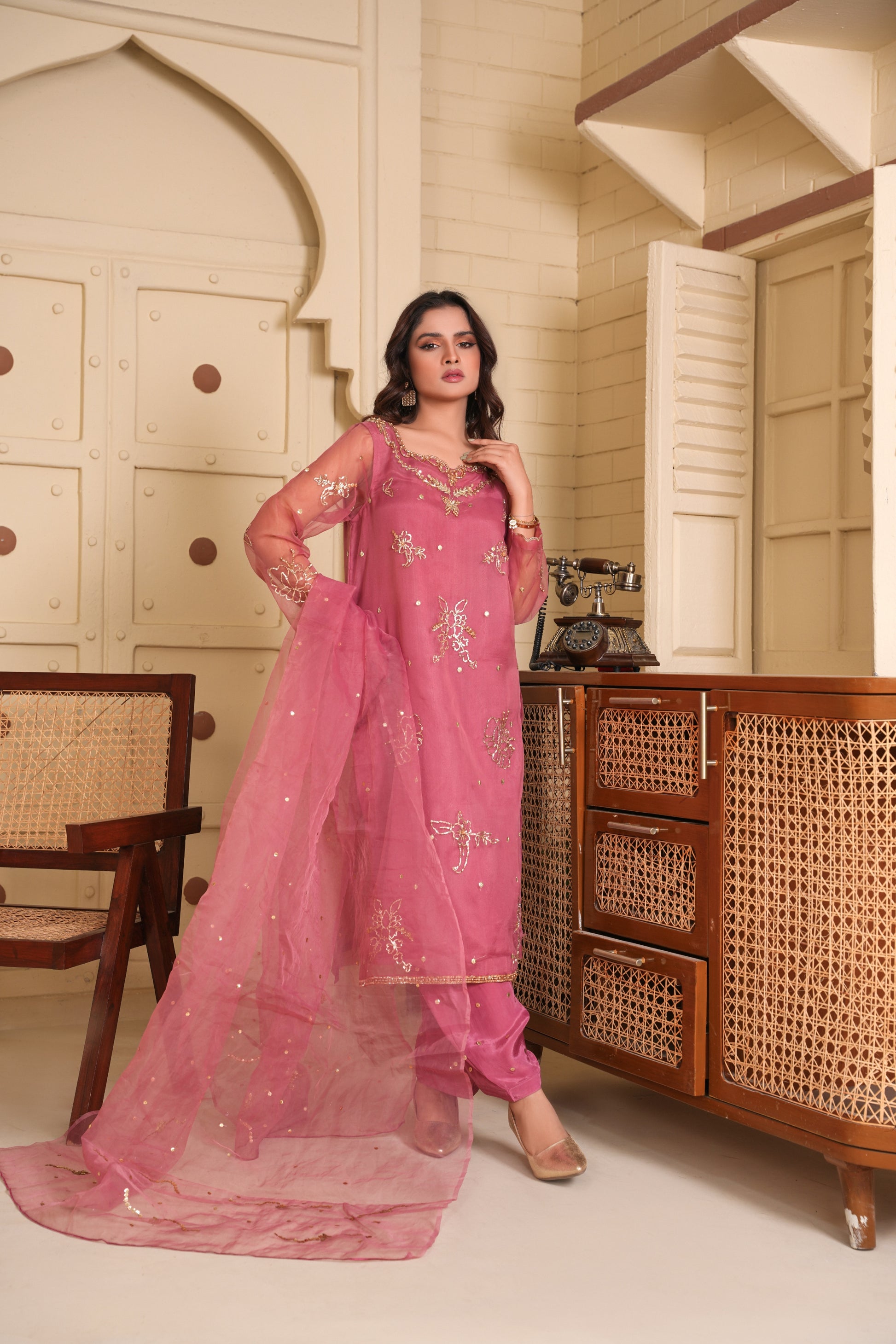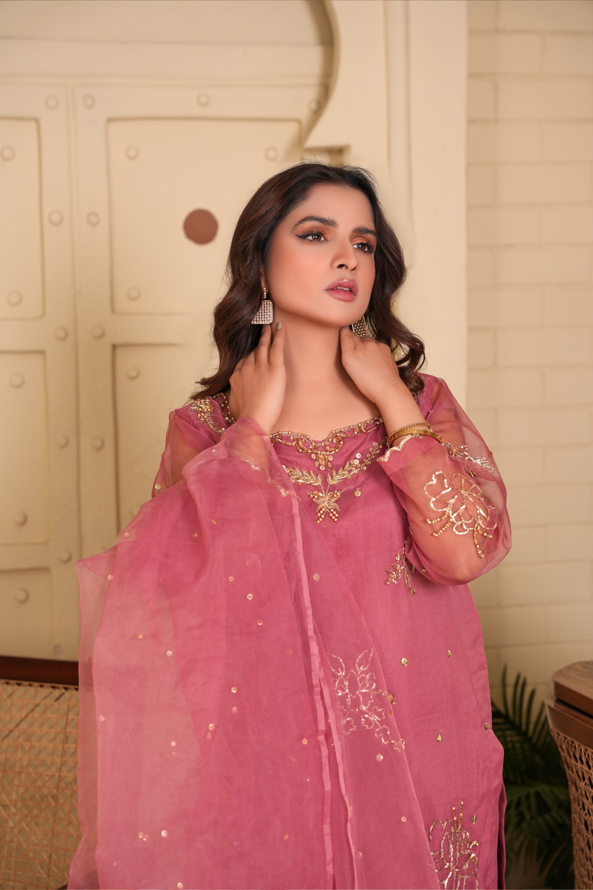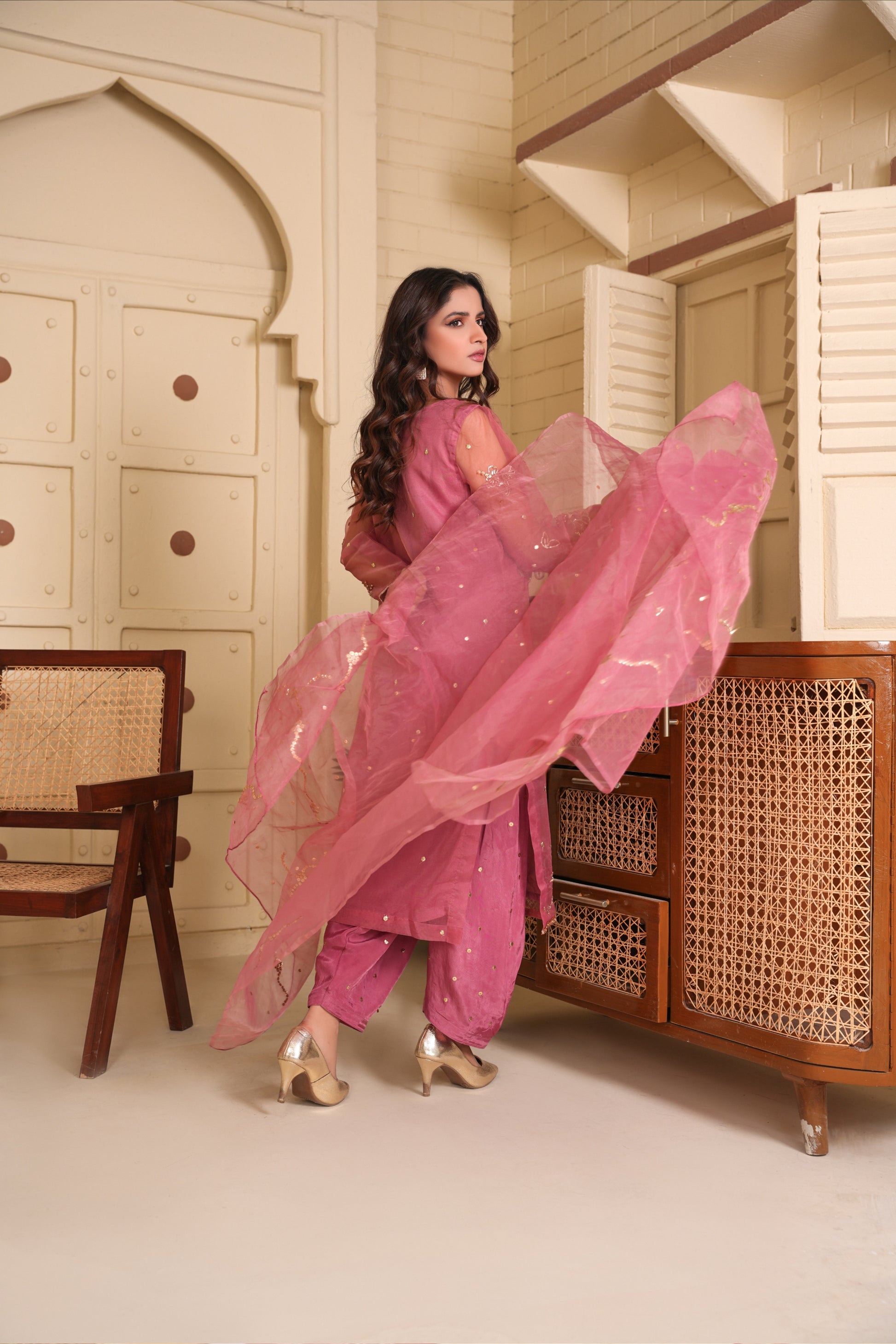 Gulab jahan : Elegant Pink organza shirt embellished with Handwork technique, with dabka, tilla, sequins and gotta. Floral motif boti spray on shirt and sleeves. Paired with embellished organza dupata. Perfect pick to oomph your festive look.