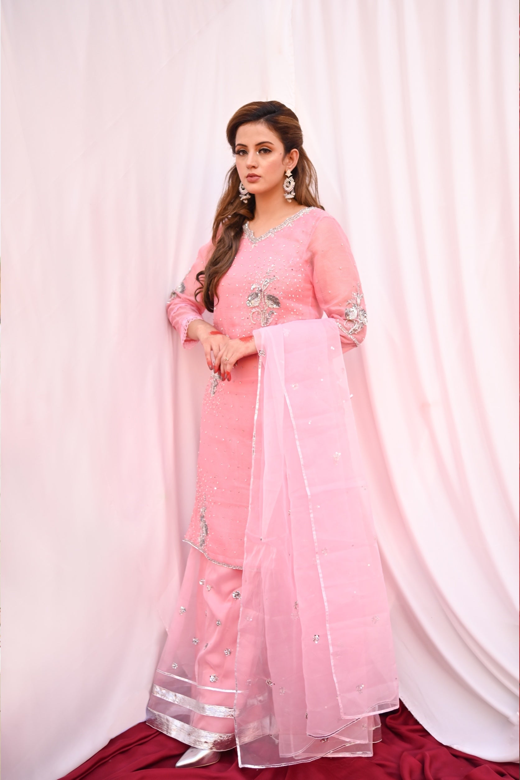 Gull is our classic Deep marron attire. Shirt has hand embellished motive on daman and sleeves, detailed with dabka naqshi and pearls. Duppta have sequin spray on it. Perfect pick to amph your festive look. Disclaimer: color of product may varry from Pictures due to Photographery , trimming and laces may vary.