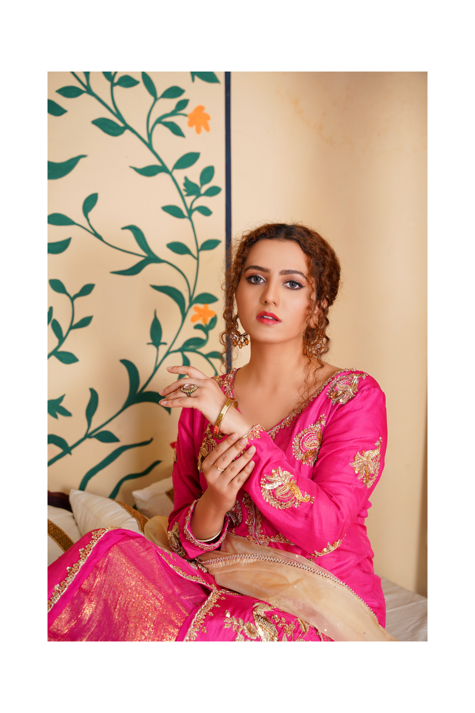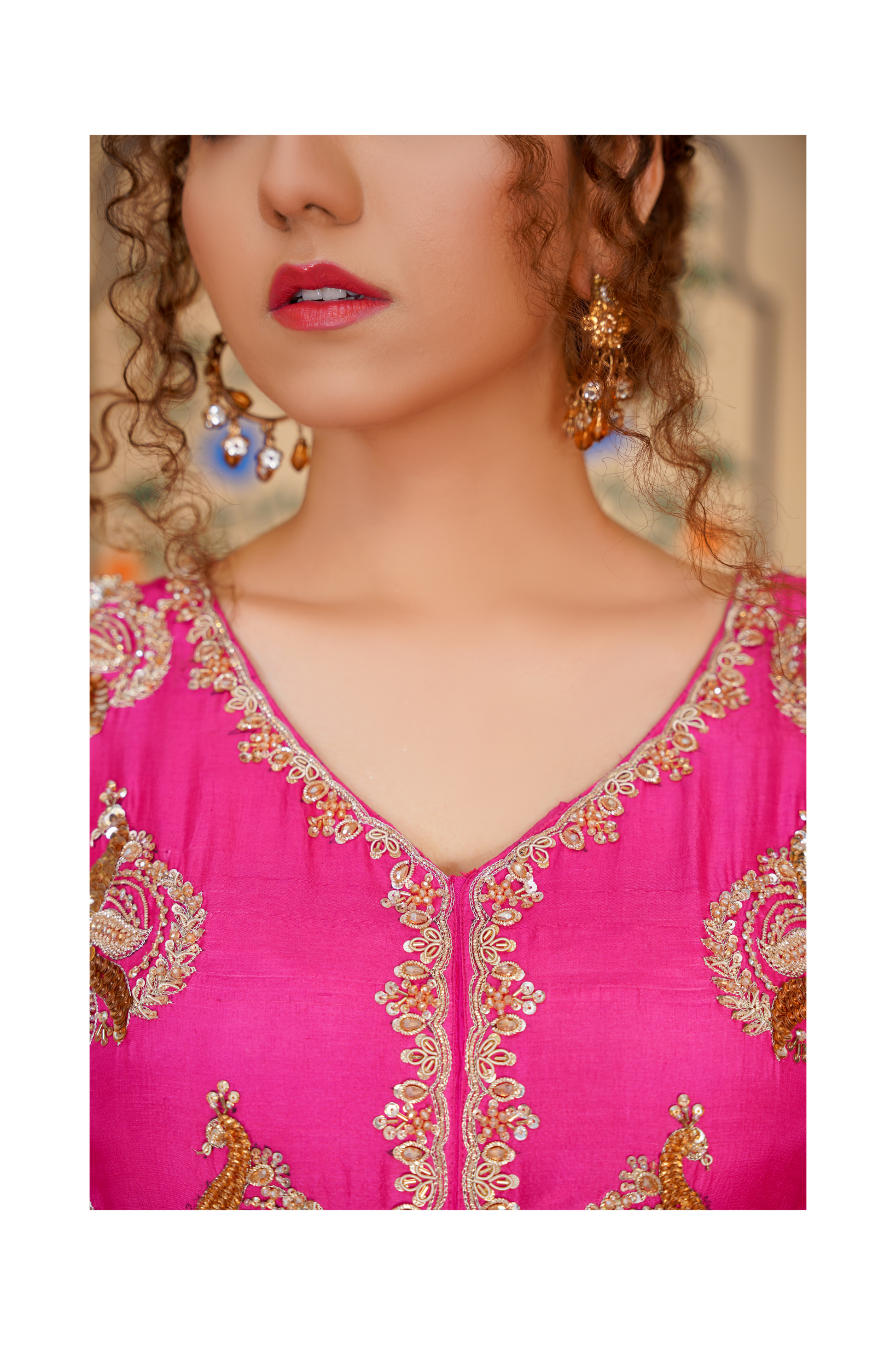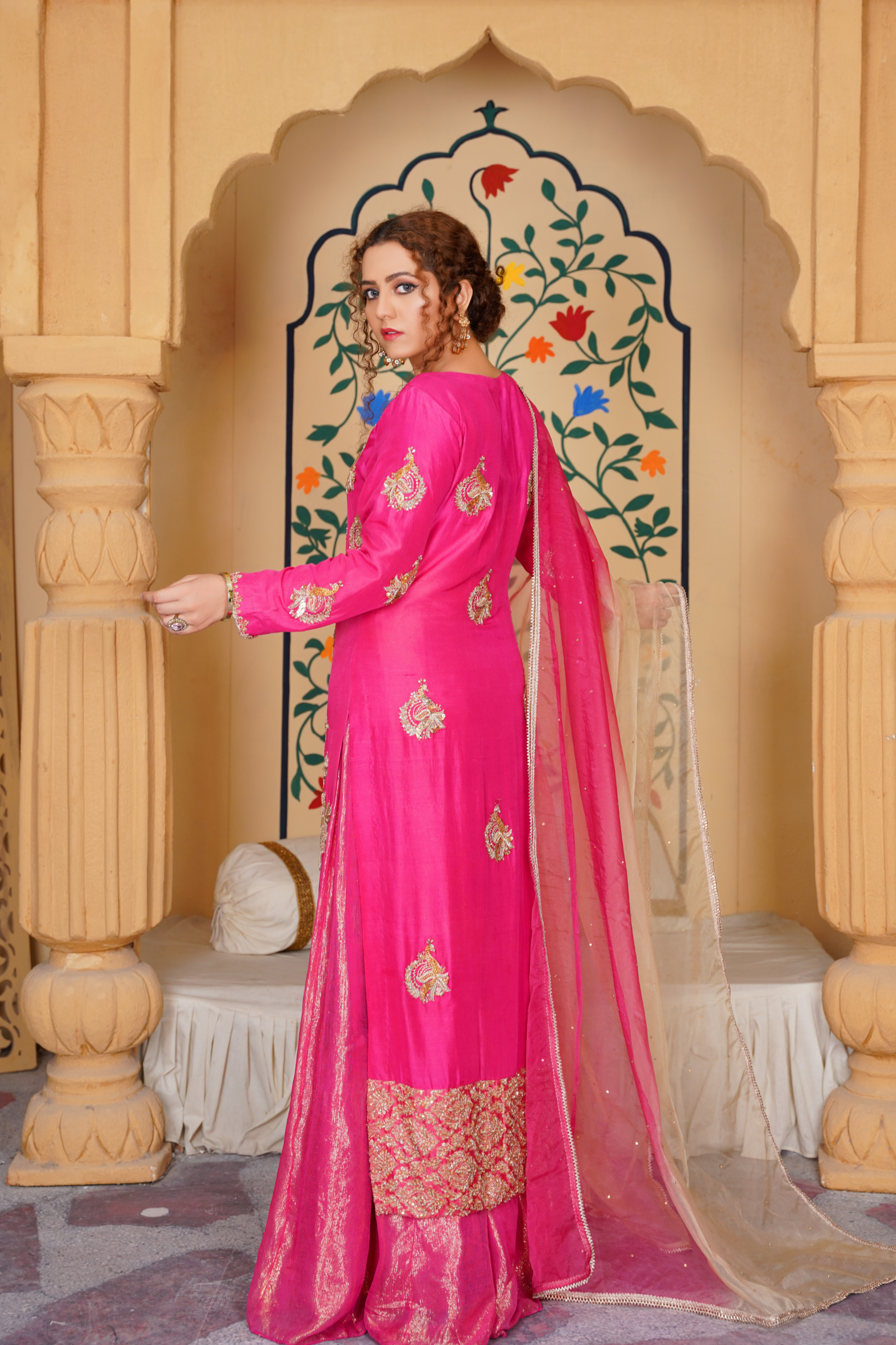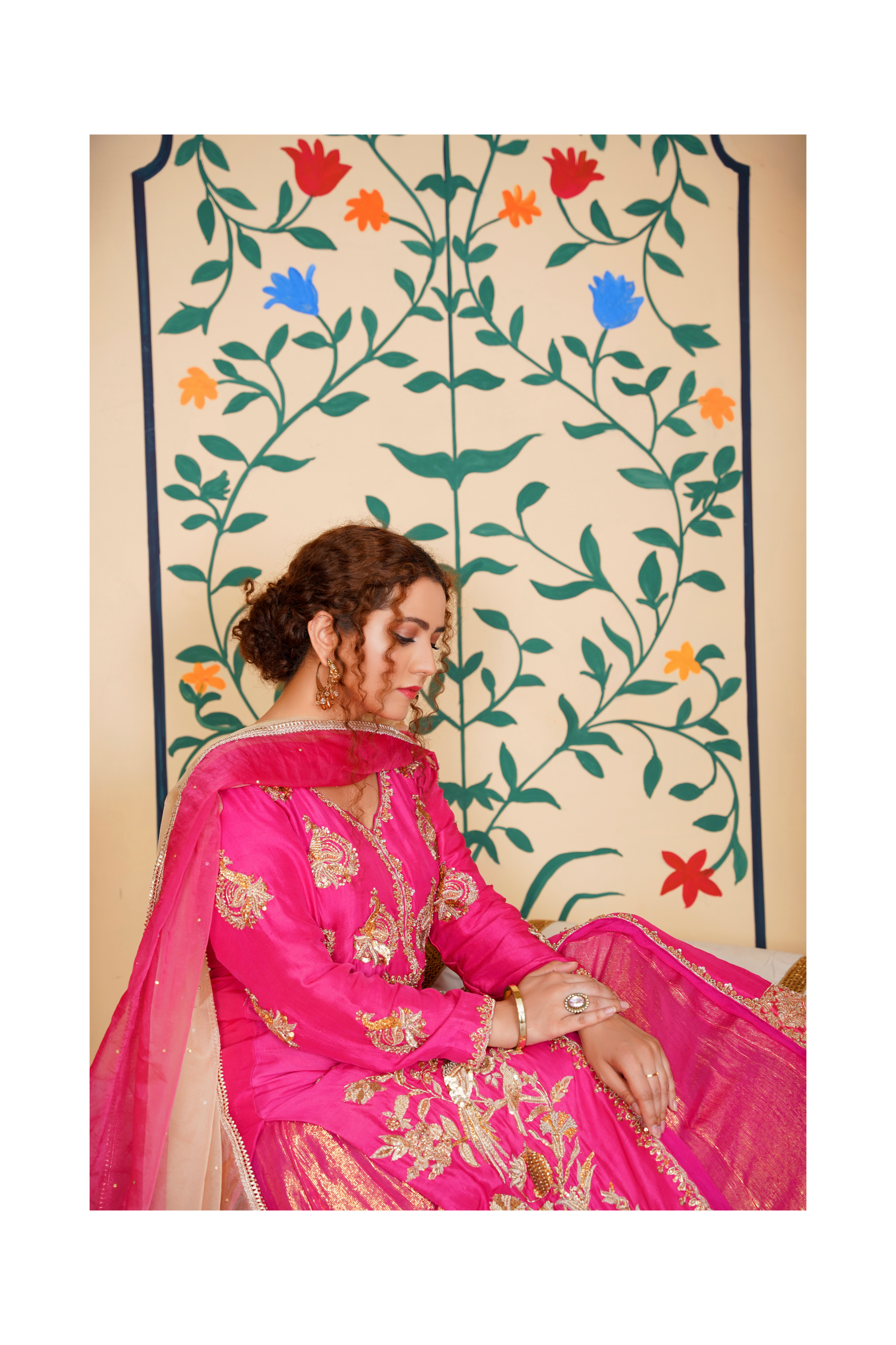 Haleh Is a festive gulabi lal hued Lehnga Qameez. The lively pink shirt in Pure rawsilk features finely embroided composed boader with spray of peacock motifs all across the shirt done in golden zardozi work. The shimmer chiffone lehnga making it more luscious. The ensemble is paired with double shade pink and golden dopata with sequin spray all over it.