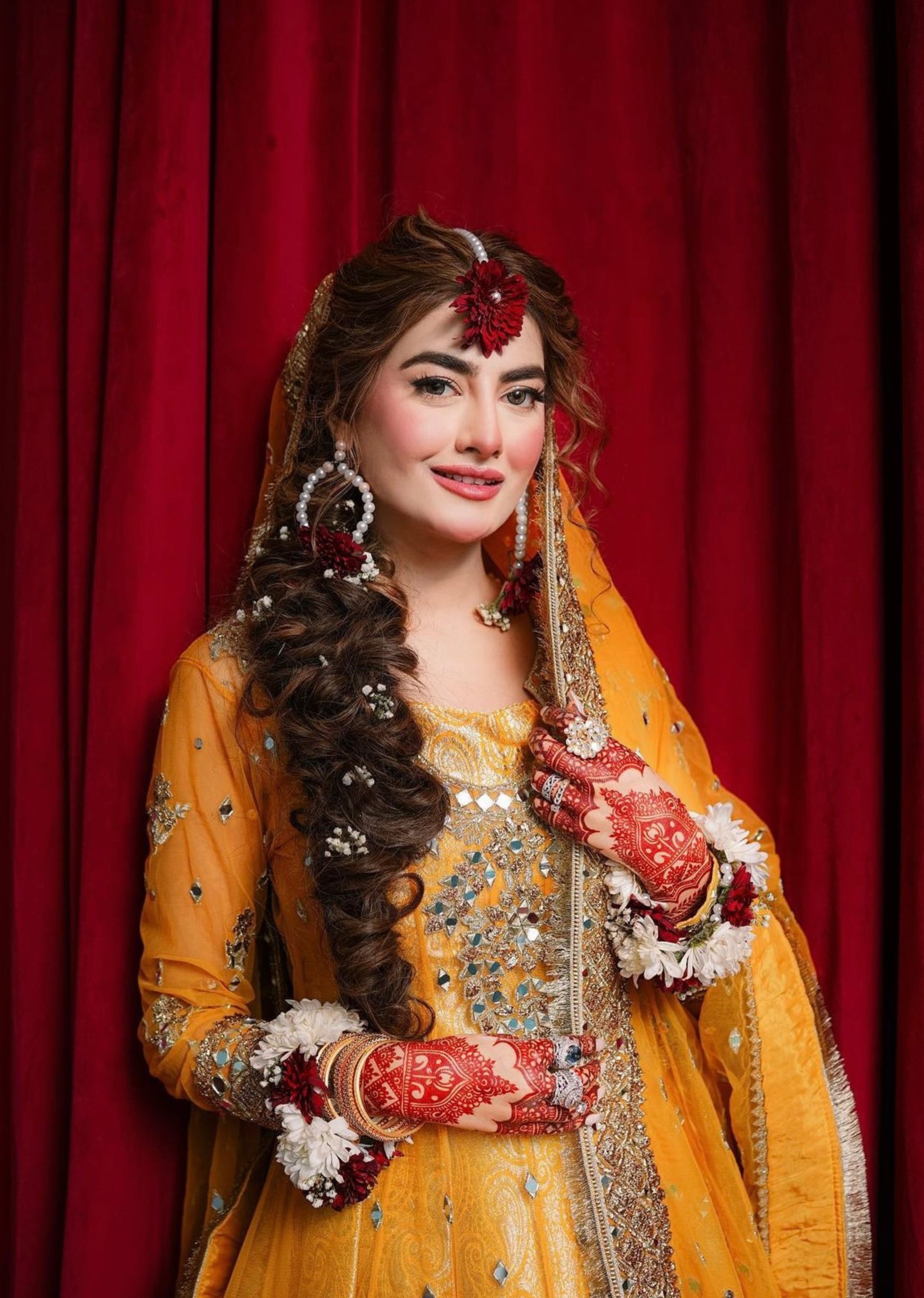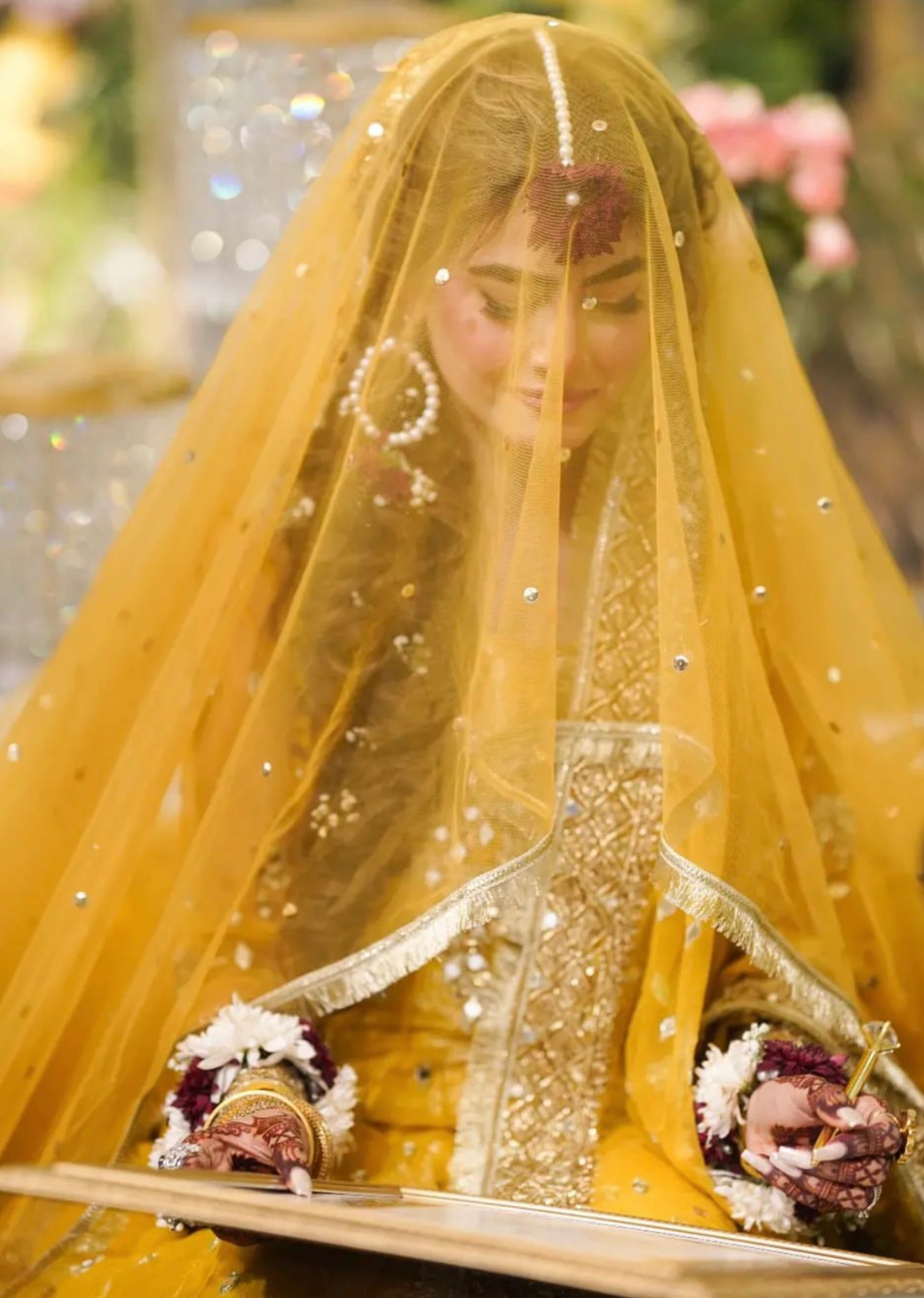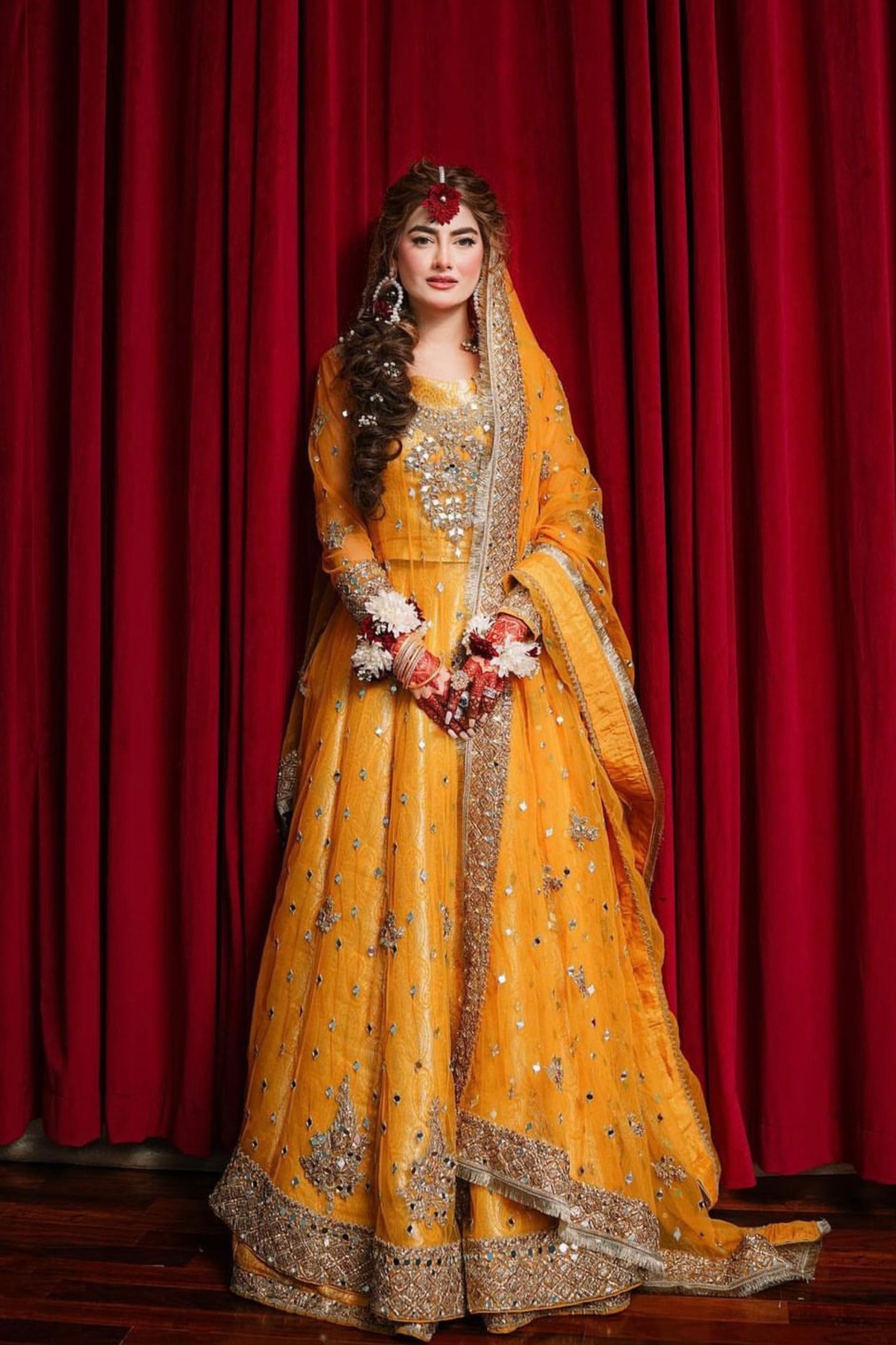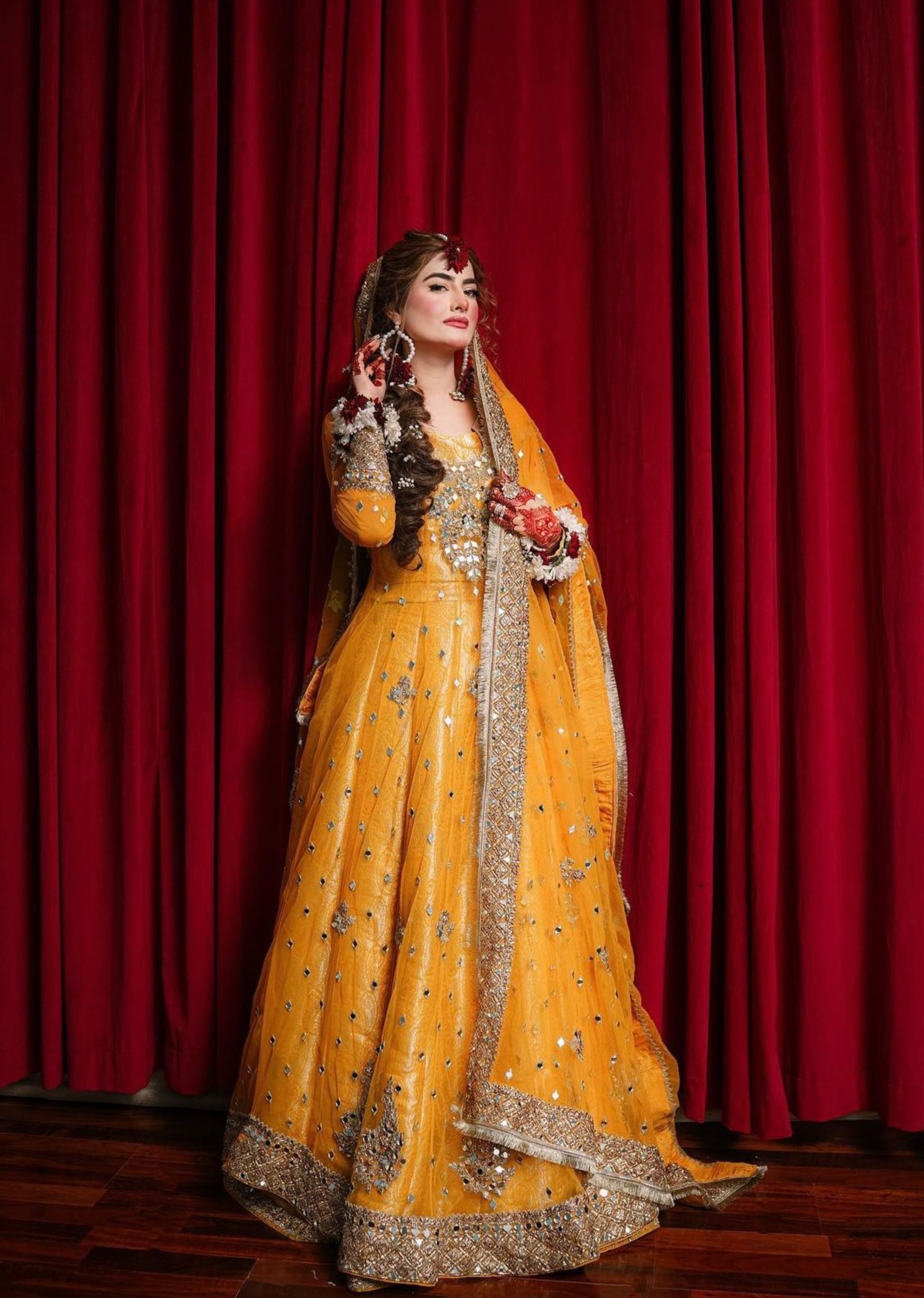 ‘Heena’ The mesmerising Yellow attire. Intricately tilla, Gotta and mirror worked anarkali and dopta consort with Atlas floral silk Lehnga, choli. Perfect Mehndi attire to oompah your bridal look.