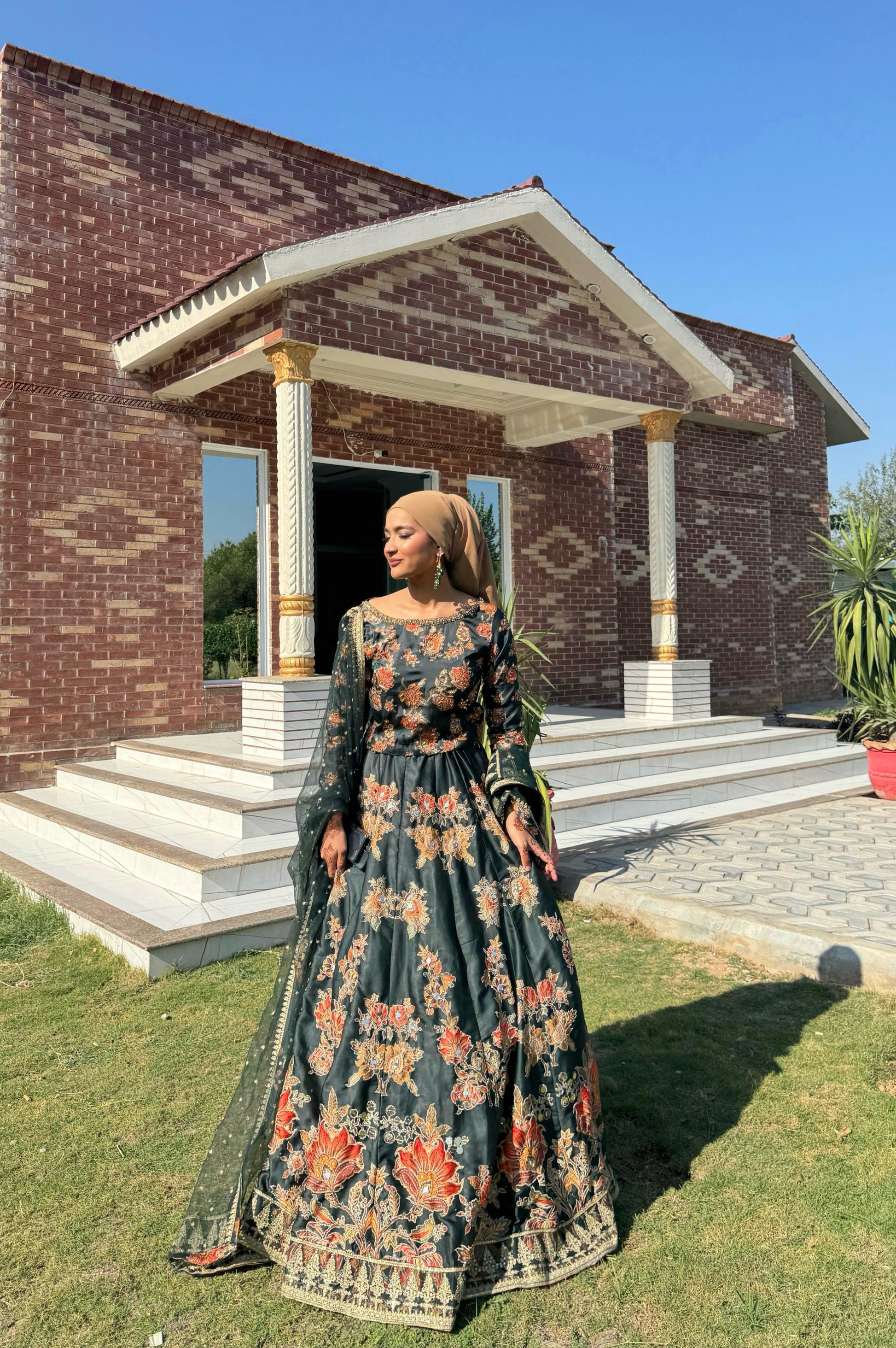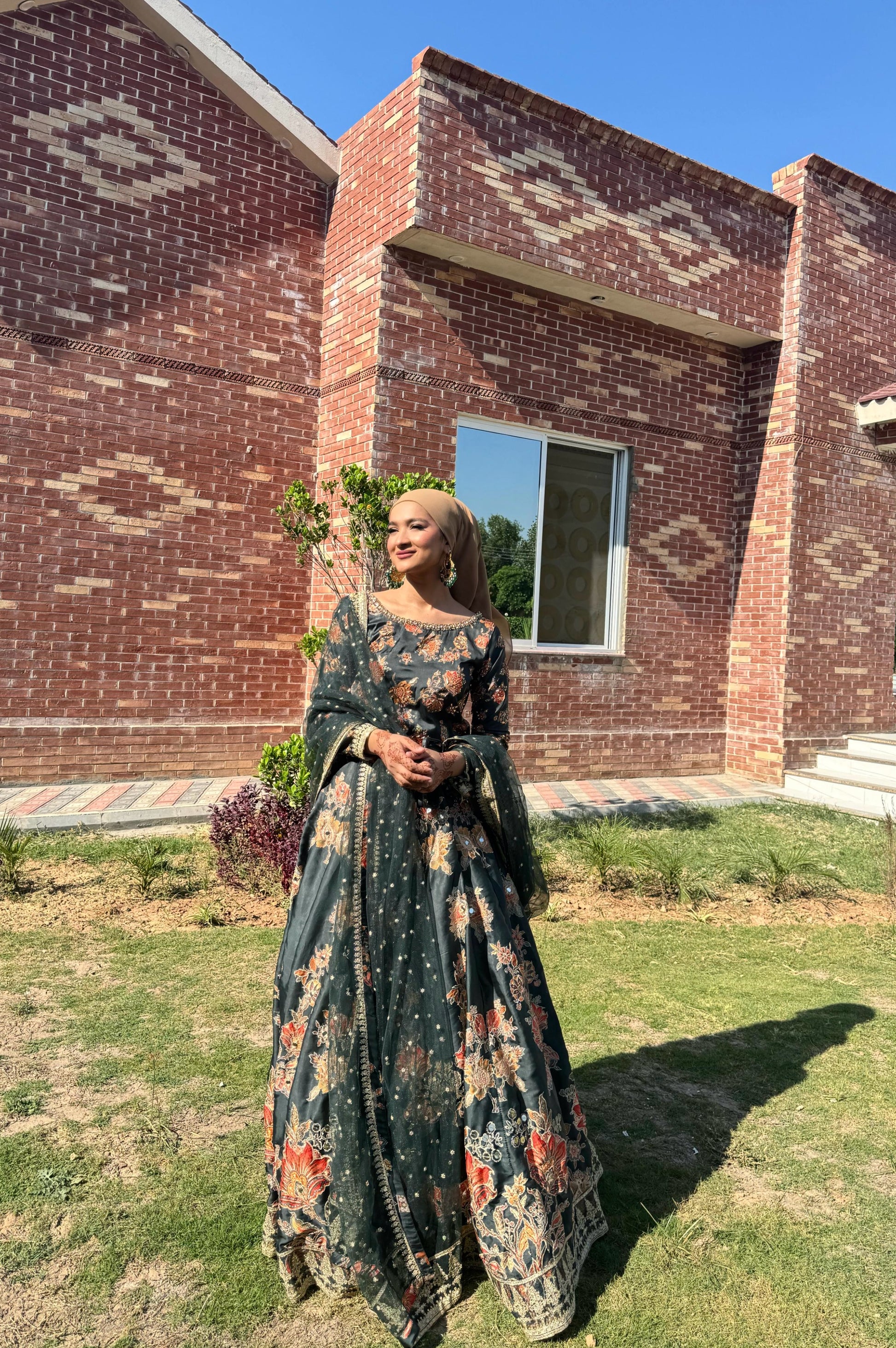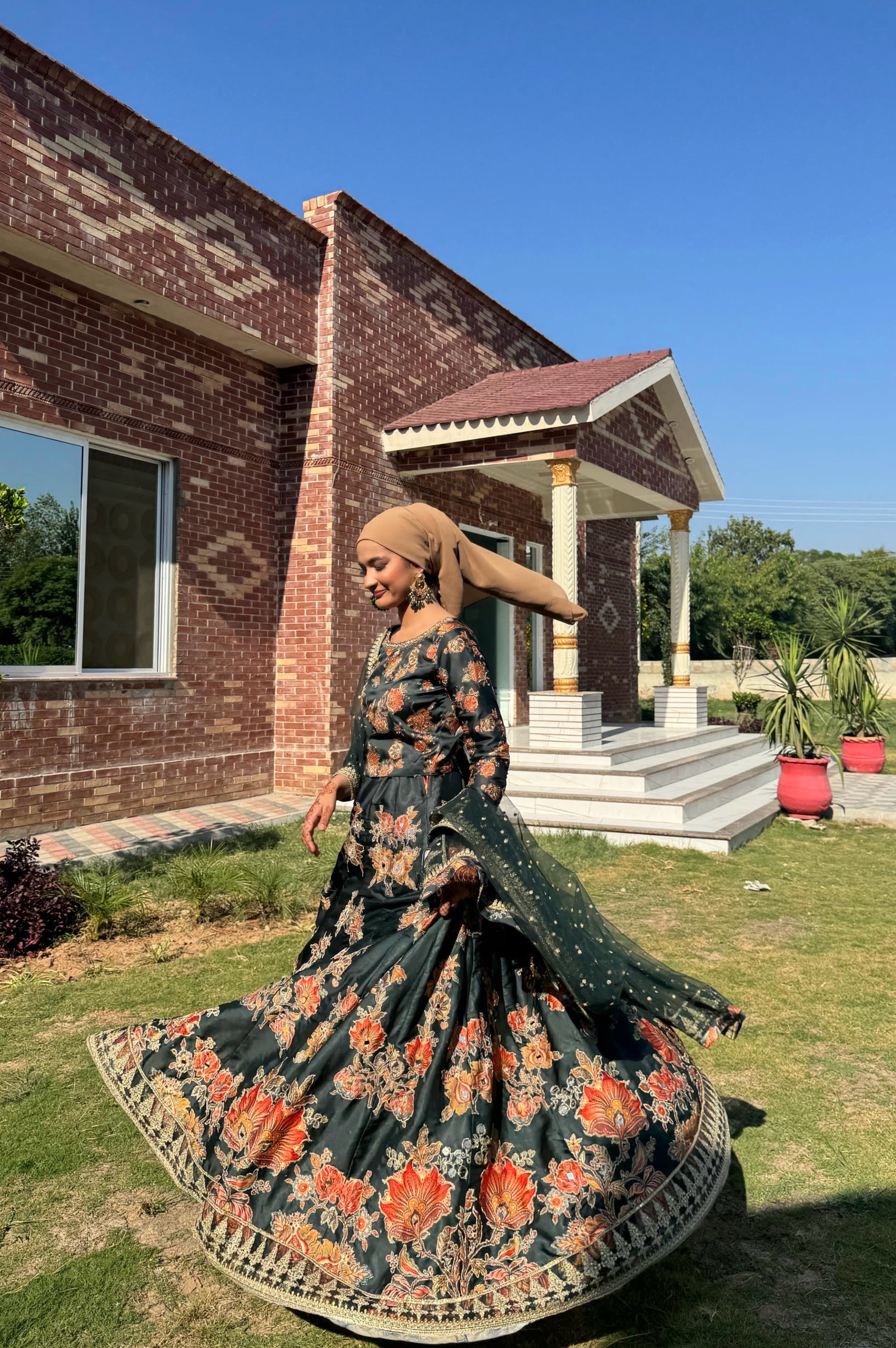 Our signature Classic styled Forest green digital printed Lehnga choli. Embellished canvas with sitara, mirror and pearls. Paired with embellished Net duppta giving it a royal Look.