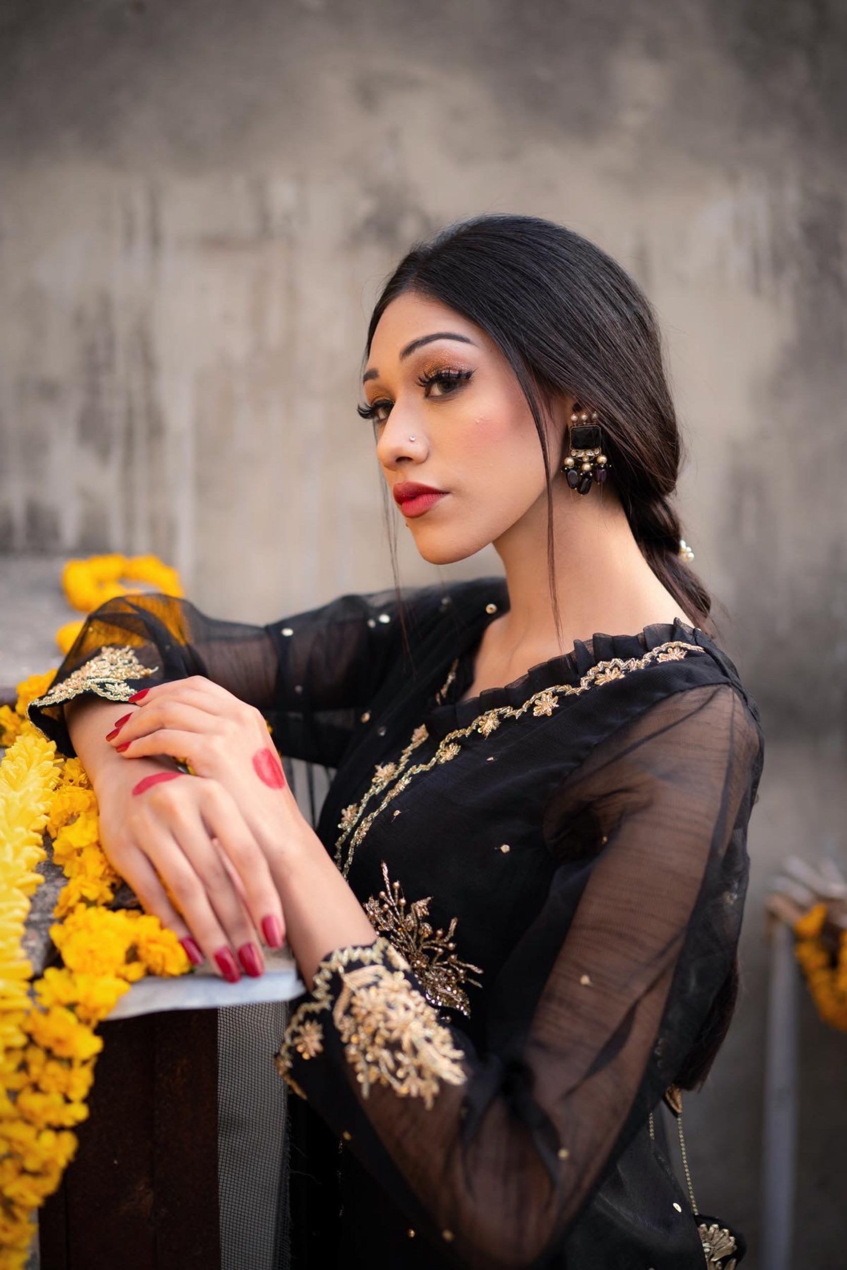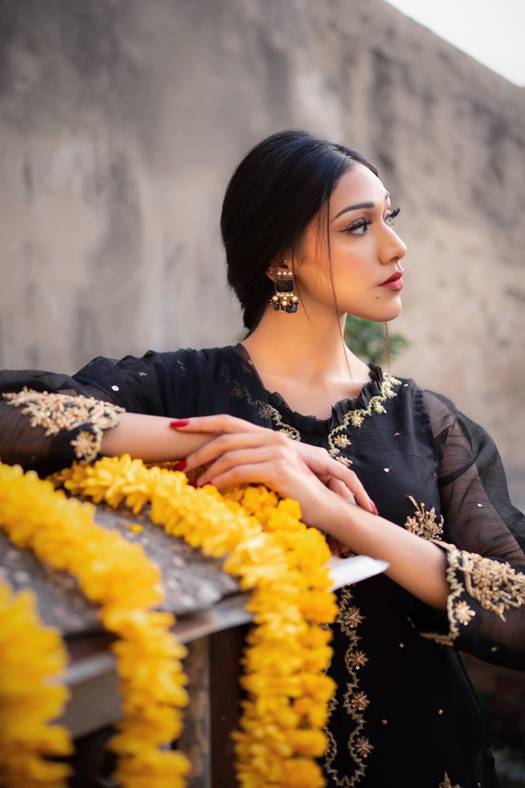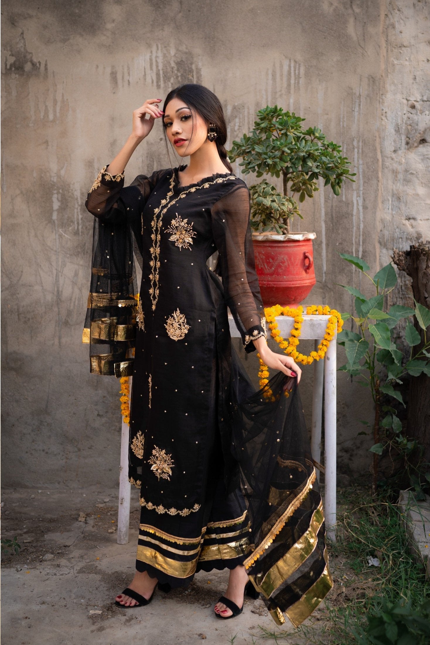Majestic black attire Embellished with dabka, naqshi, pearls and sequins. The duppta and azarr pants are adorn with indian lapa. Classic pick to amo your festive look