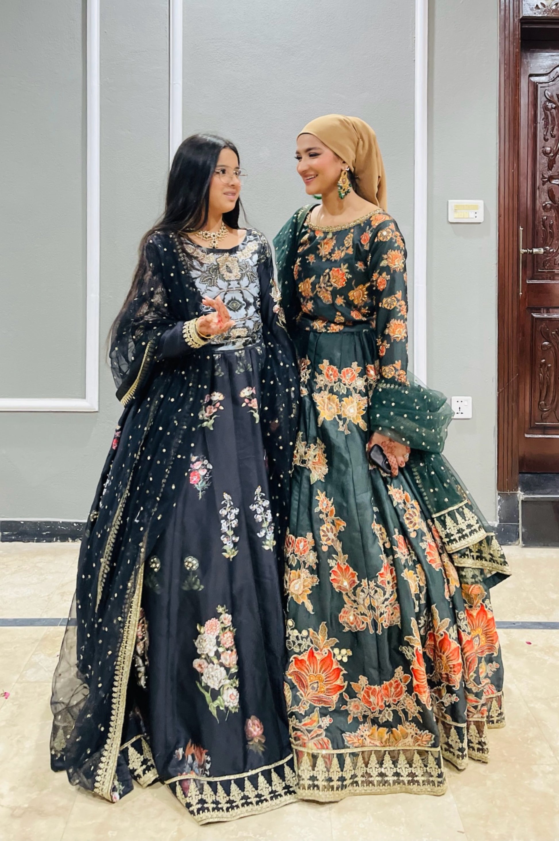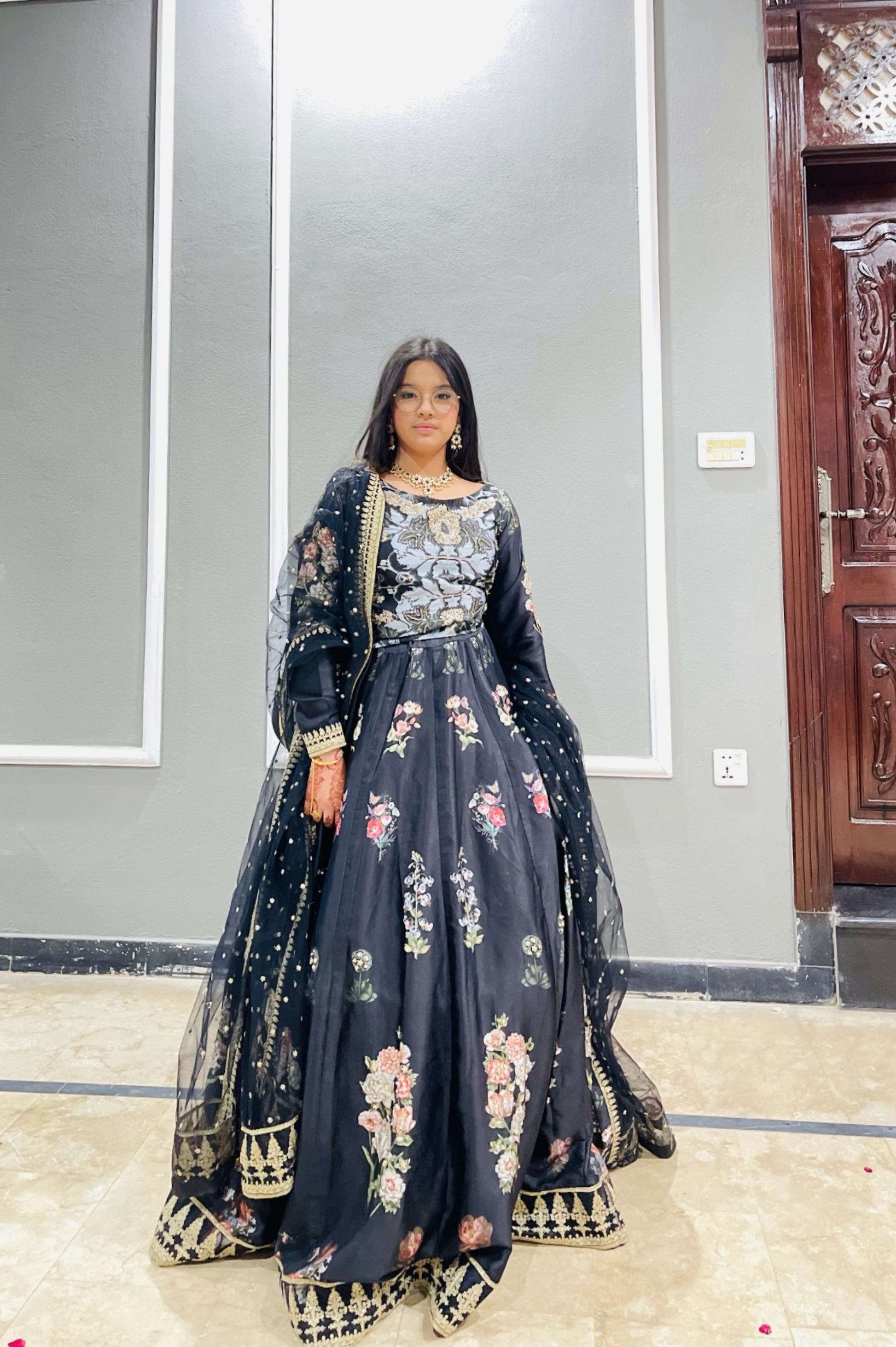 Our signature Classic styled black digital printed Lehnga choli. Embellished canvas with sitara, Dabka, naqshi and pearls. Paired with embellished Net duppta giving it a royal Look.