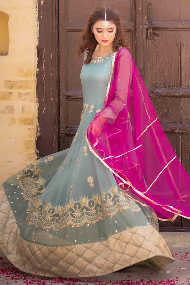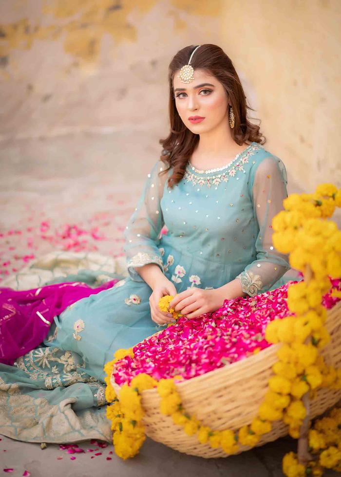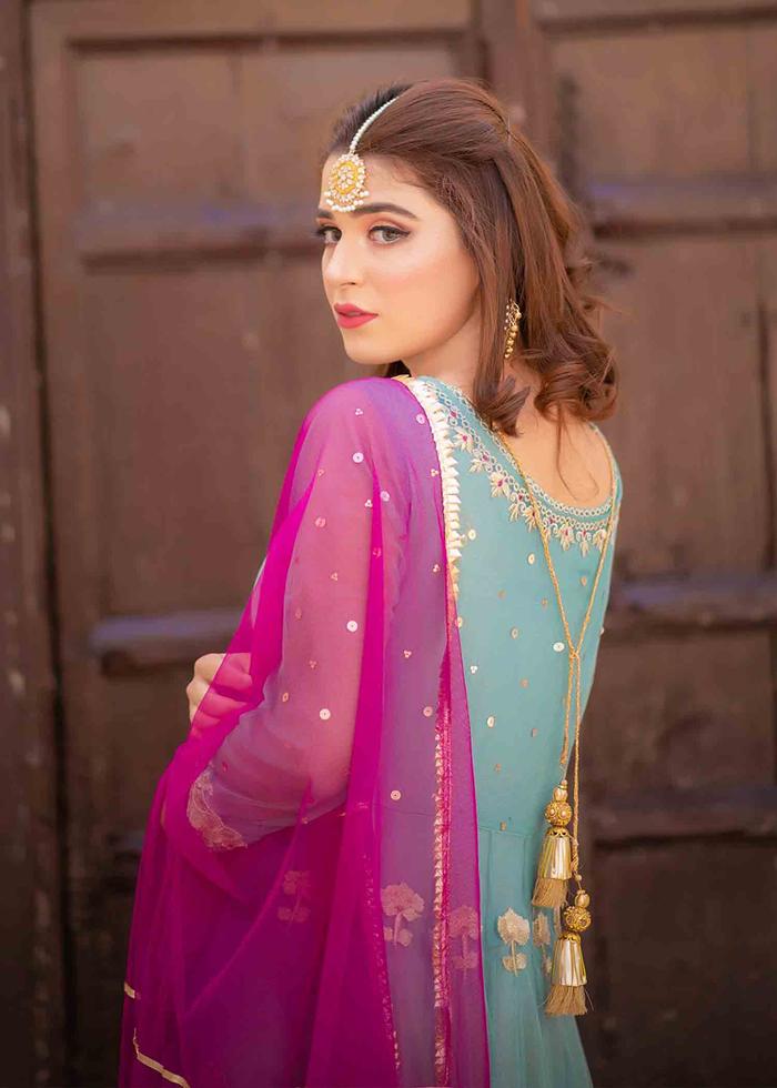 This aqua ensemble ‘komal’ from collection defête’21 featuring intricate floral motifs with touch of sequins and gotta, is classic pick for your festive look.