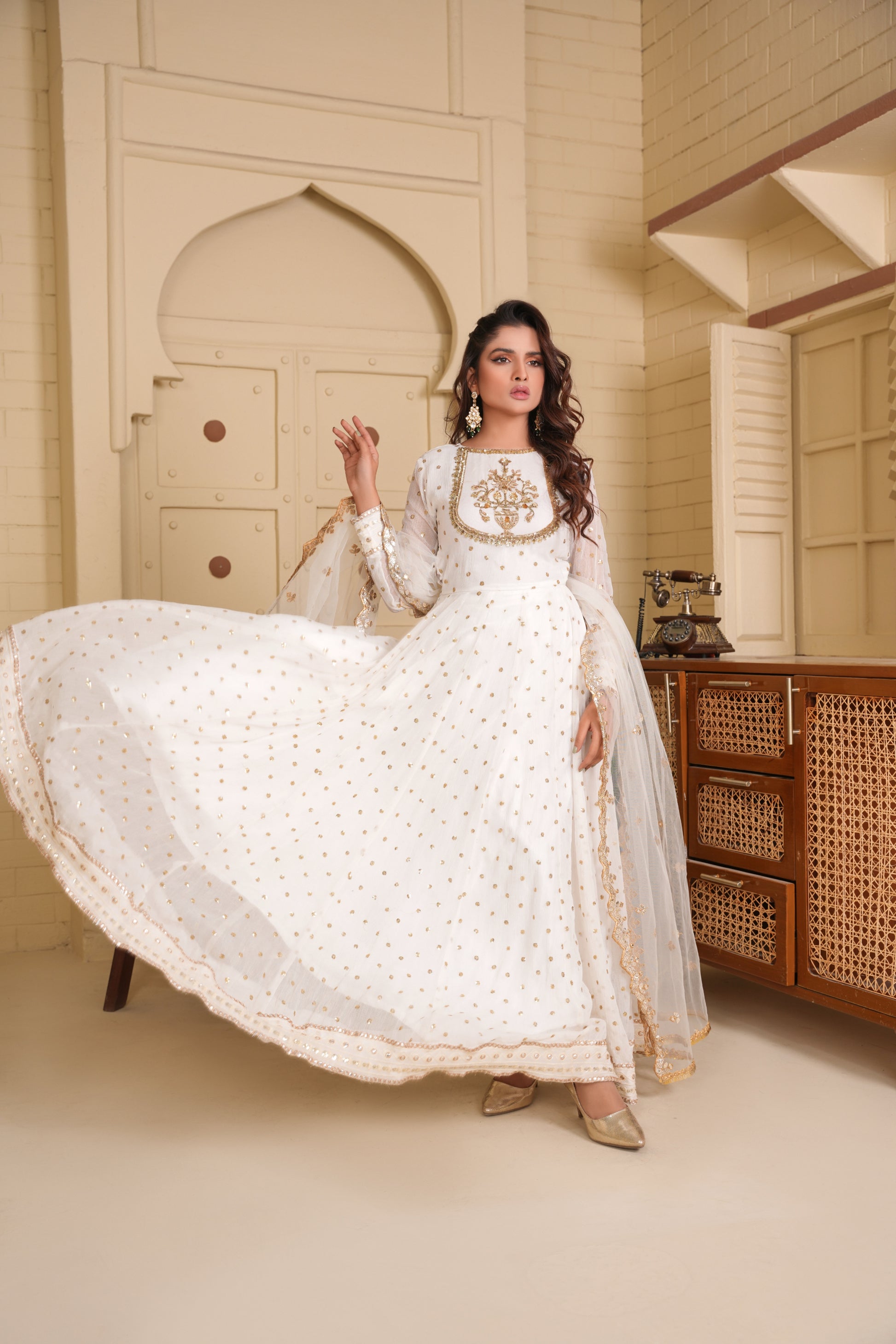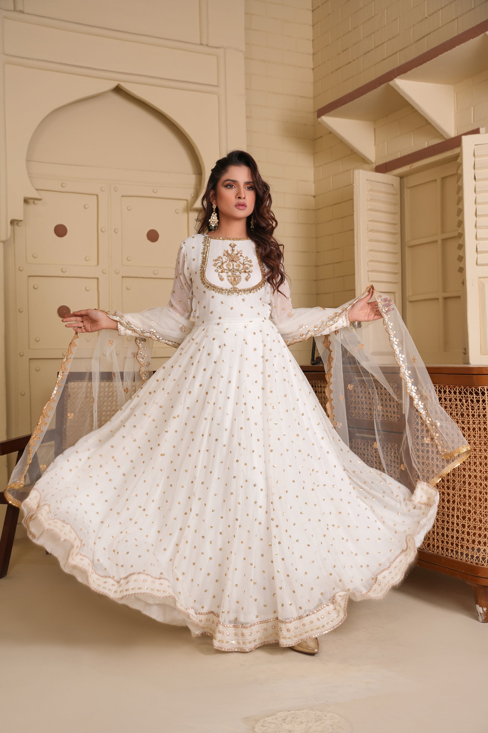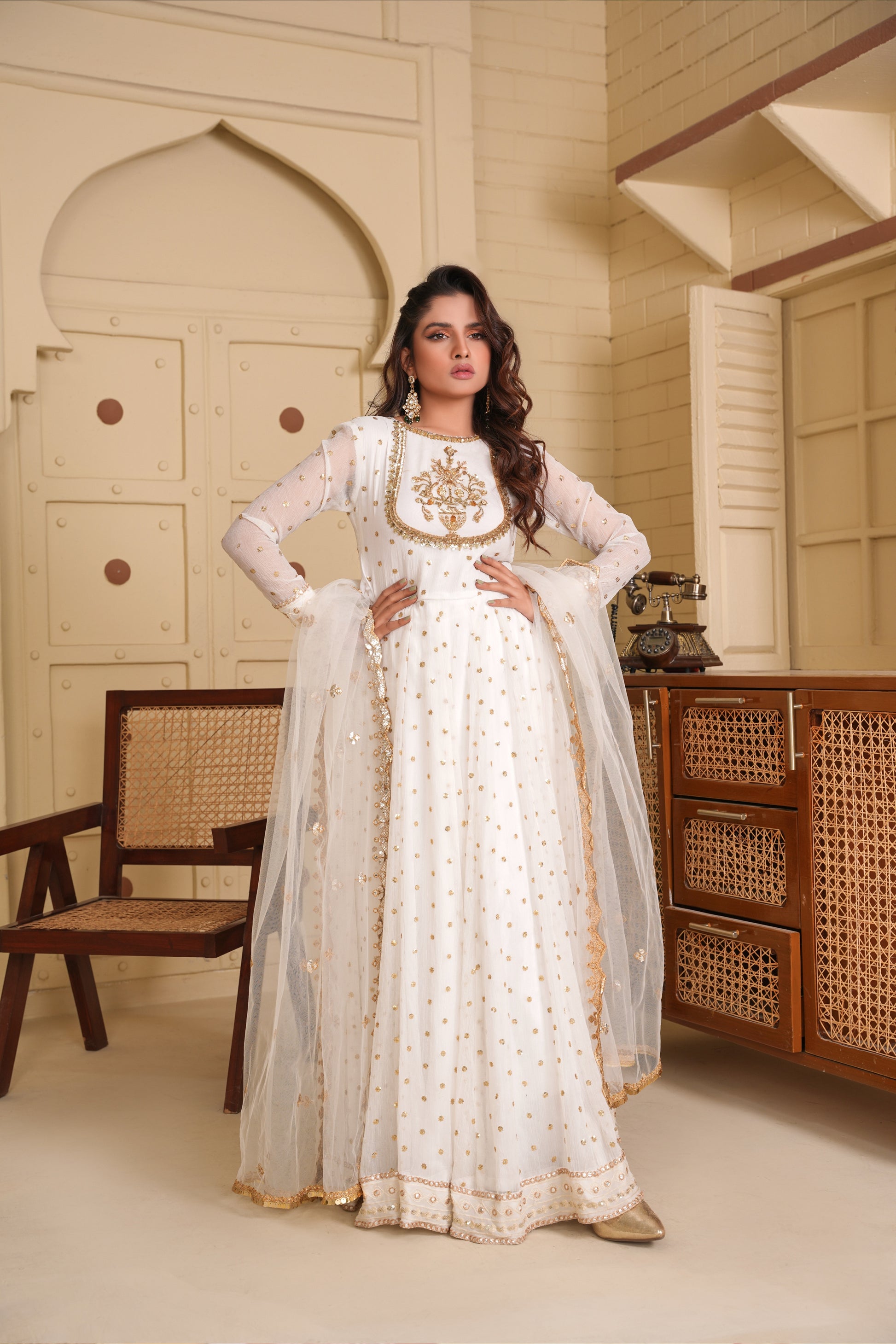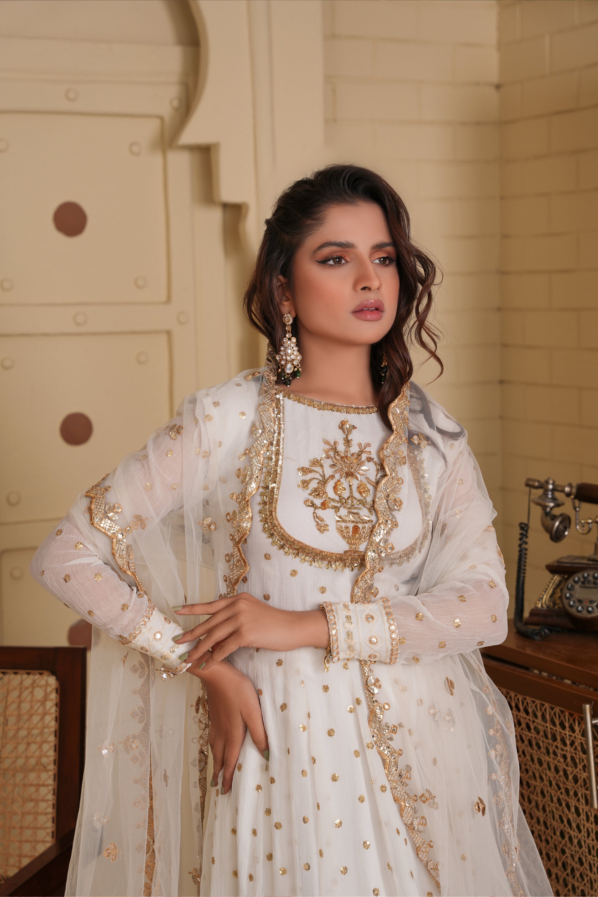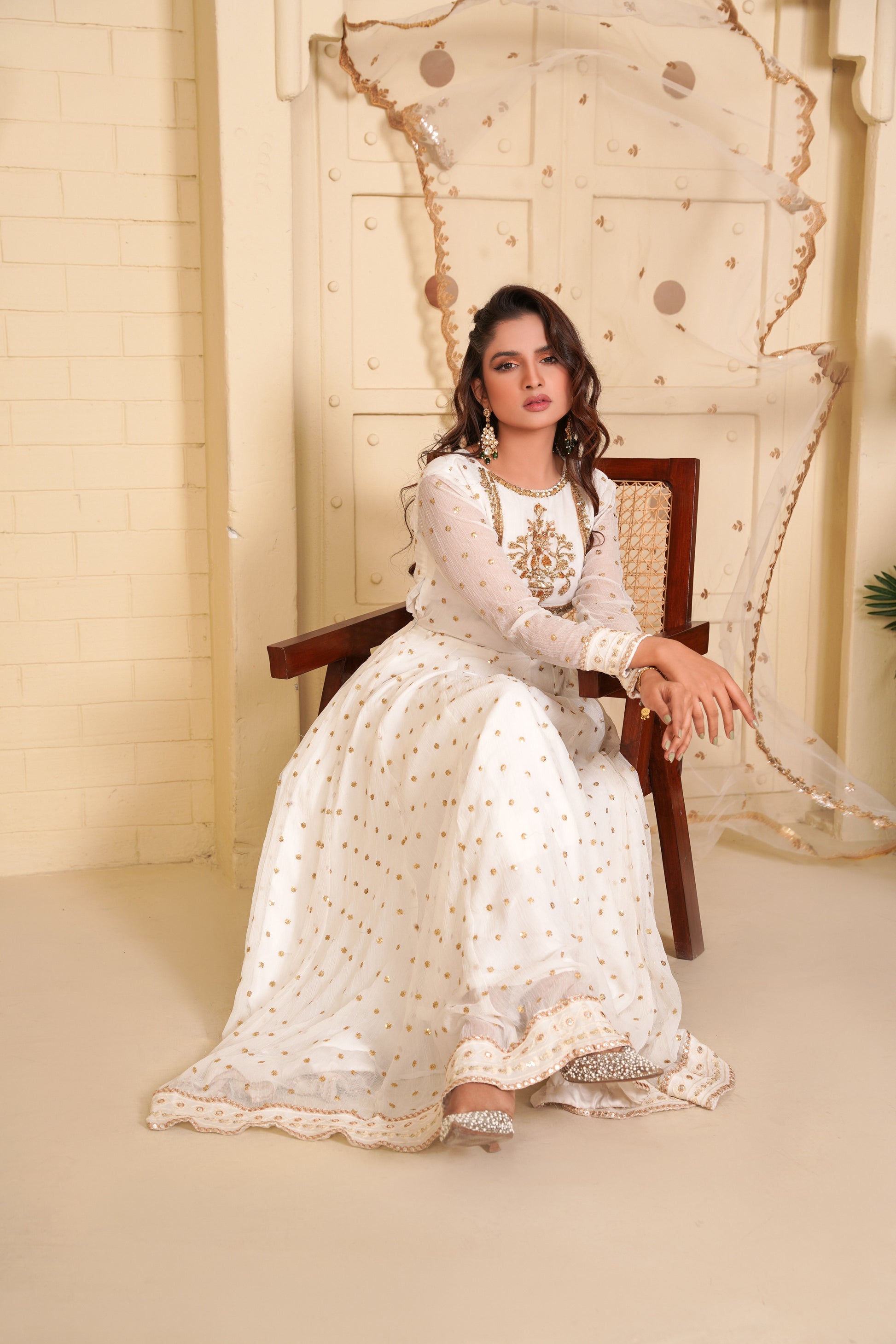 Mah - e - rooh - they say white is color of Grace, but we believe its not just a color its a feeling , state of being, reflection of inner grace . Beautifully executed anarkali timeless canvas of intricate details. This pick make you real head turner of the event