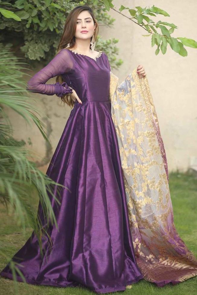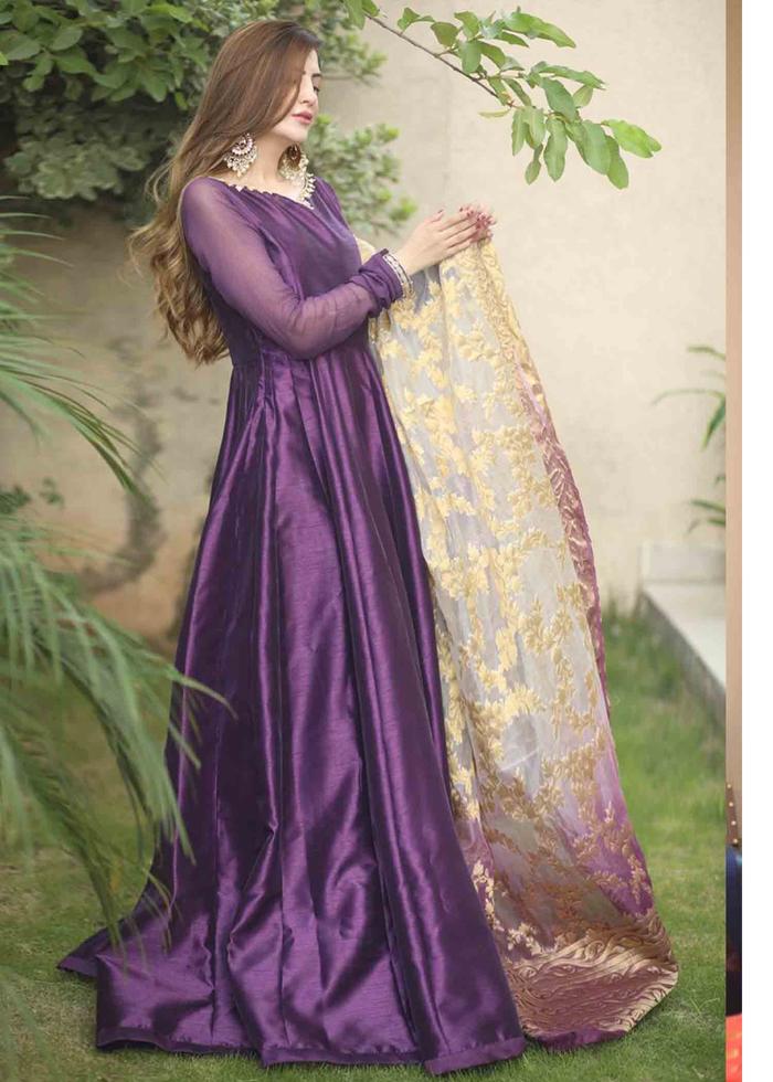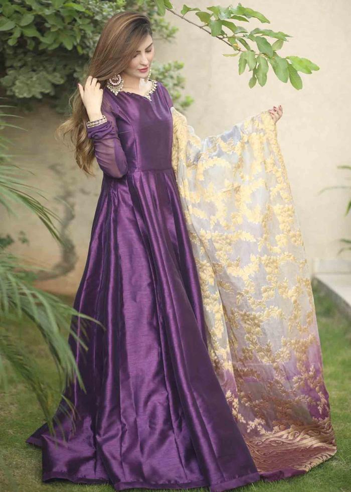This eggplant purple gown beautifully tailored in full length style. Embellished neckline with kora dabka and sequins. Organza jamawar ombre dopta is giving it its whole look. Its such a elegent pick to allure your festive look.