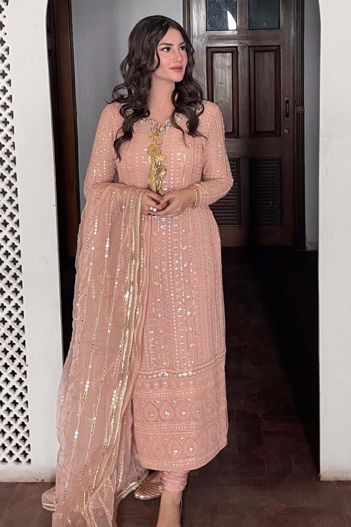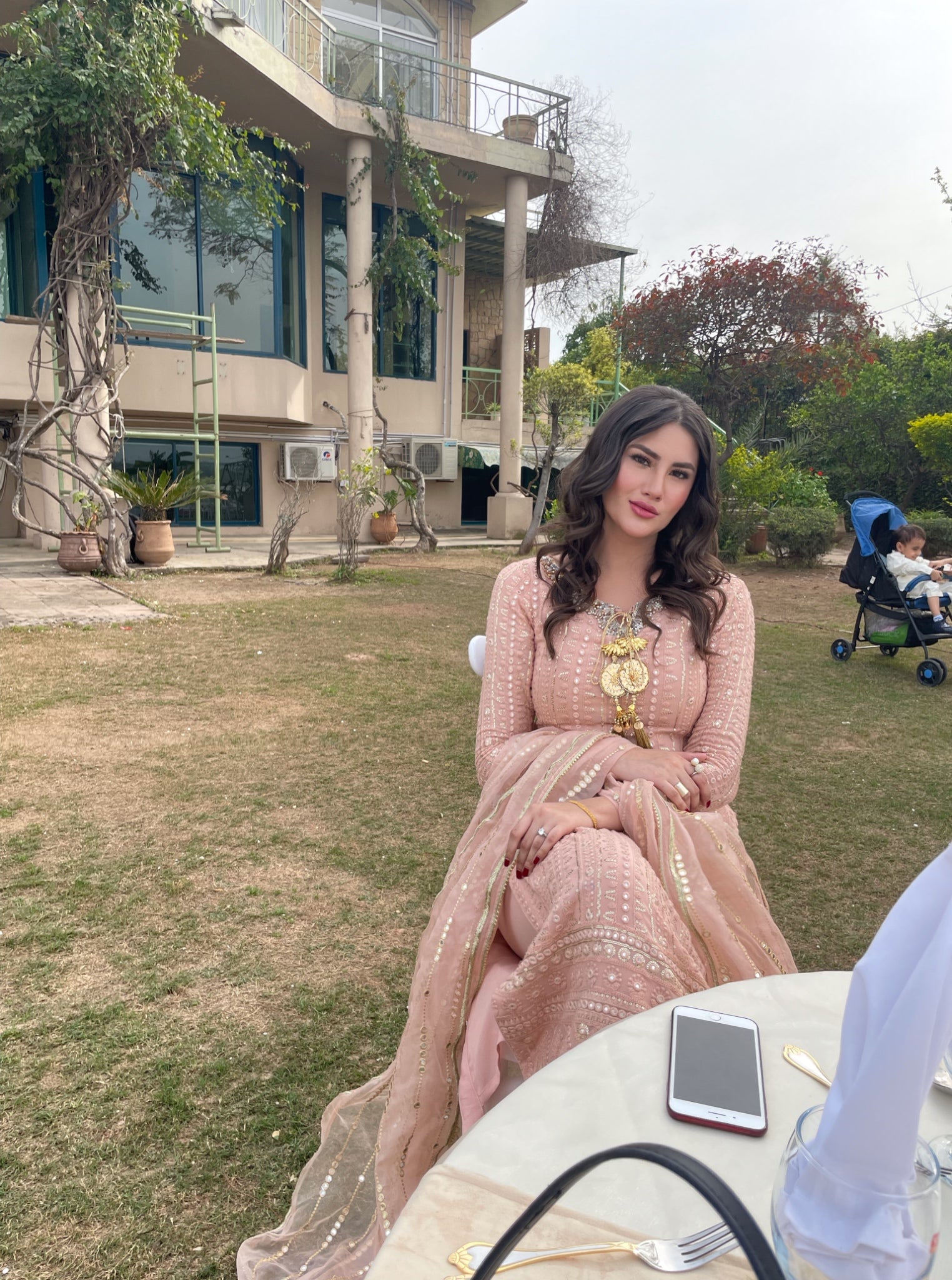 Tari is a blush pink chicken kaari three-piece featuring an embellished neckline and sleeves in a gold hue. Combined with an organza dupatta adorned with embroidered line & choori daar pajama, this look is a must have!