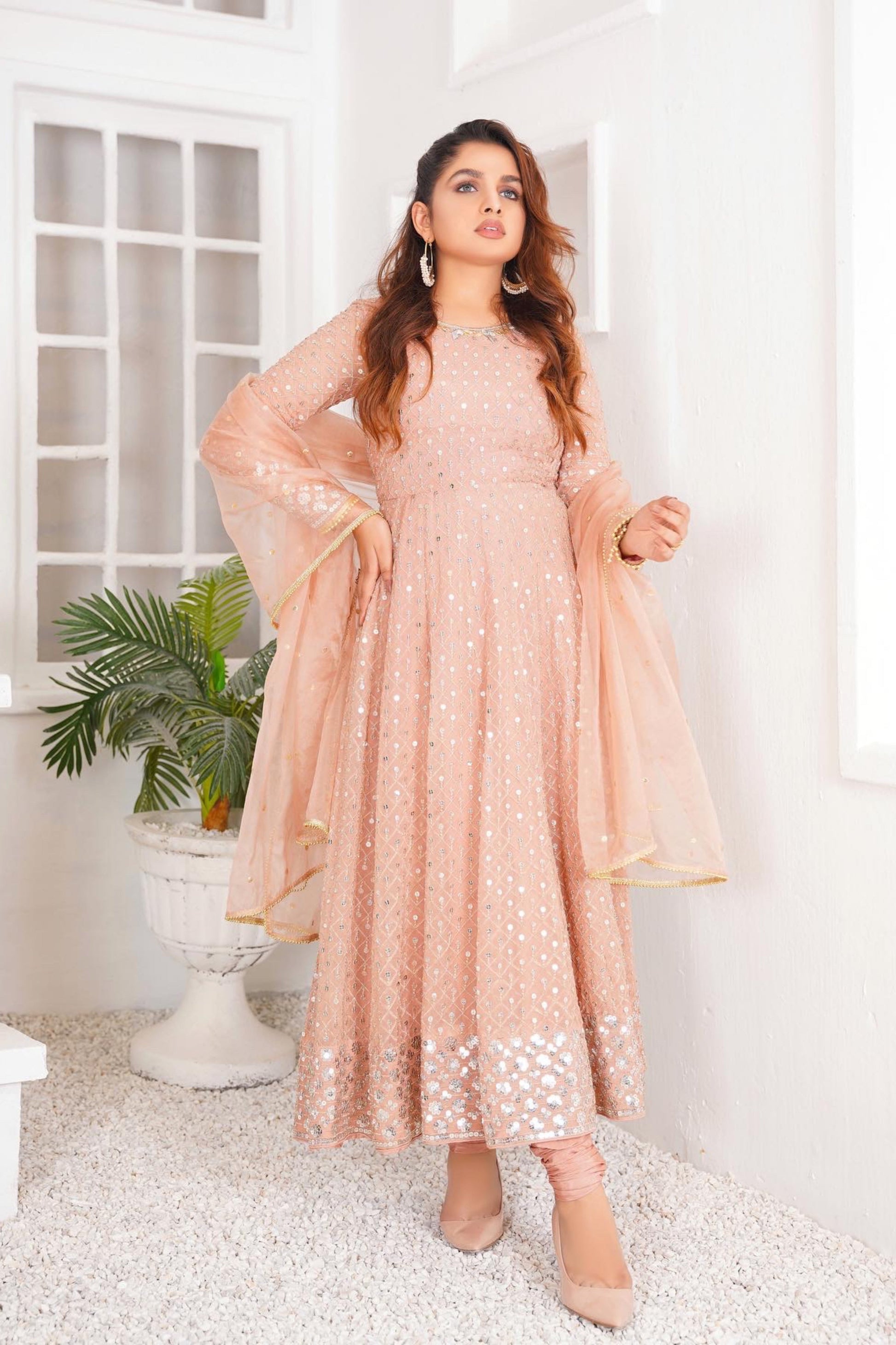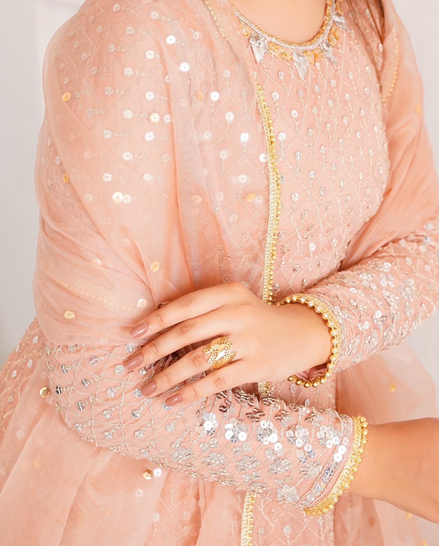 Neena - The mesmerising peach hued chickenkari attire. Orient geometric jaal giving it pleasing look. Traditional handwork on the neckline and embellishments bring out the grandeur of festive attire.