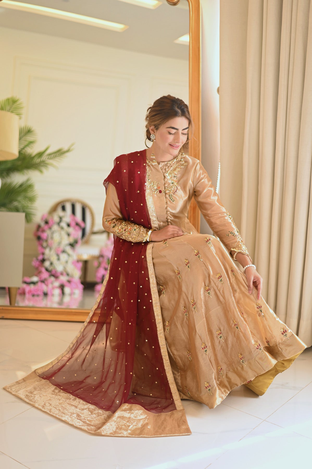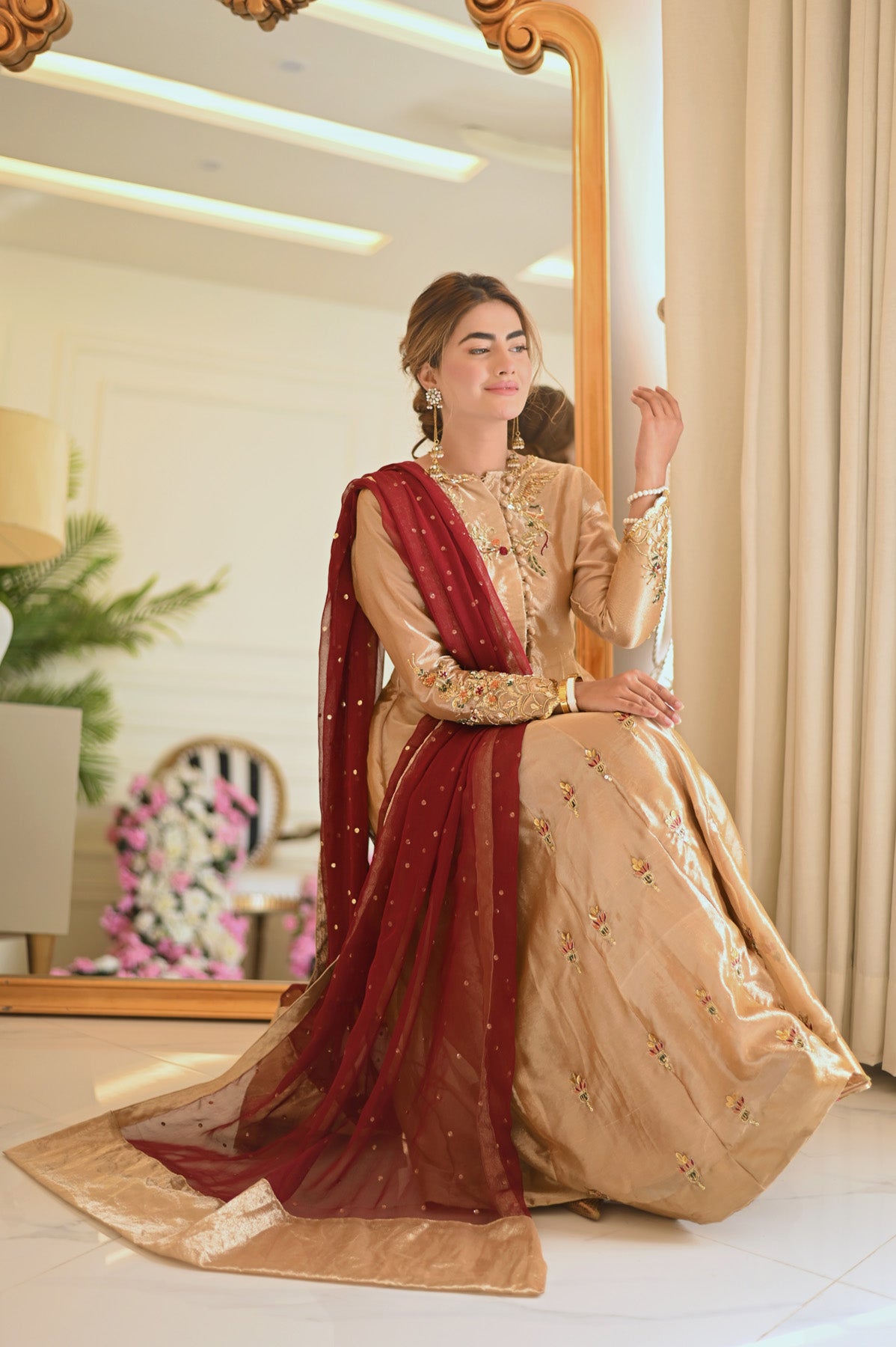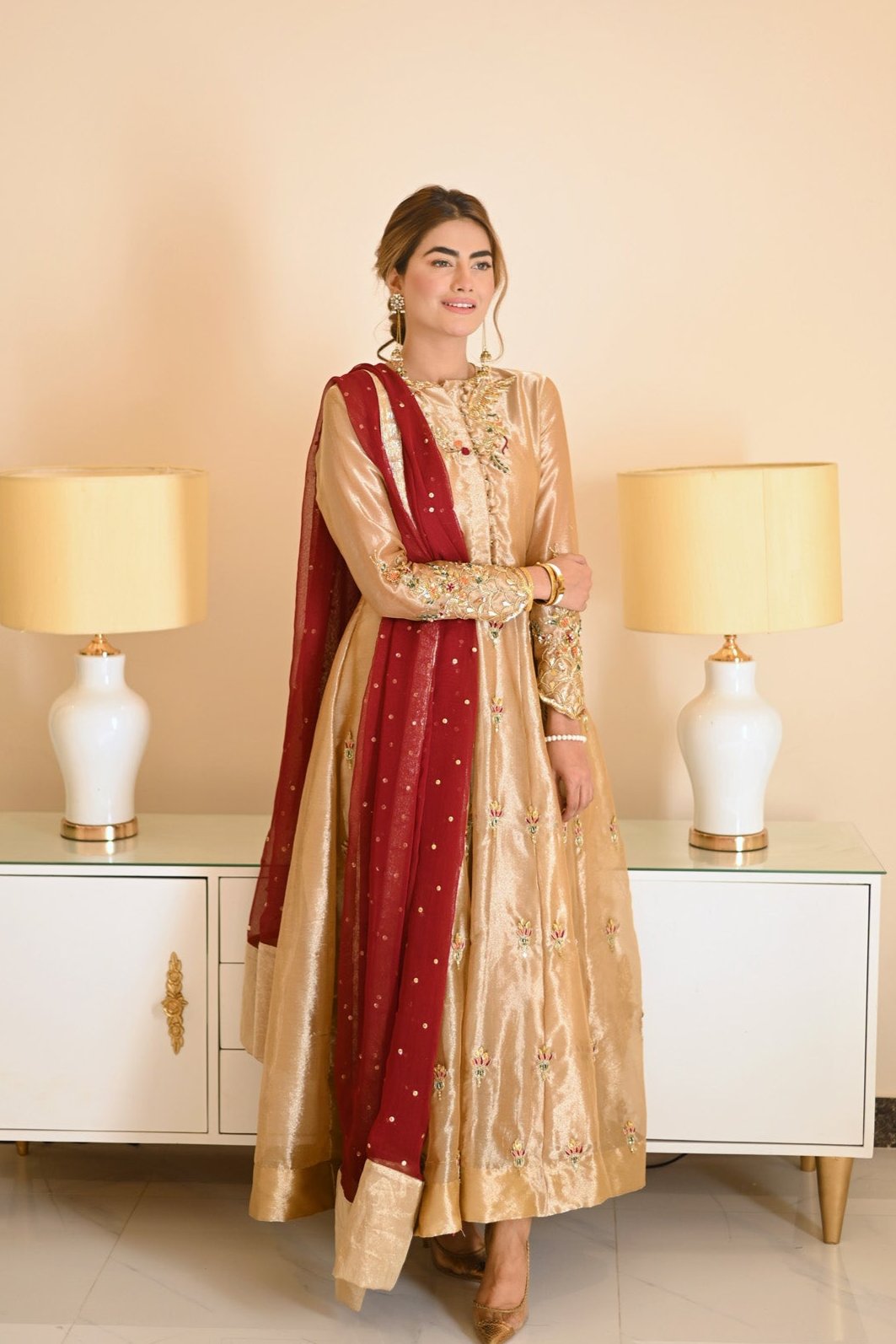 This exquisite gold tissue kalidar features hand embellishments all over. The delicately designed bodice enhanced by button details makes it stand out. Combined with a chiffon dupatta, this exquisite look is a must have!