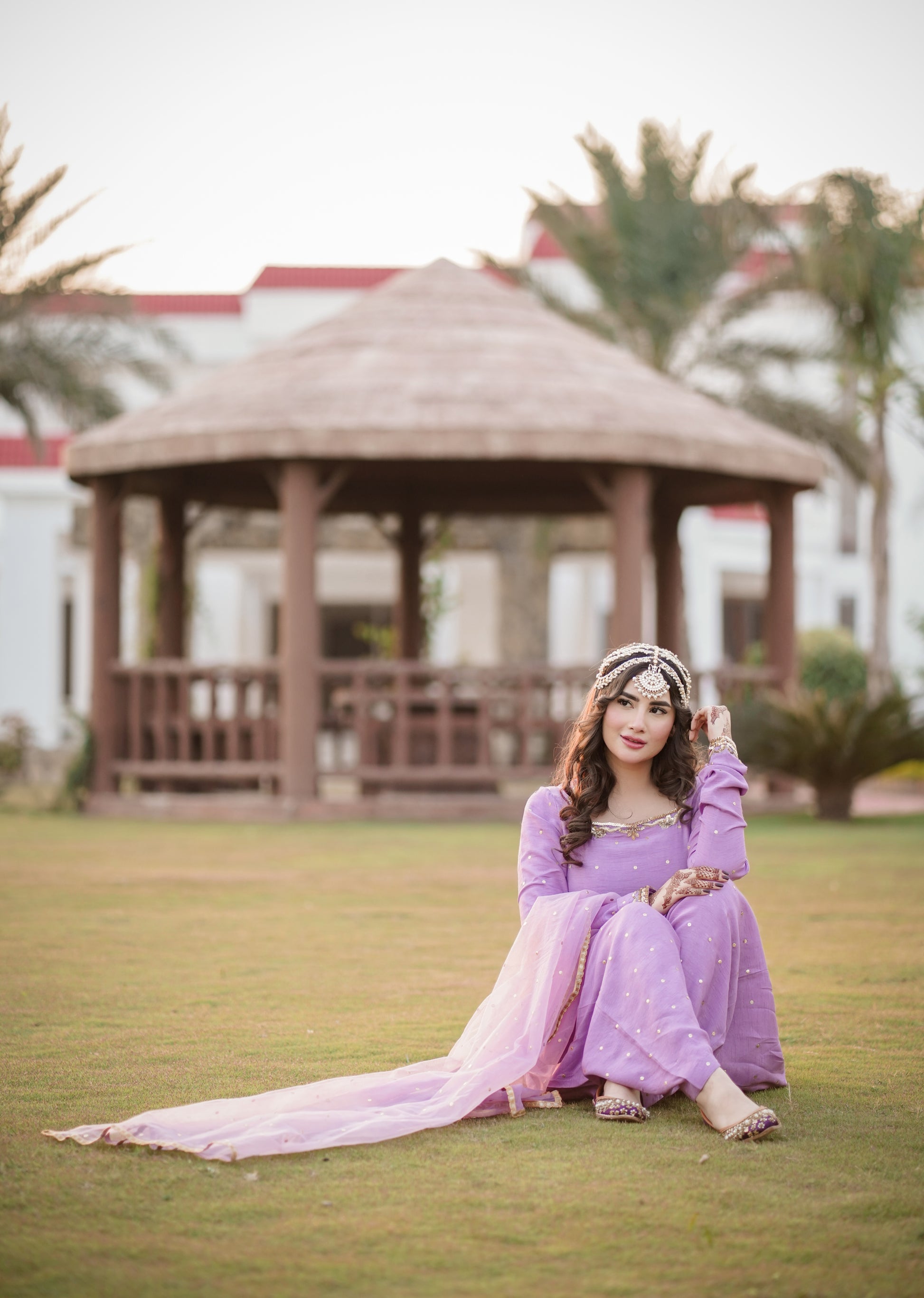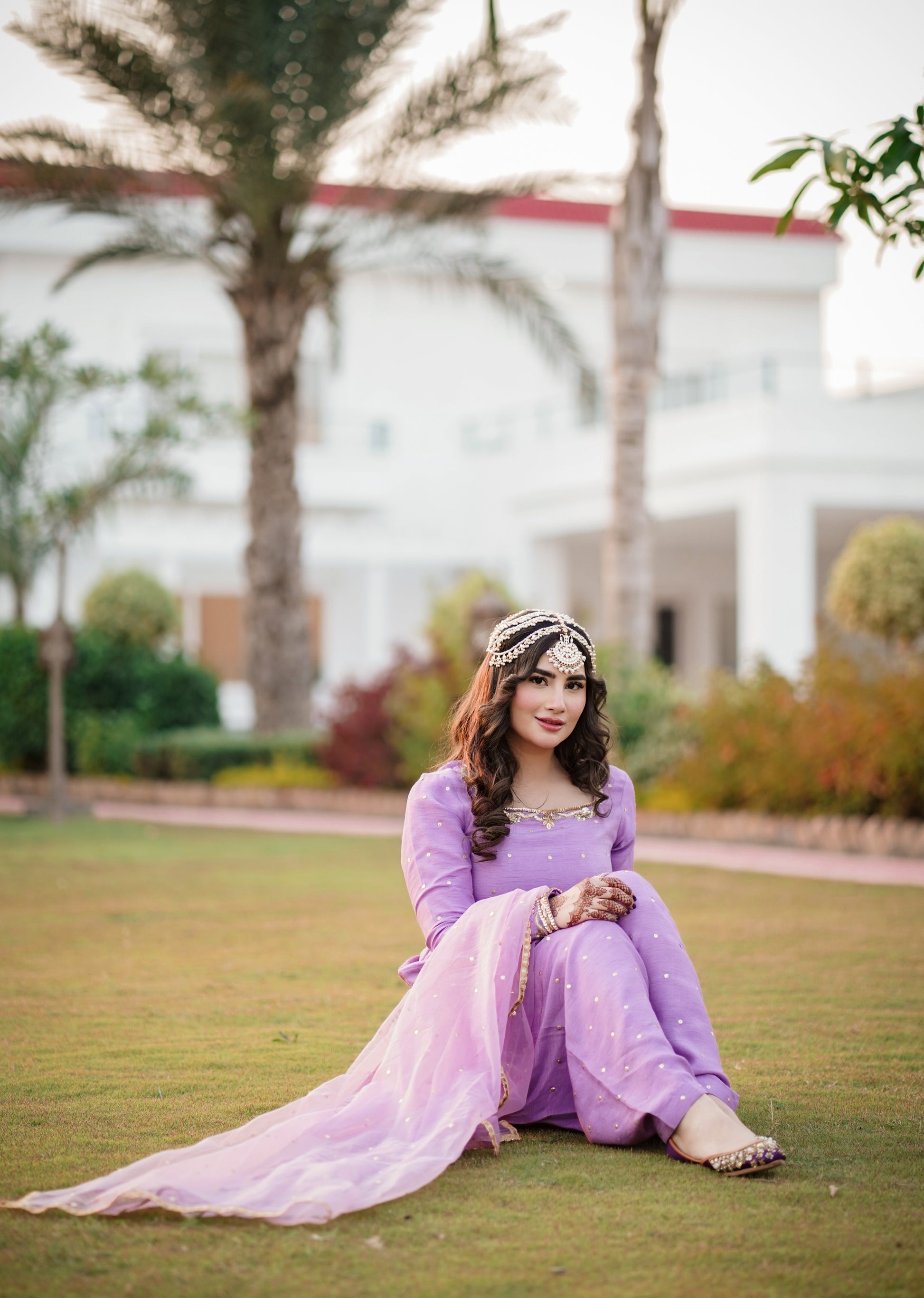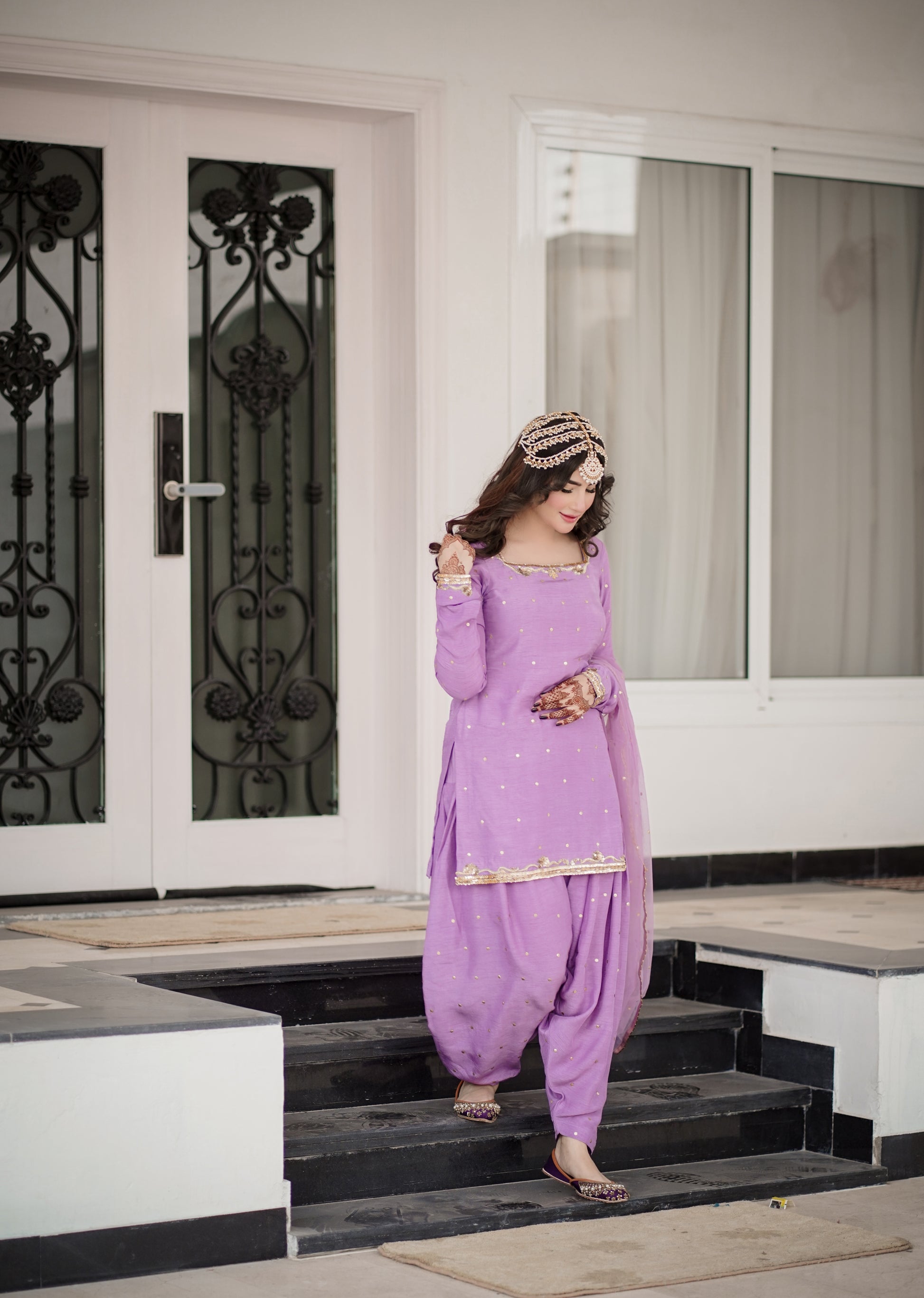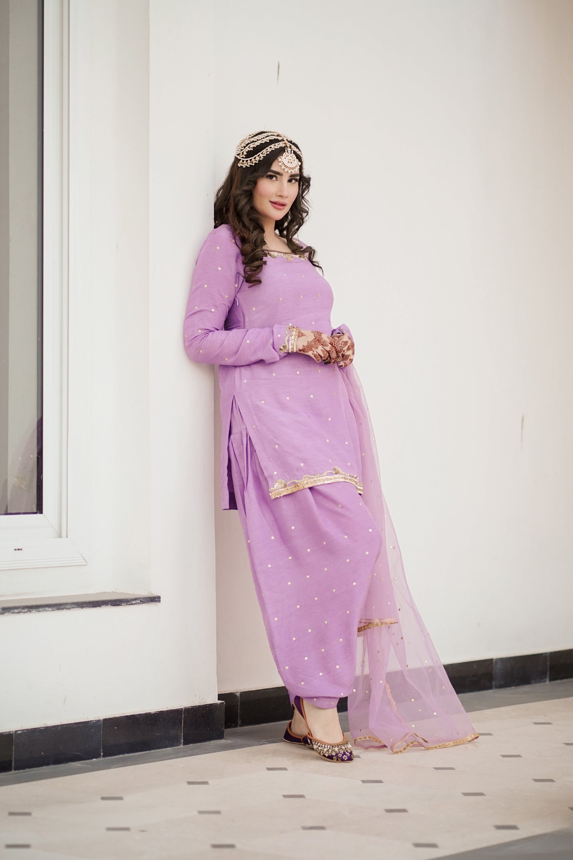 Beautiful liliac shalwar qameez is very traditional silhouette. Neckline and sleeves are embellished with golden dabka, naqshi. Sequin and cutdana work. Net dopta is finished with lais edging. Perfect pick for your desi Events.