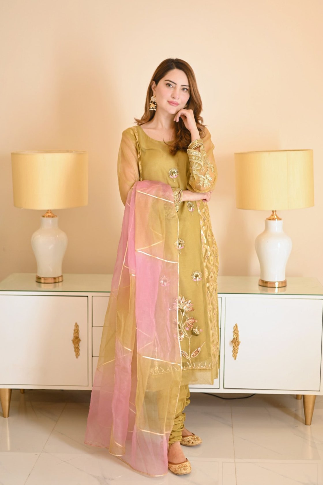 Like a breath of fresh air, this lime yellow ensemble Raya is crafted from organza. It features hand embellishments in gold & pink, combined with trousers and a multicolored organza dupatta. This look will make you stand out this season.