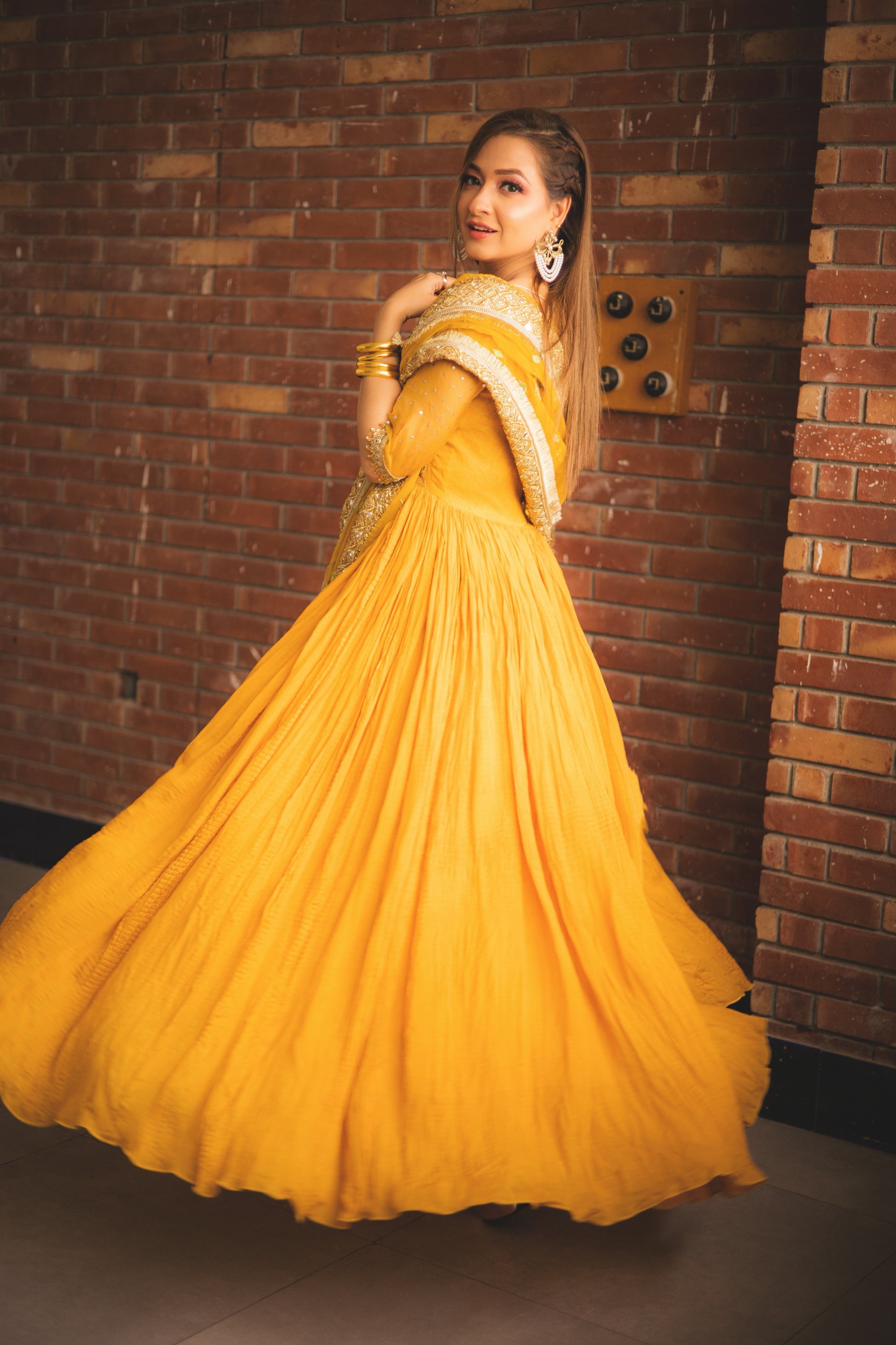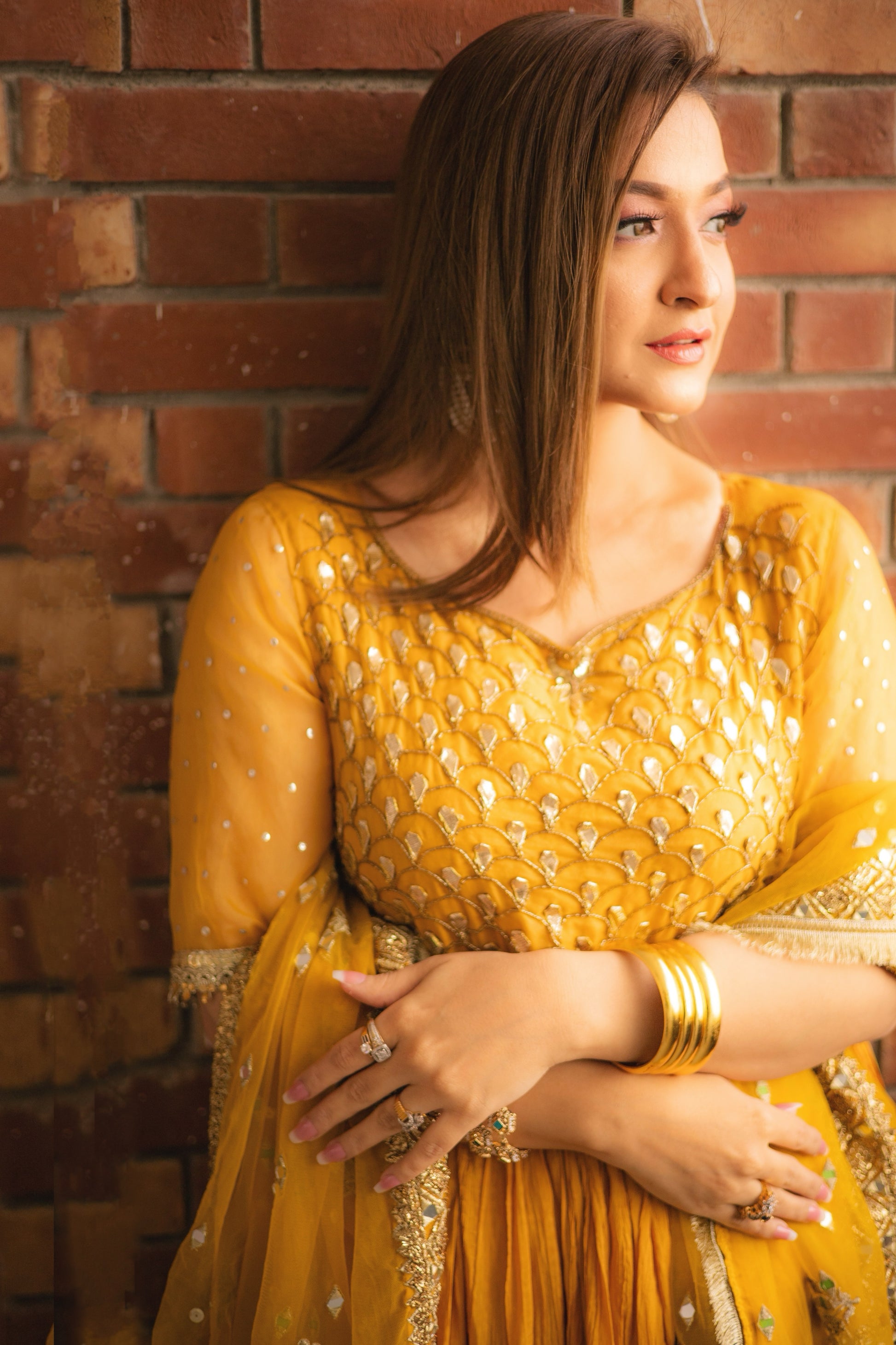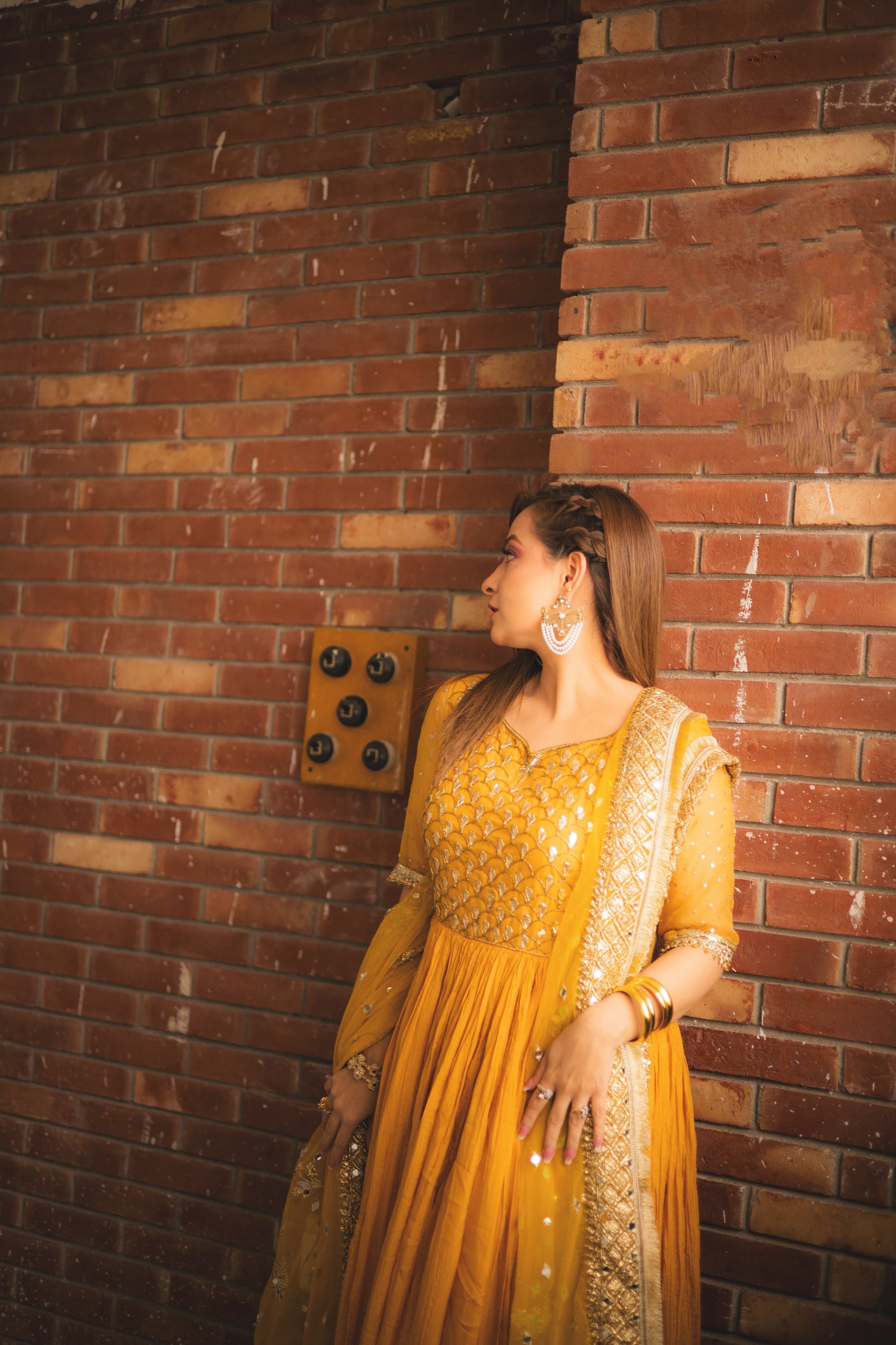 Beautifully tailored mustard yellow pishwas. Intricately hand embellished with Gotta , sequins, diamonties and sitara. Perfect pick to amph your festive look.