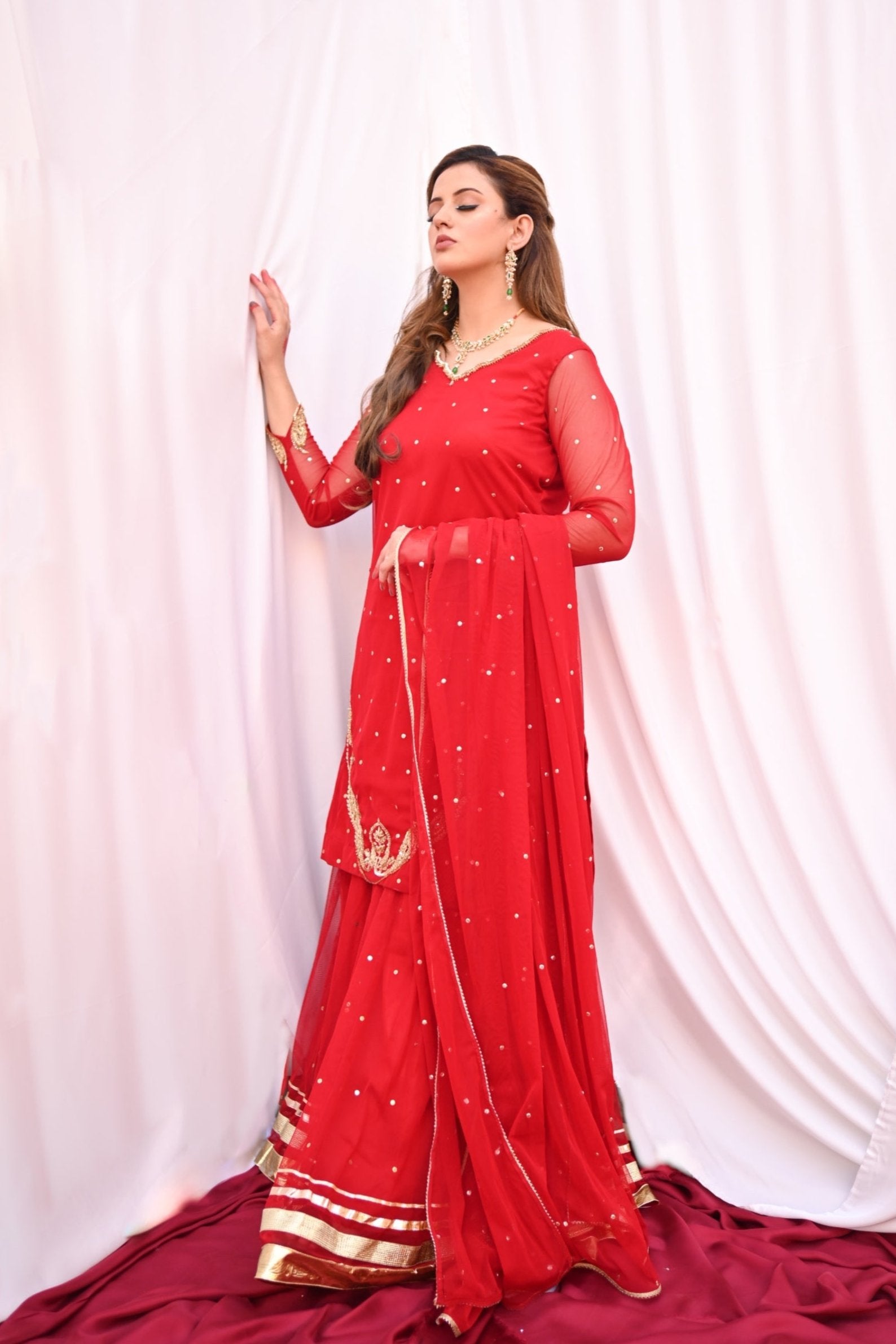 Beautiful Deep red attire. Shirt has hand embellished daman and sleeves, detailed with dabka naqshi and pearls. Duppta have sequin spray on it. Perfect pick to amph your festive look.