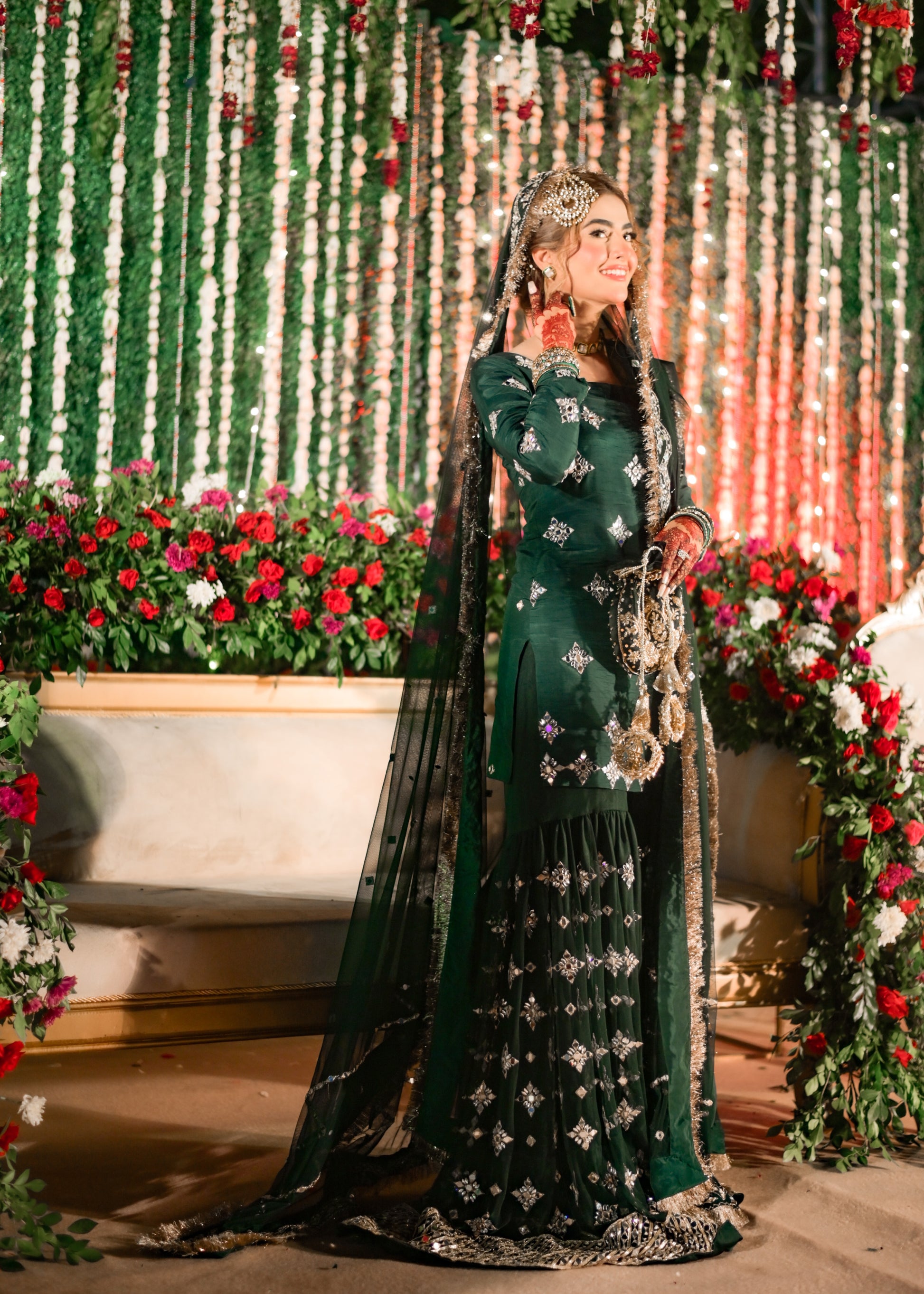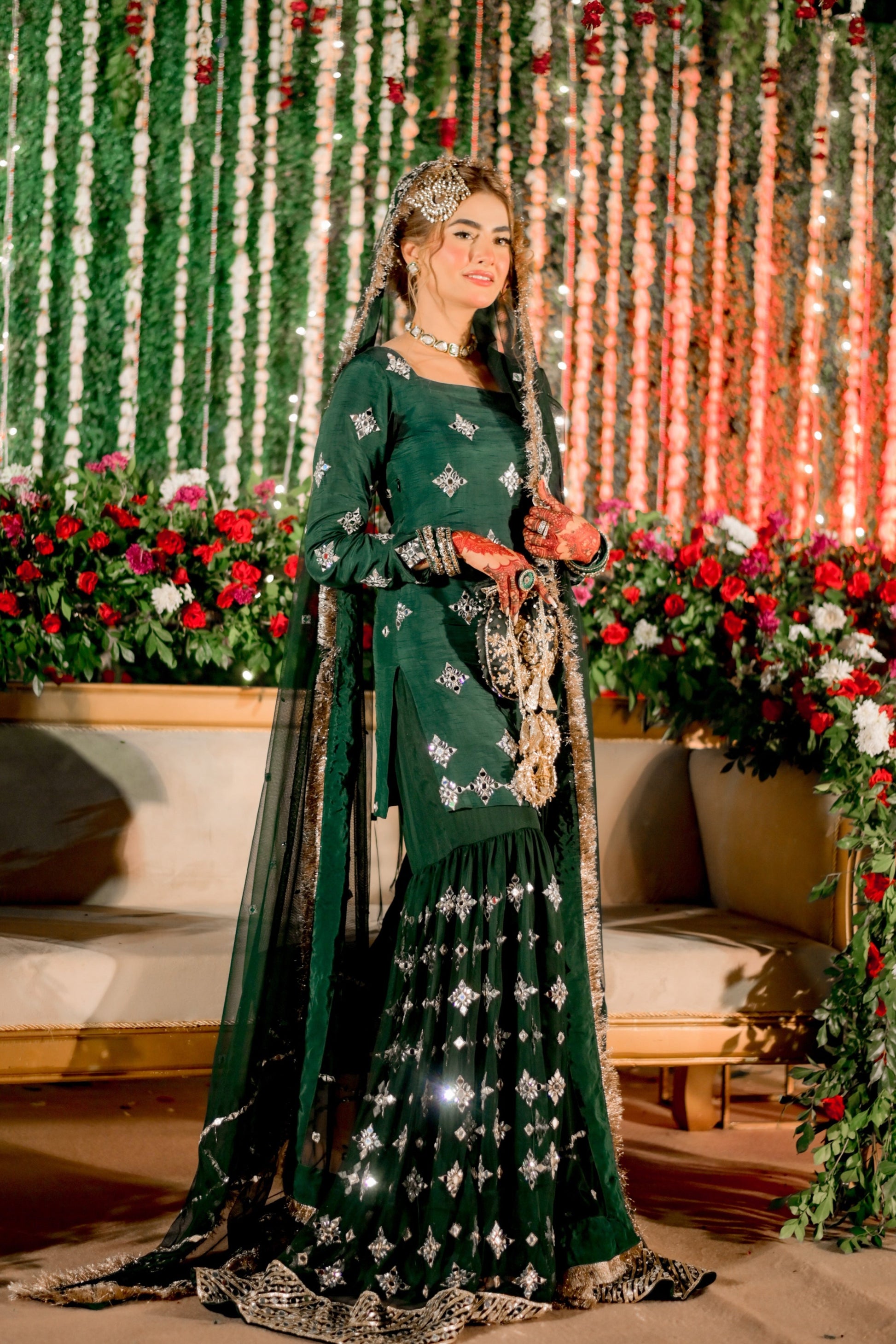 Shahdaab’ The mesmerising green attire. Intricately tilla, kundan and mirror worked grara and shirt, choli paired with net dopta is something you cant miss this wedding season.