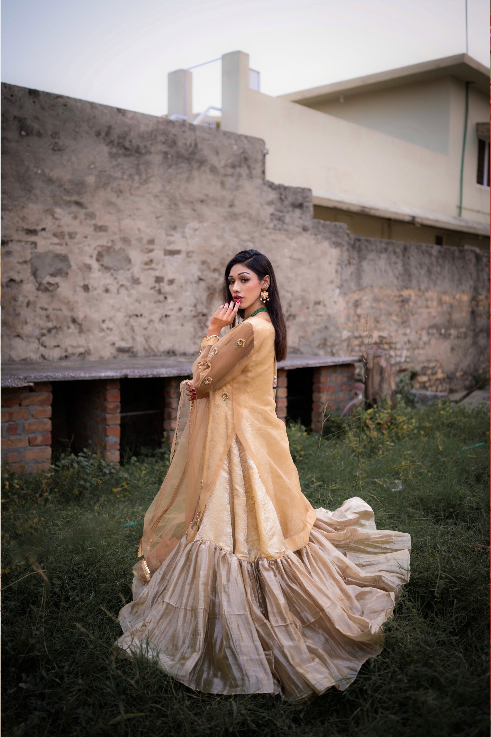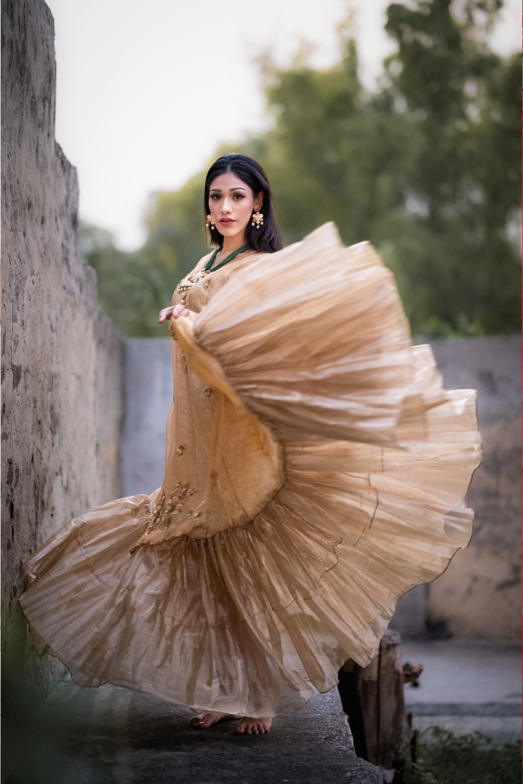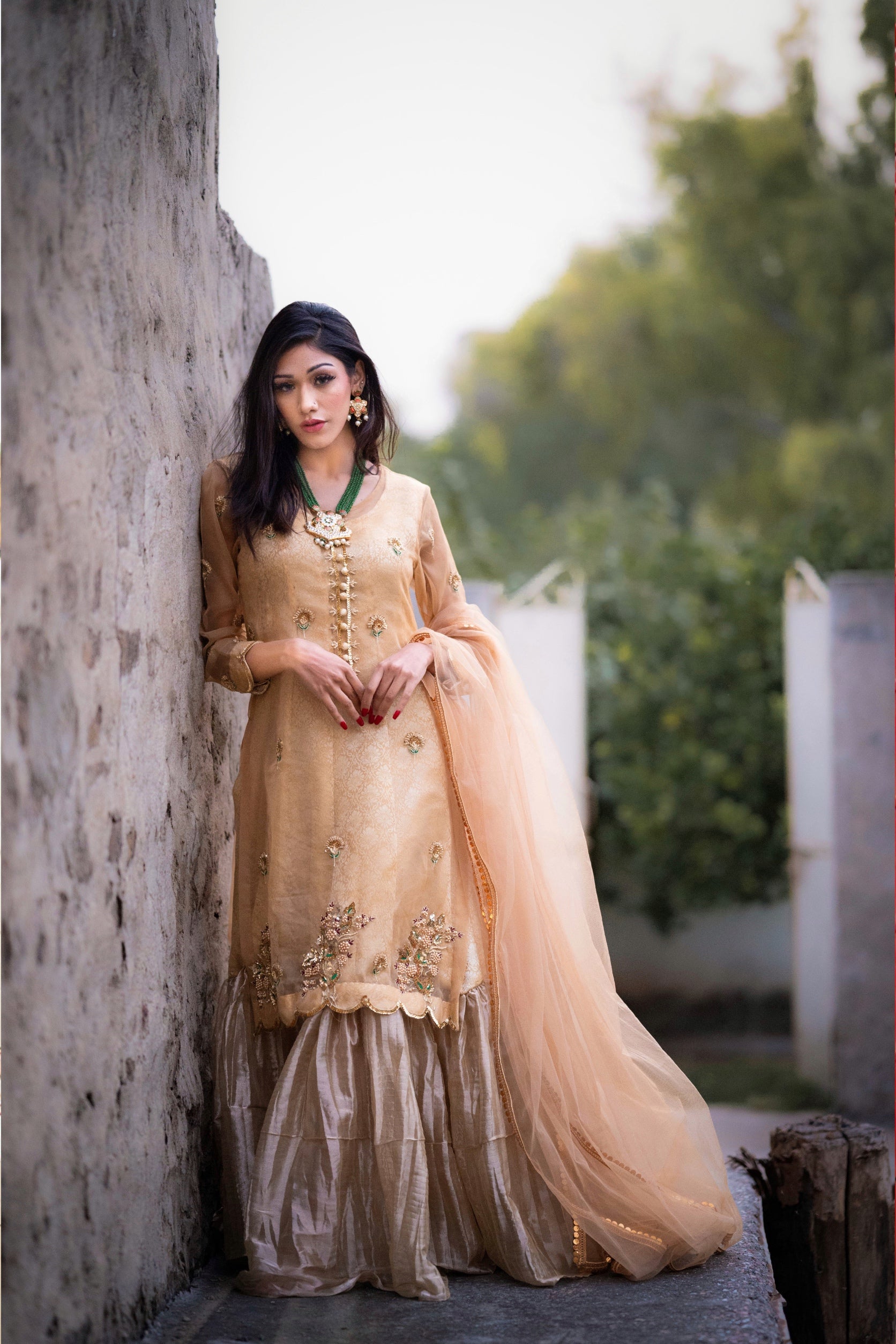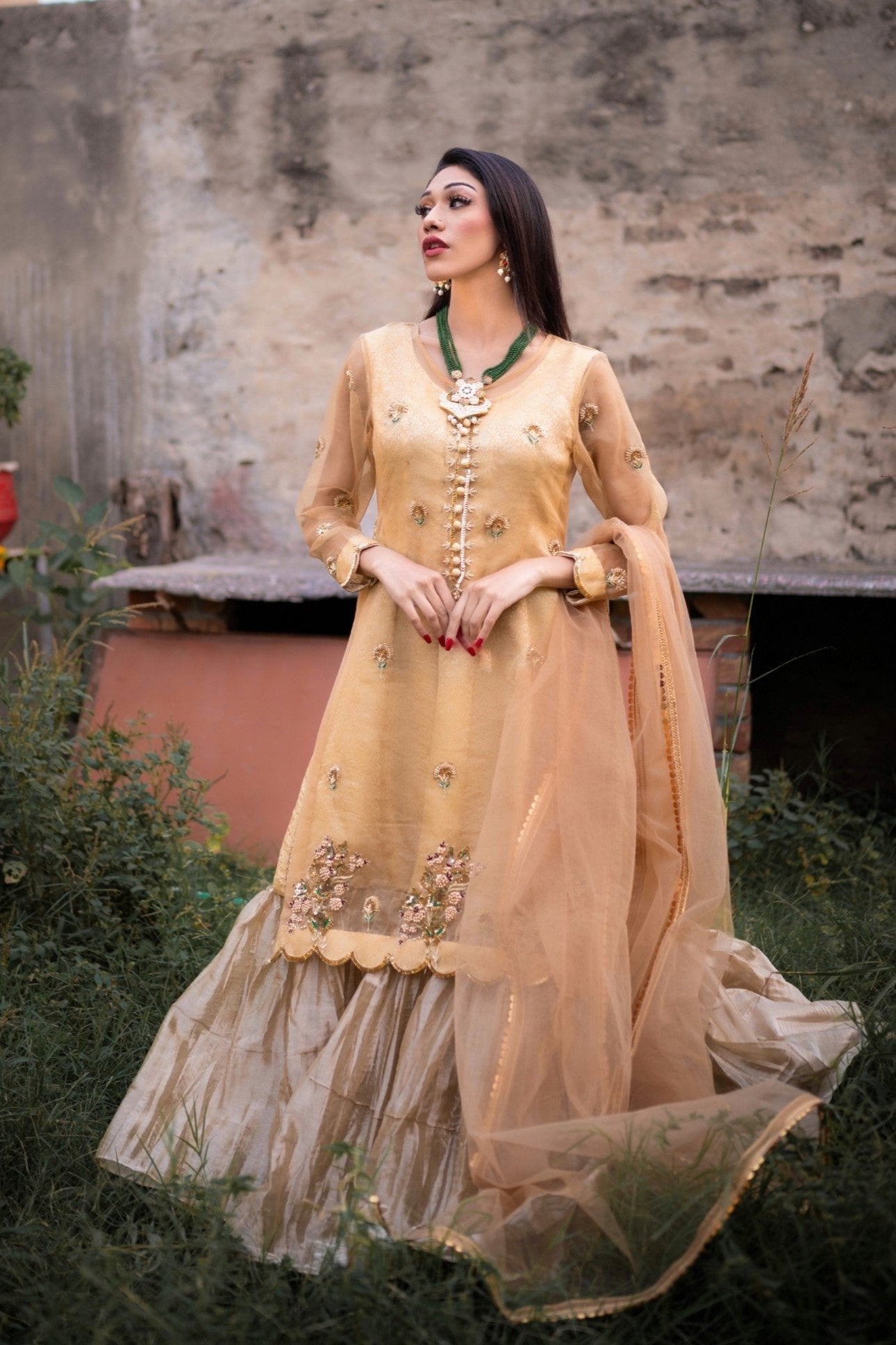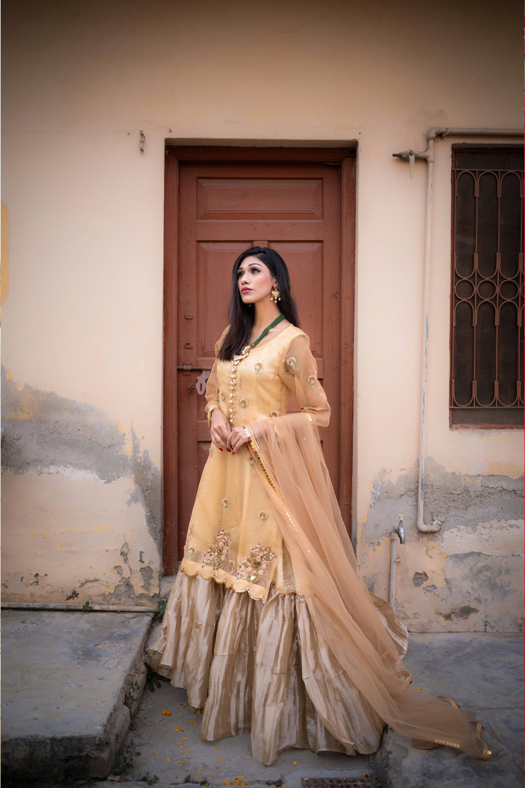 Alluring gold attire is beautifully hand embellished from front and sleeves . paired with the flowy inner Gown and duppata.