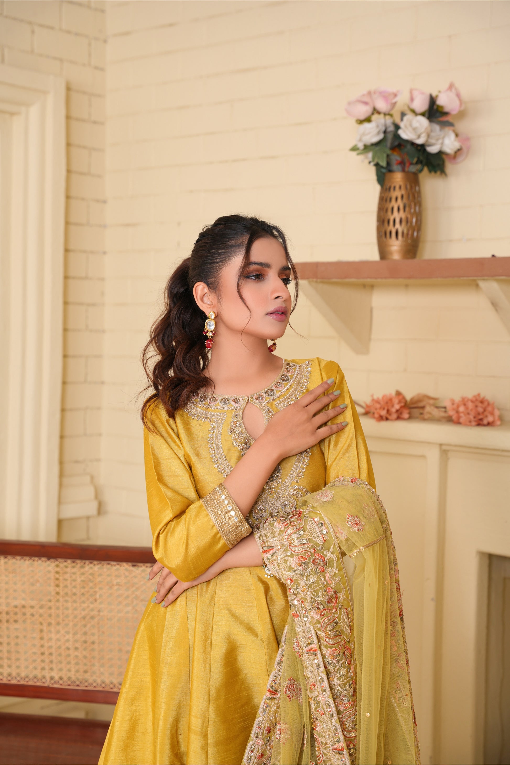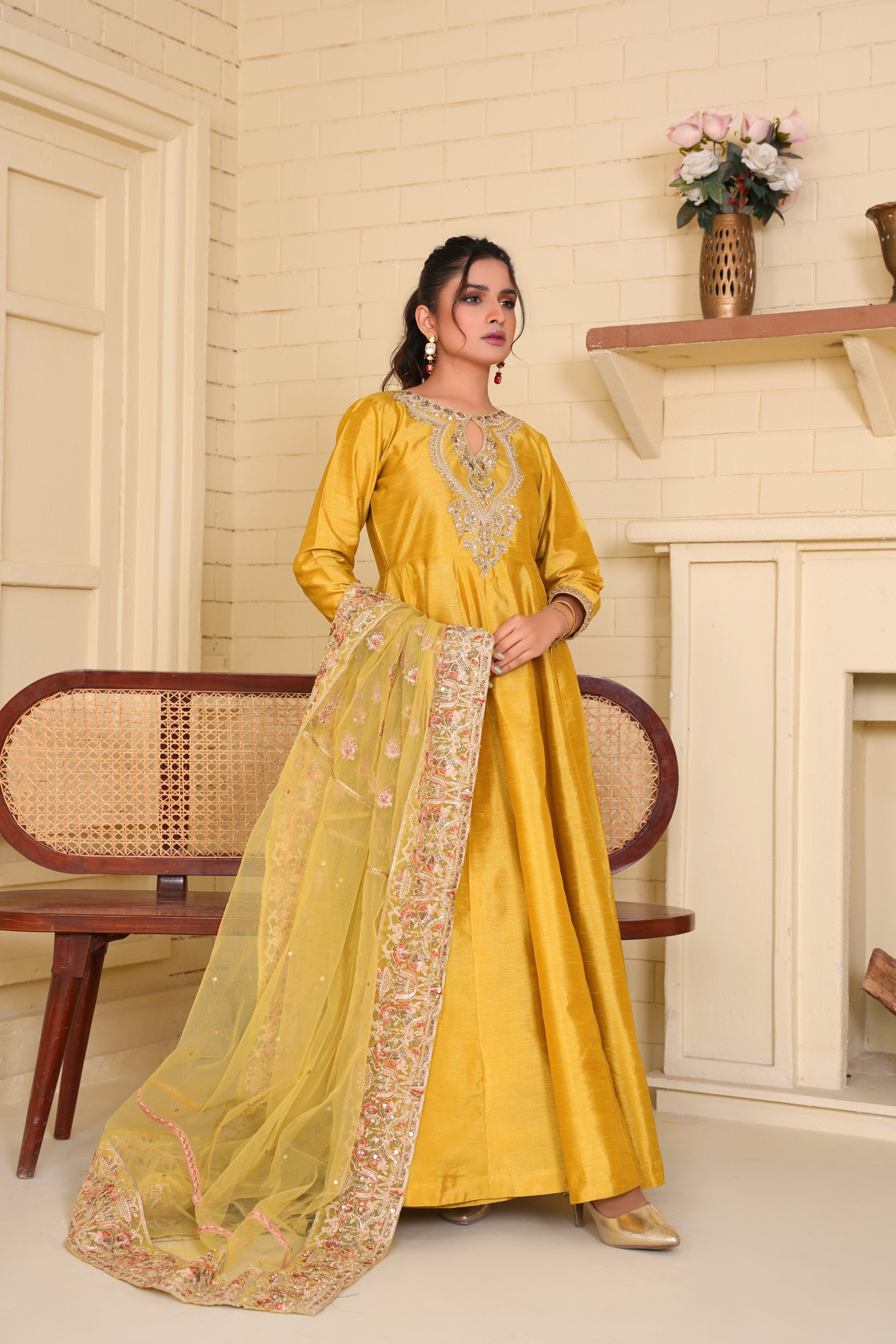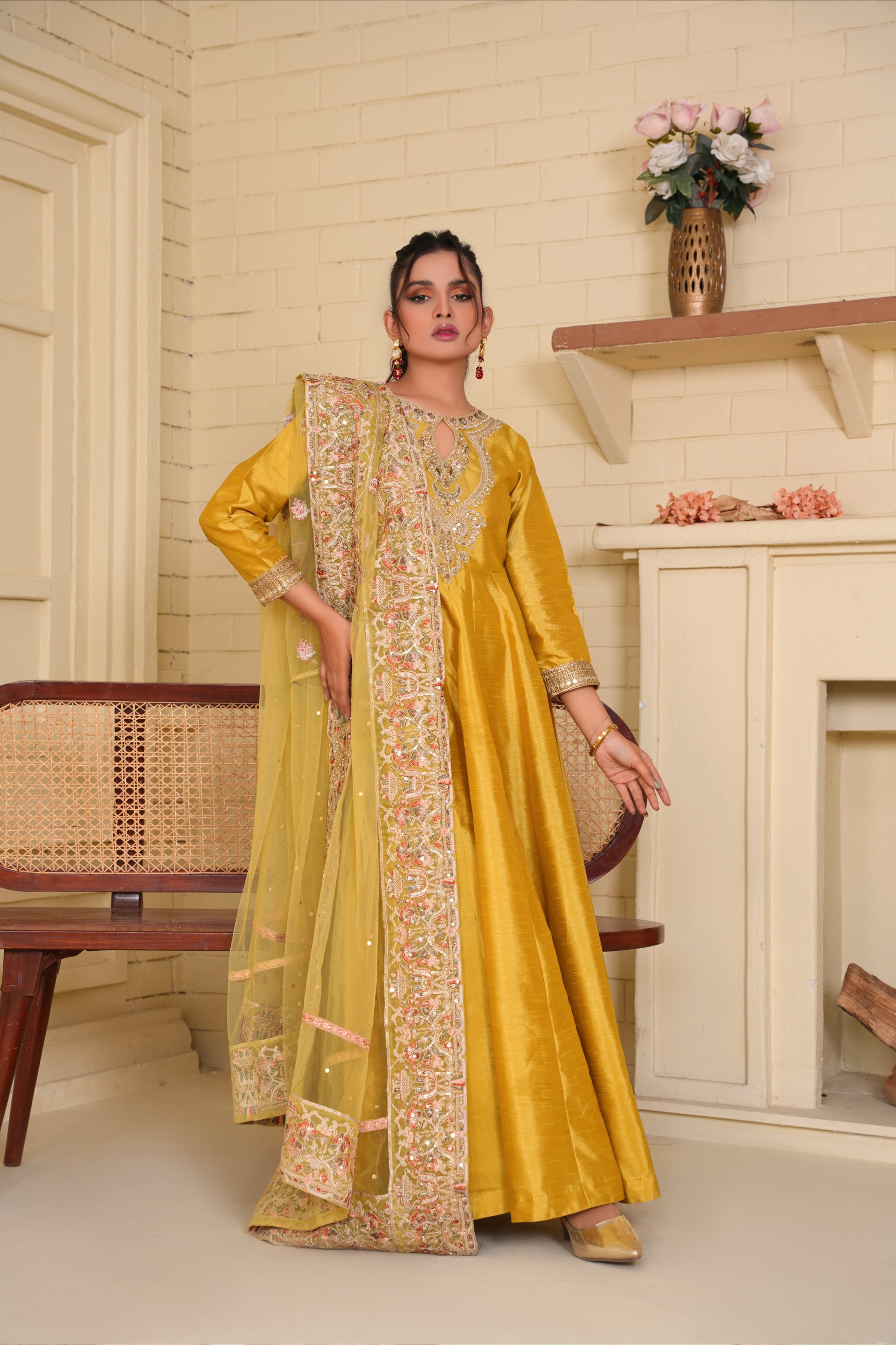 Silah - Our signature Anarkali in apple green canvas intricately embellished neckline and duppta with tilla , sequin, diamonties is perfect pick for the Star of event.