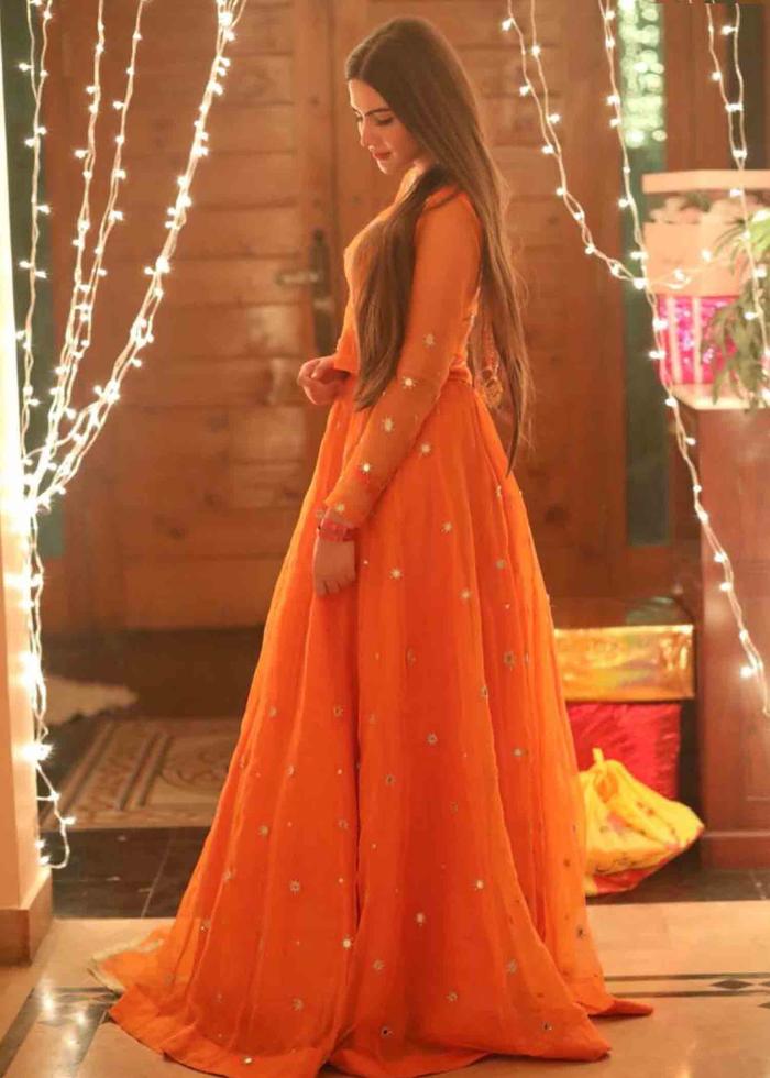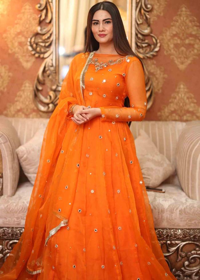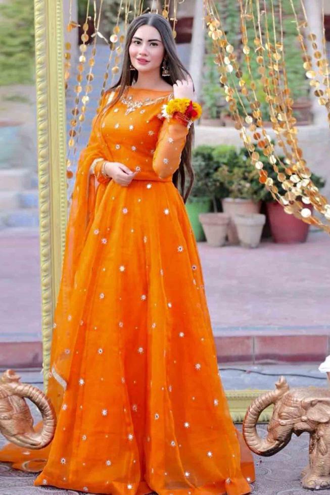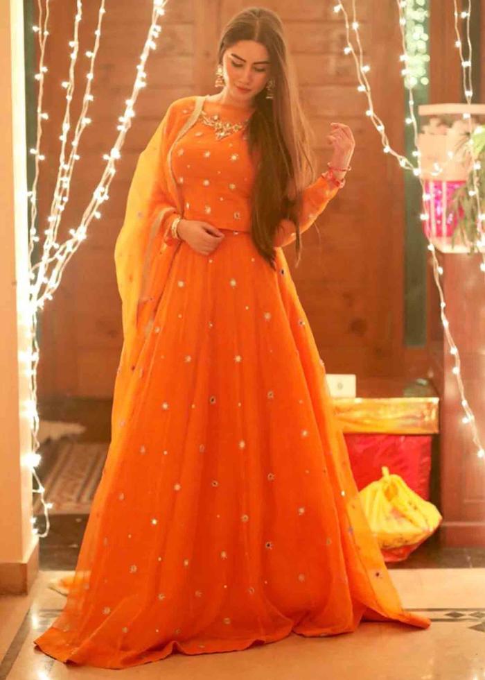 Our Signature formal attire, embellished lehnga choli with miror, kora, dabka, and sequins work. Choli with neckline and mirror spray on it. Lehnga with mirror and sequins spray on it. Dopta embellished with sequins and mirror spray with kiran lais on it. perfect pick to allure your festive look.