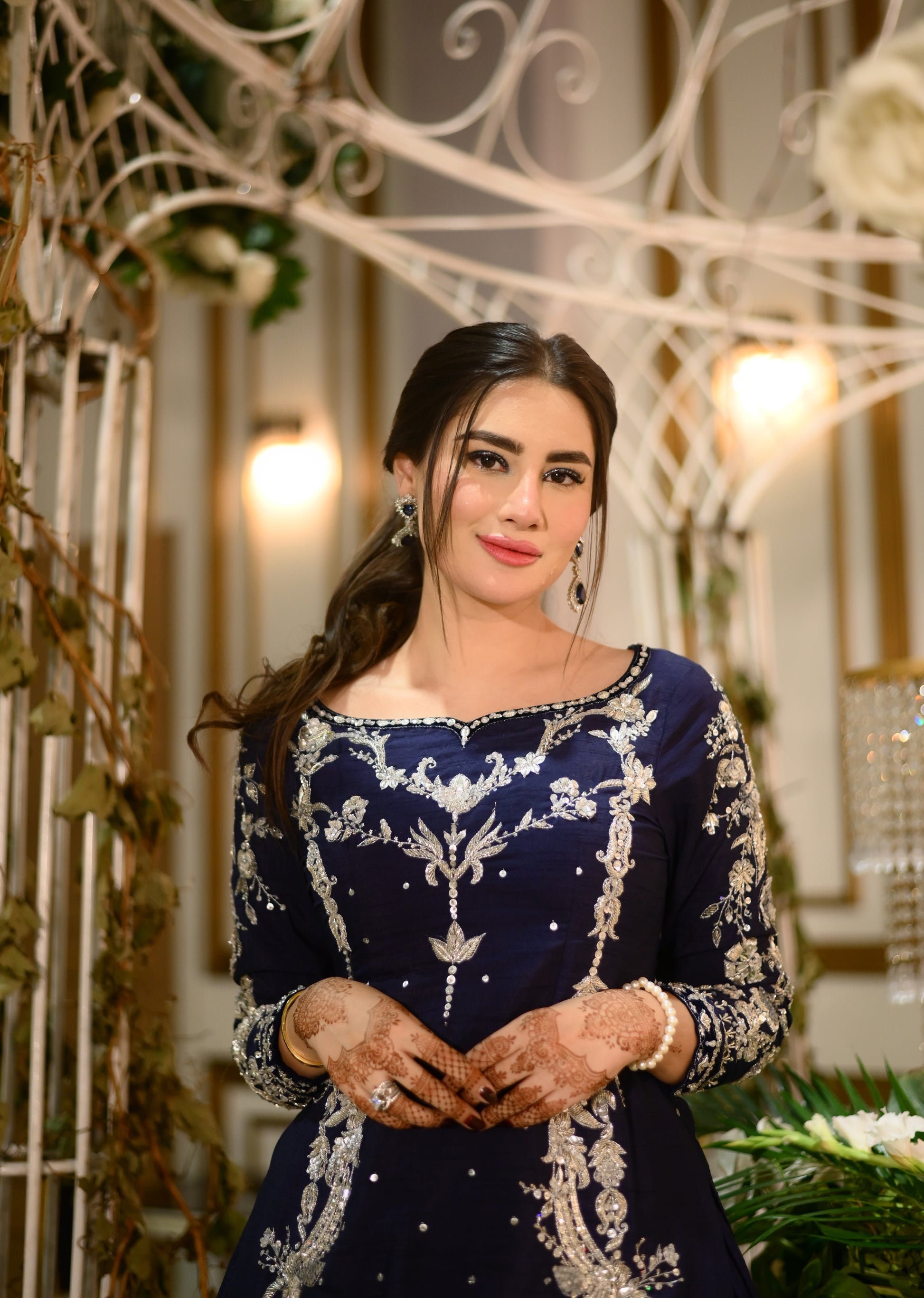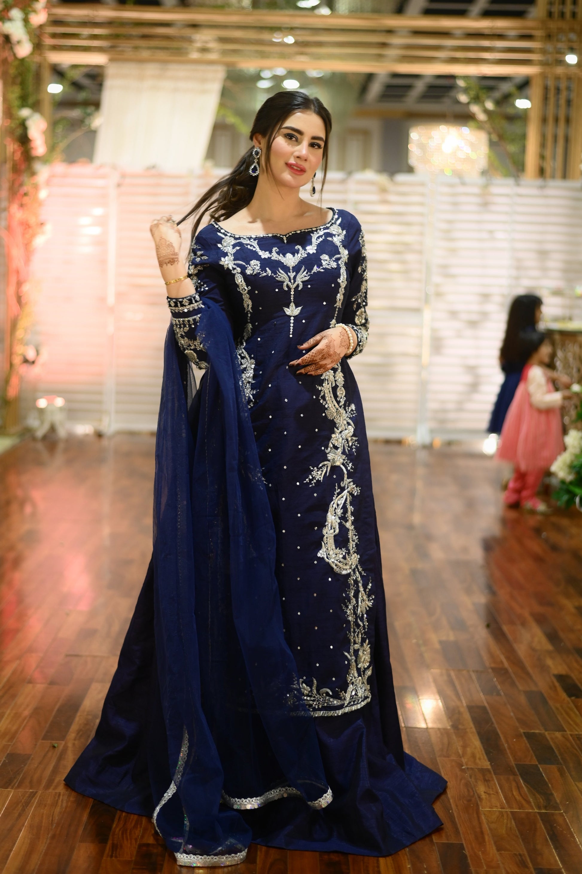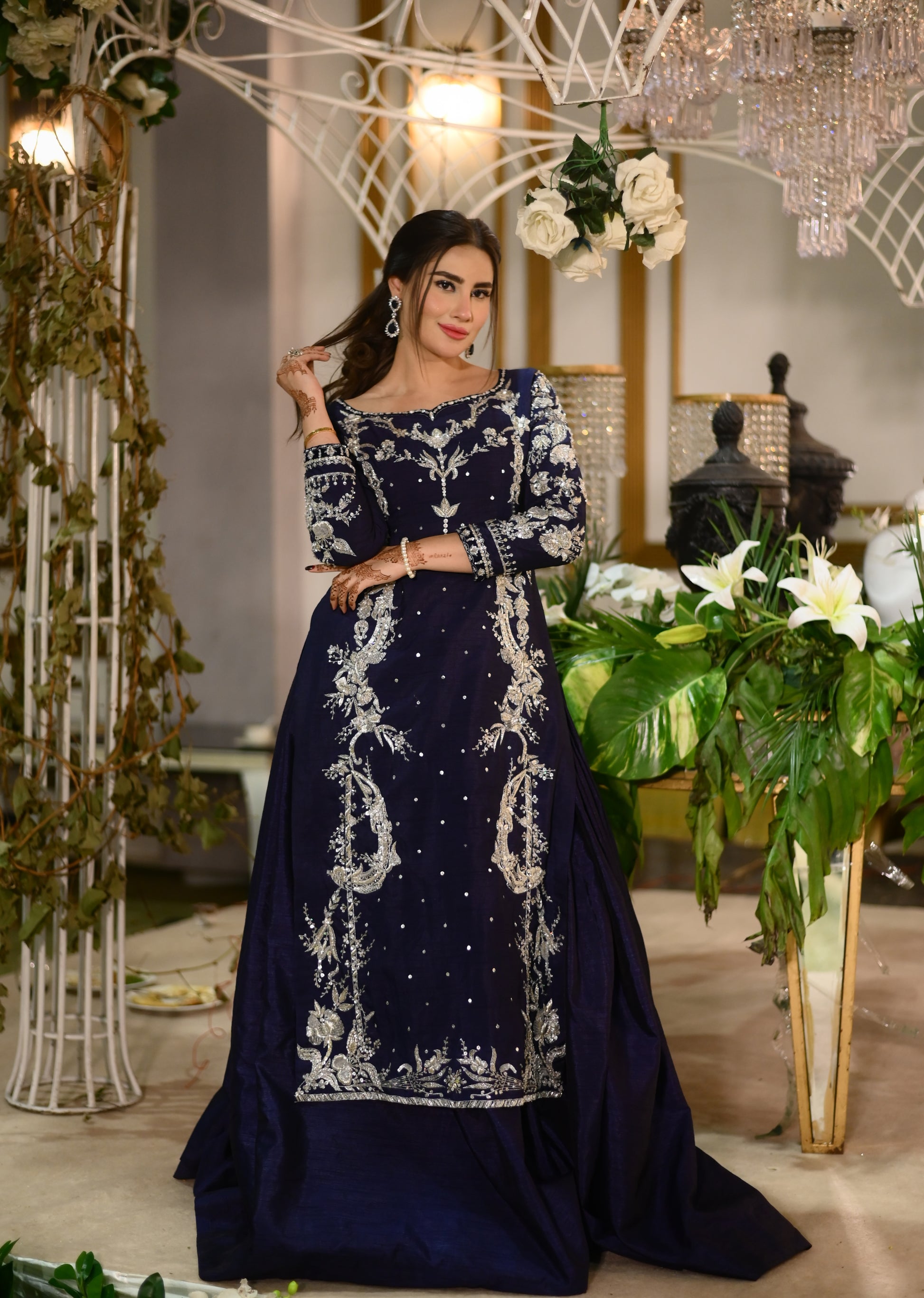 Tehzeeb is very modern Yet traditional silk attire.Shirt is intricately hand crafted with dabka, naqshi, sequins, diamonties and pearls. Classically paired with Plain Lehnga and dupatta.