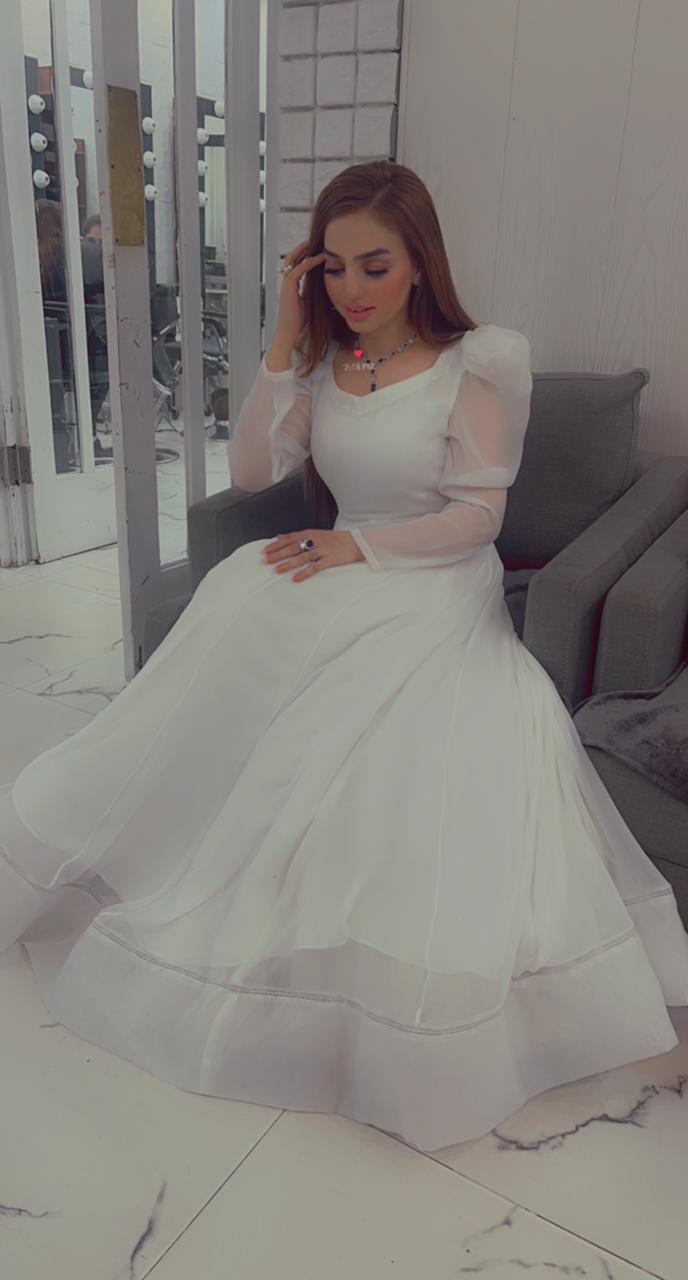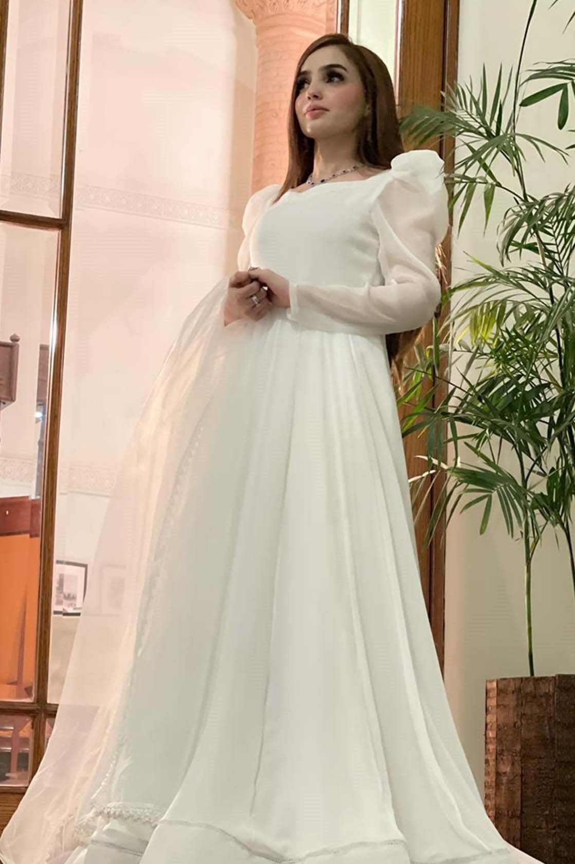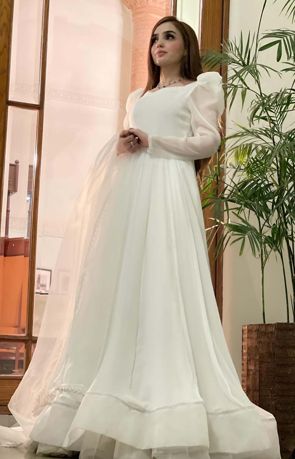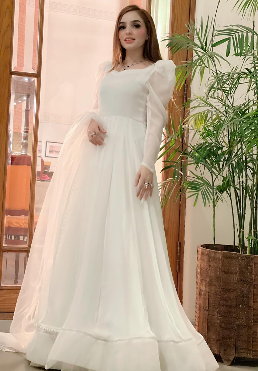 A customized regal white gown showcasing puffy sleeves from the 70's. The simplicity of this outfit makes it mesmerising.