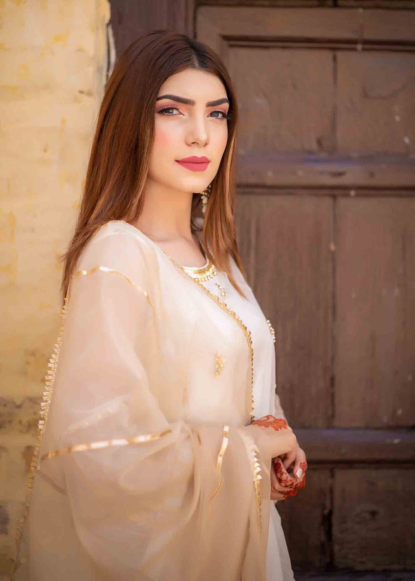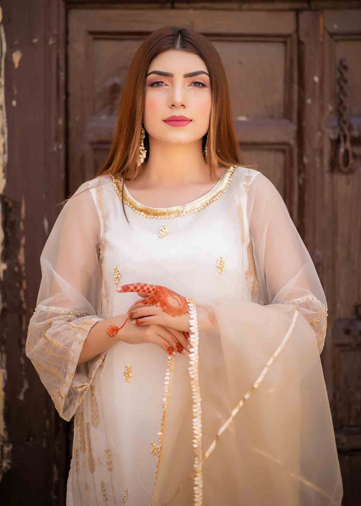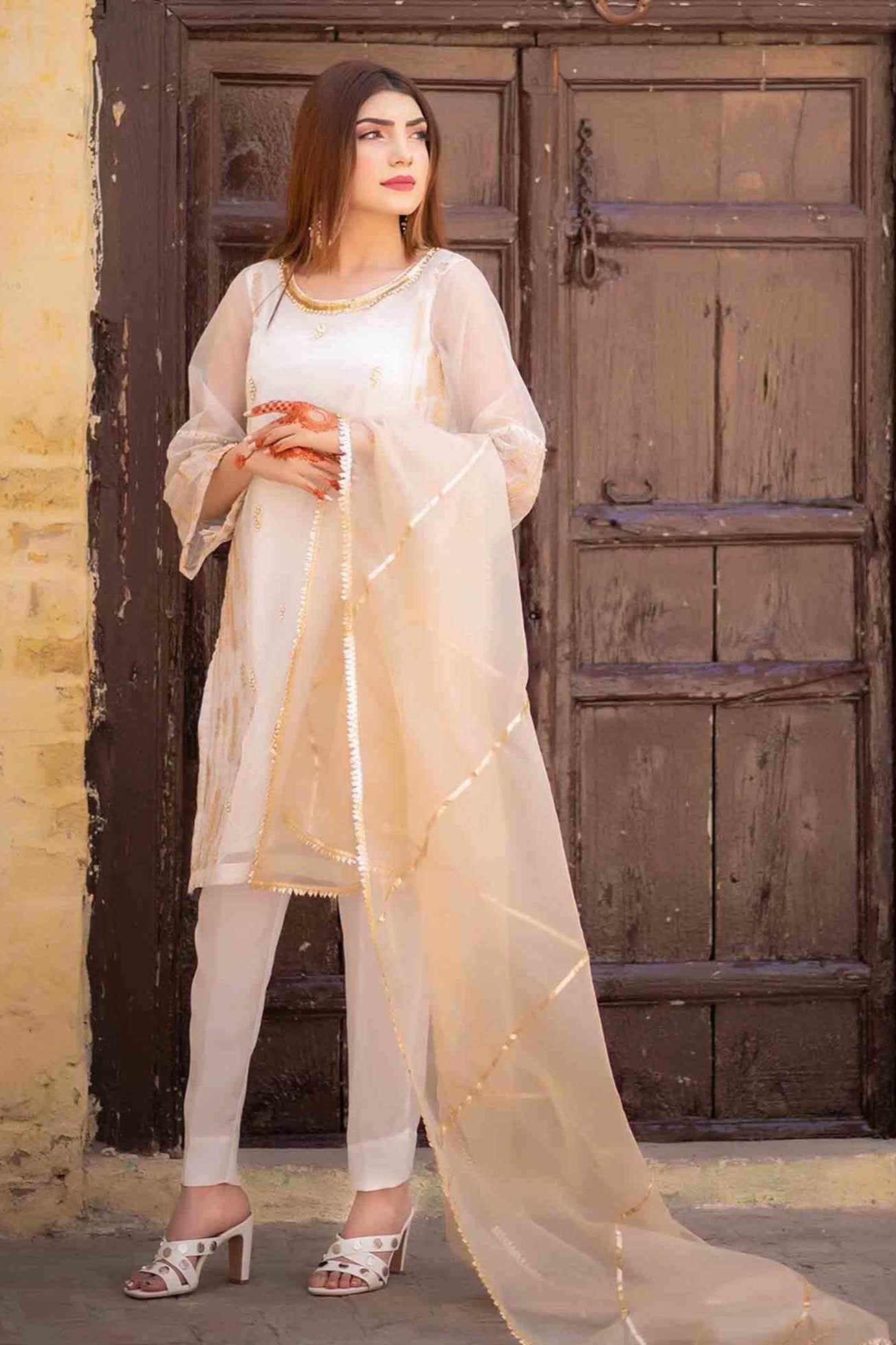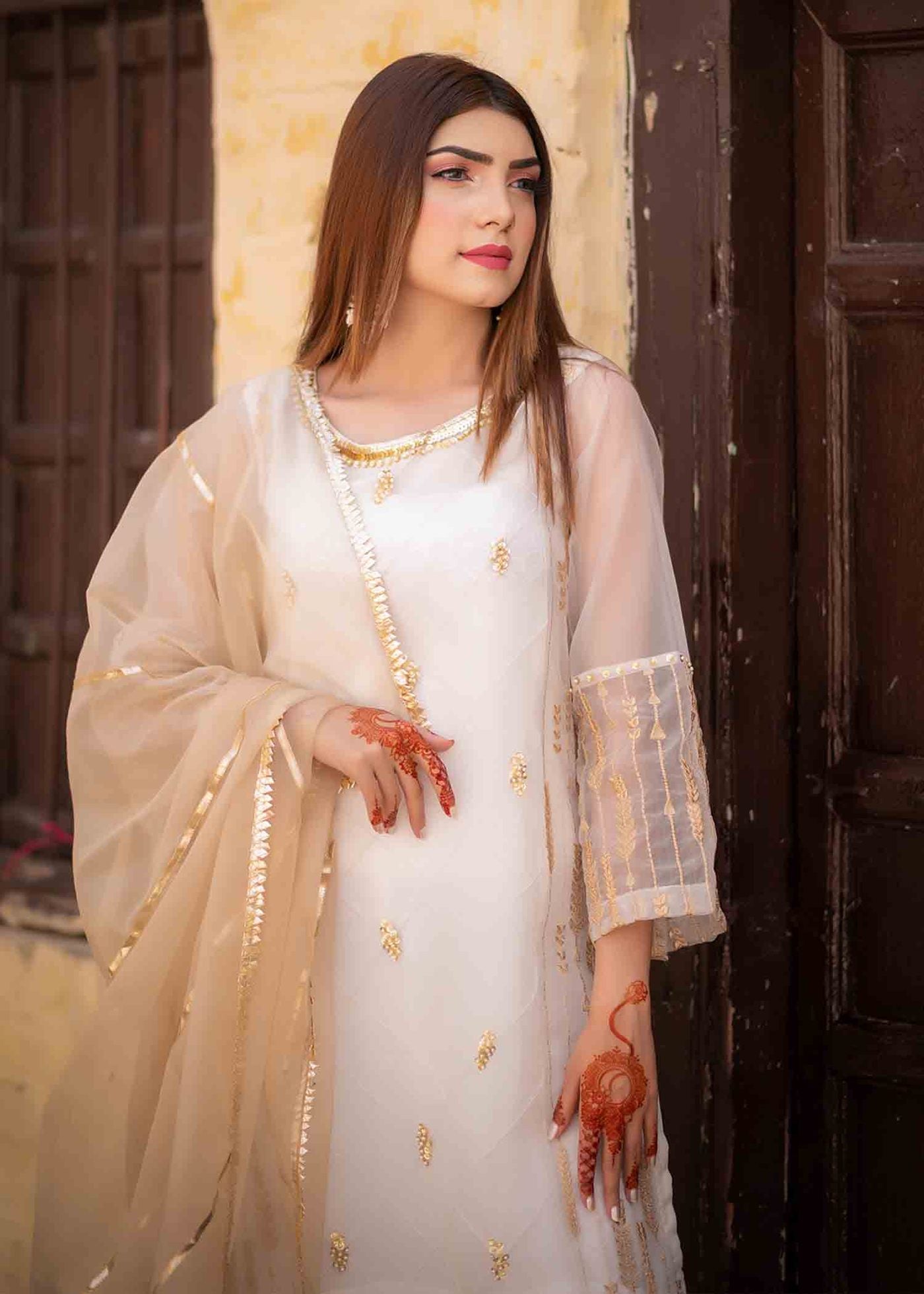This white ensemble ‘Zebaish’ from our collection defête’21 embellished in tilla embriodery with bunch of sequins and pearlspaired with golden dopta with gotta work, is perfect pick for your festive look.